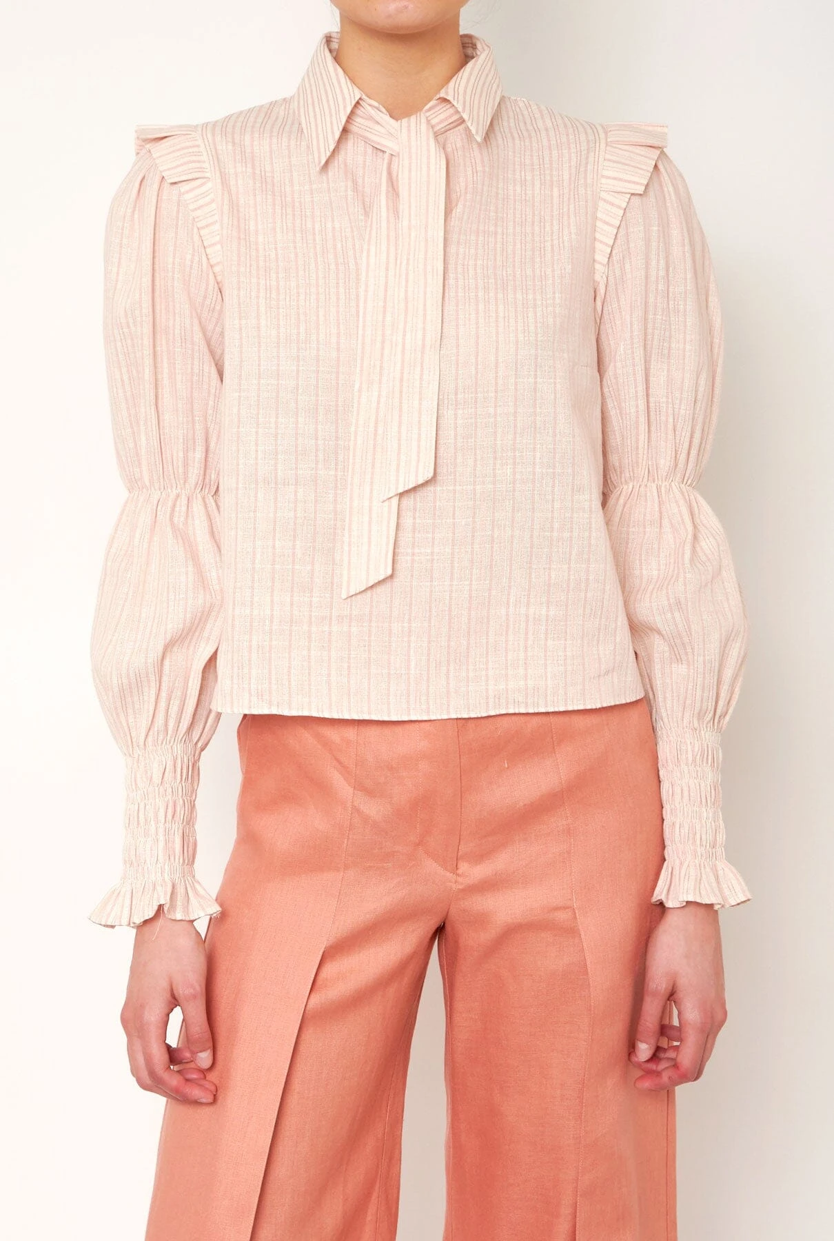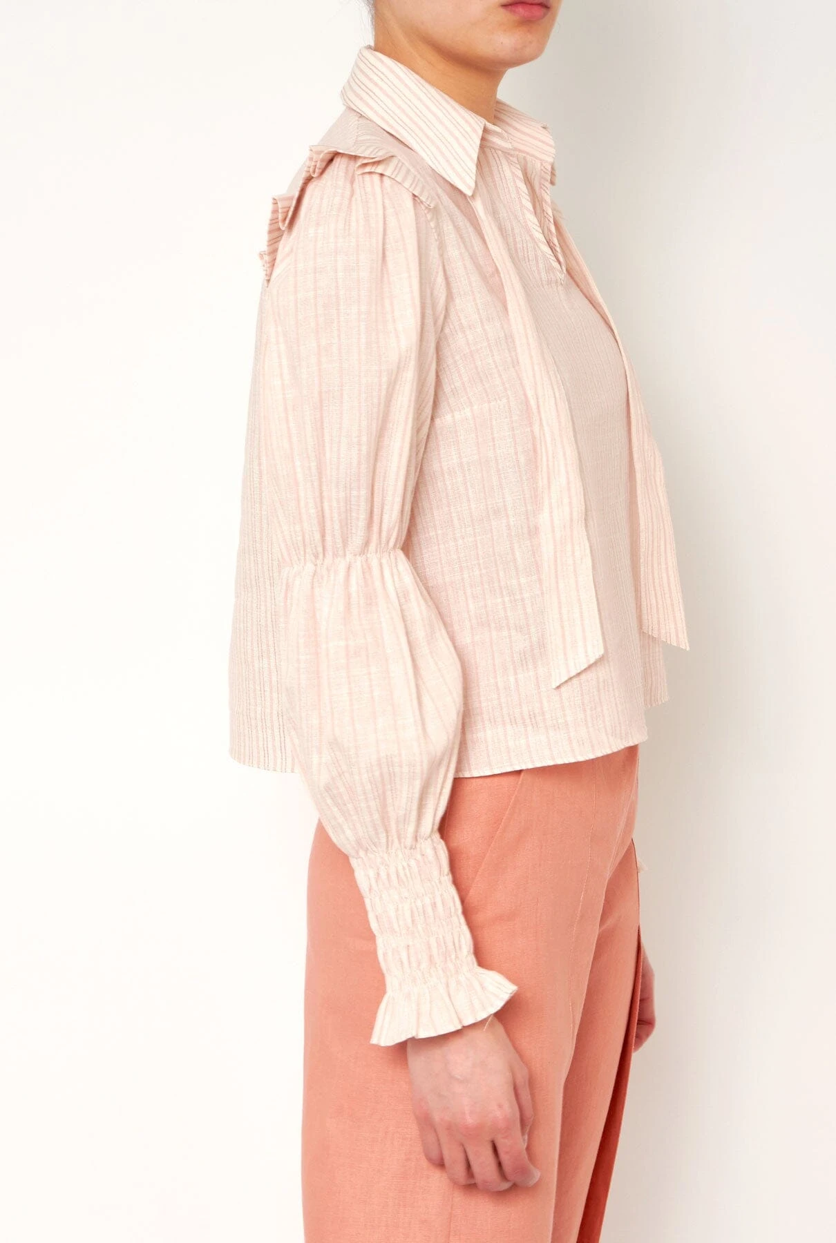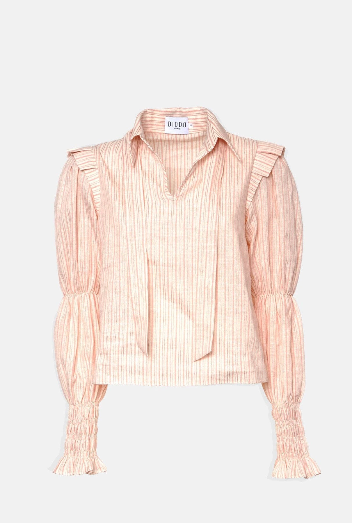 Romantic blouse. The fabric has delicate pink lines over a natural color, fabric with linen. Collar with shirt shape and detachable bow. Can be worn with the collar open when the bow is removed. Slightly puffed sleeves with ruffle detail at the top and gathered at the cuff.