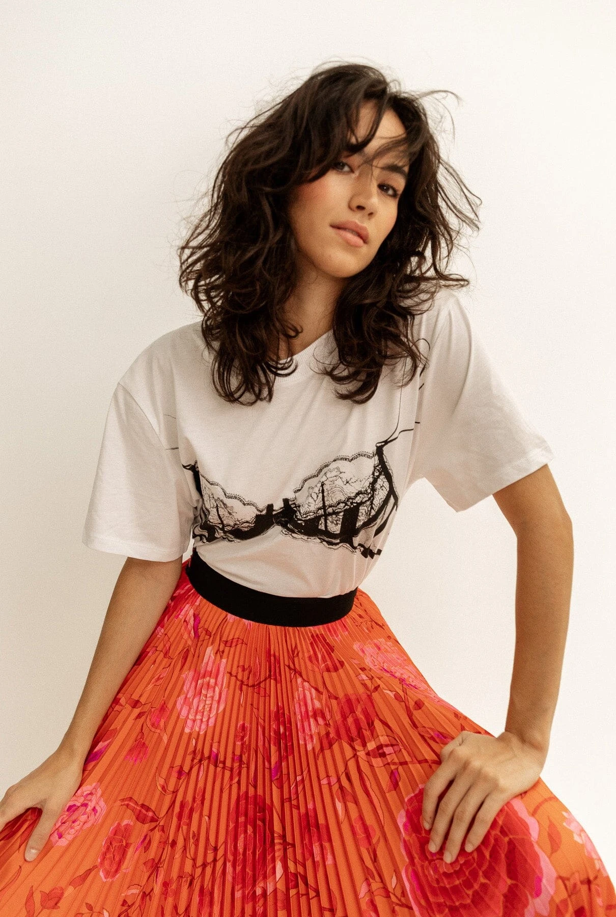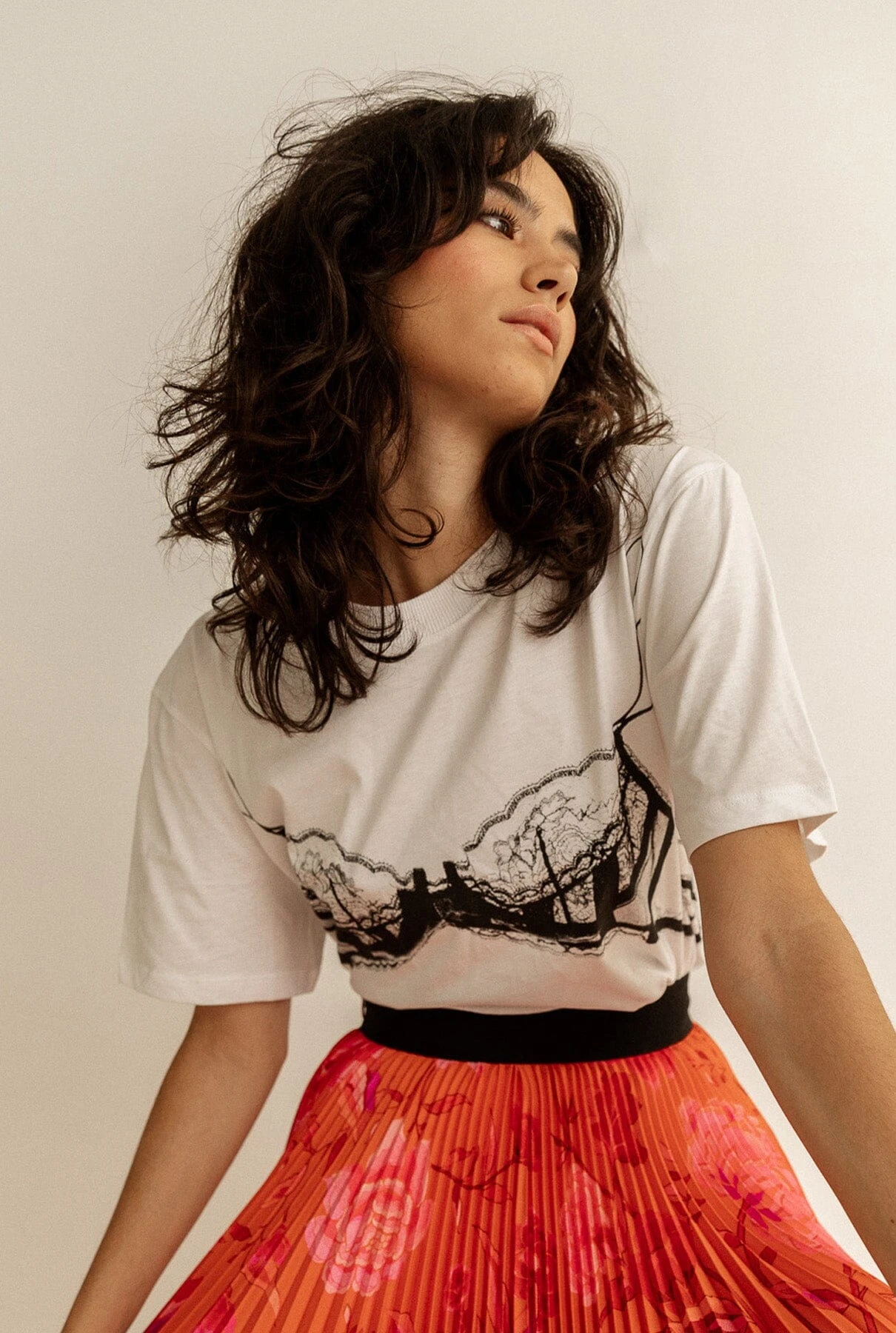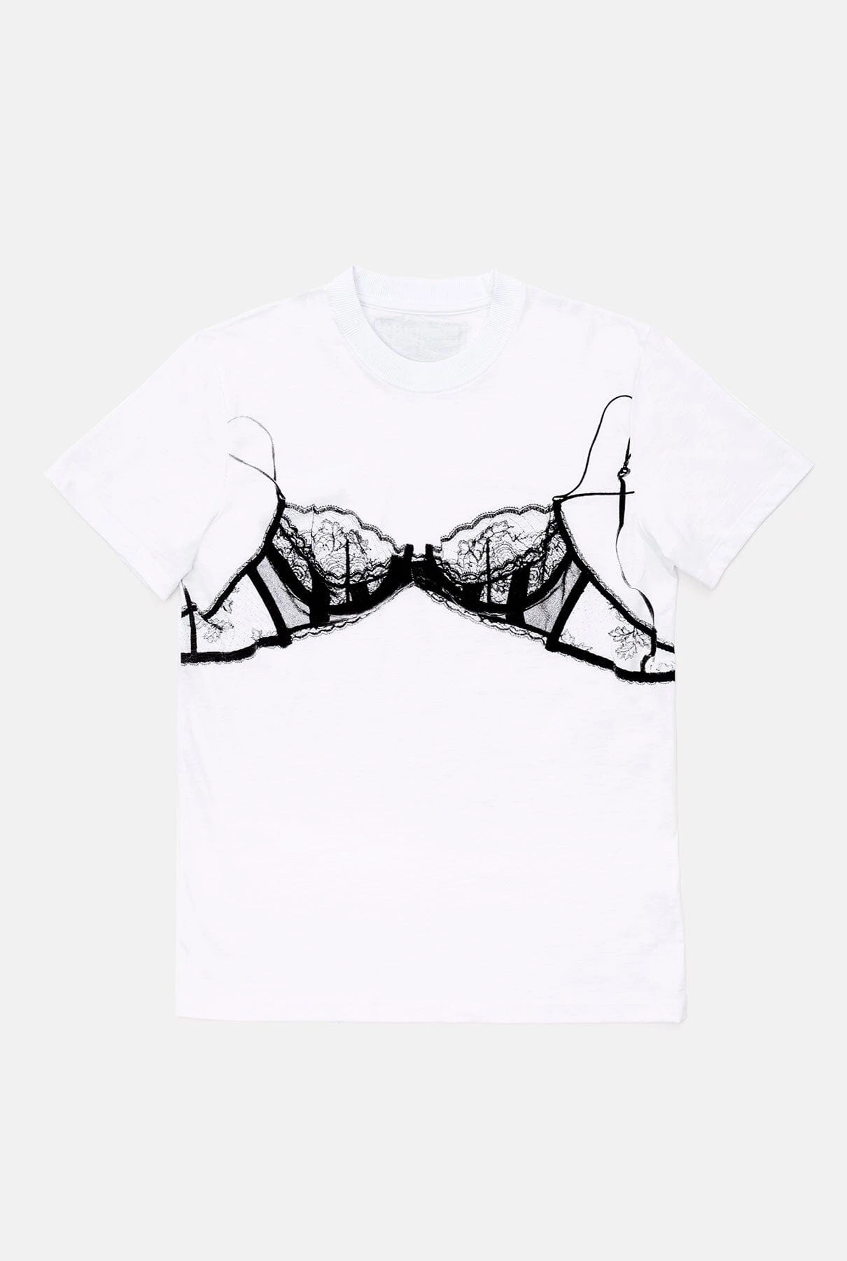 SHORT-SLEEVED T-SHIRT IN ORGANIC COTTON WITH TROMPE-L’ŒIL BRA MOTIF AT CHEST LEVEL. REISSUE OF THE LULU T-SHIRT, AUTUMN/WINTER 2019 COLLECTION. UNDER THE SLOGAN «INTIMACY BECOMES PUBLIC». Designed by Juan Vidal.