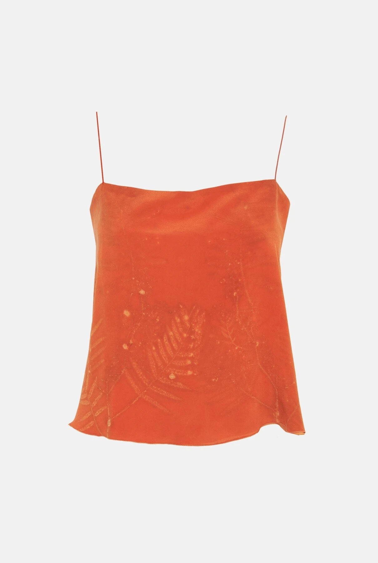 Silk crepe top with thin elastic straps. Ecoprinted with fake pepper leaves.
