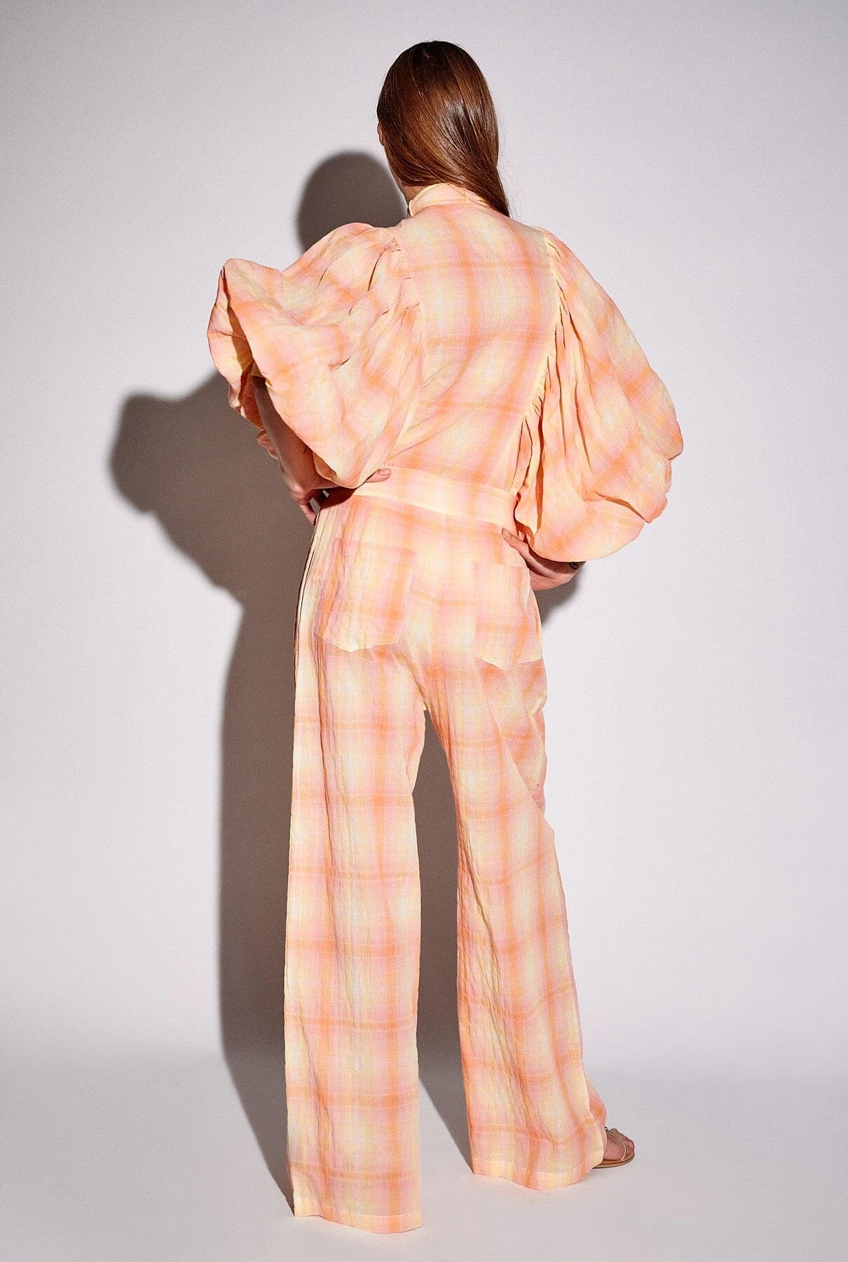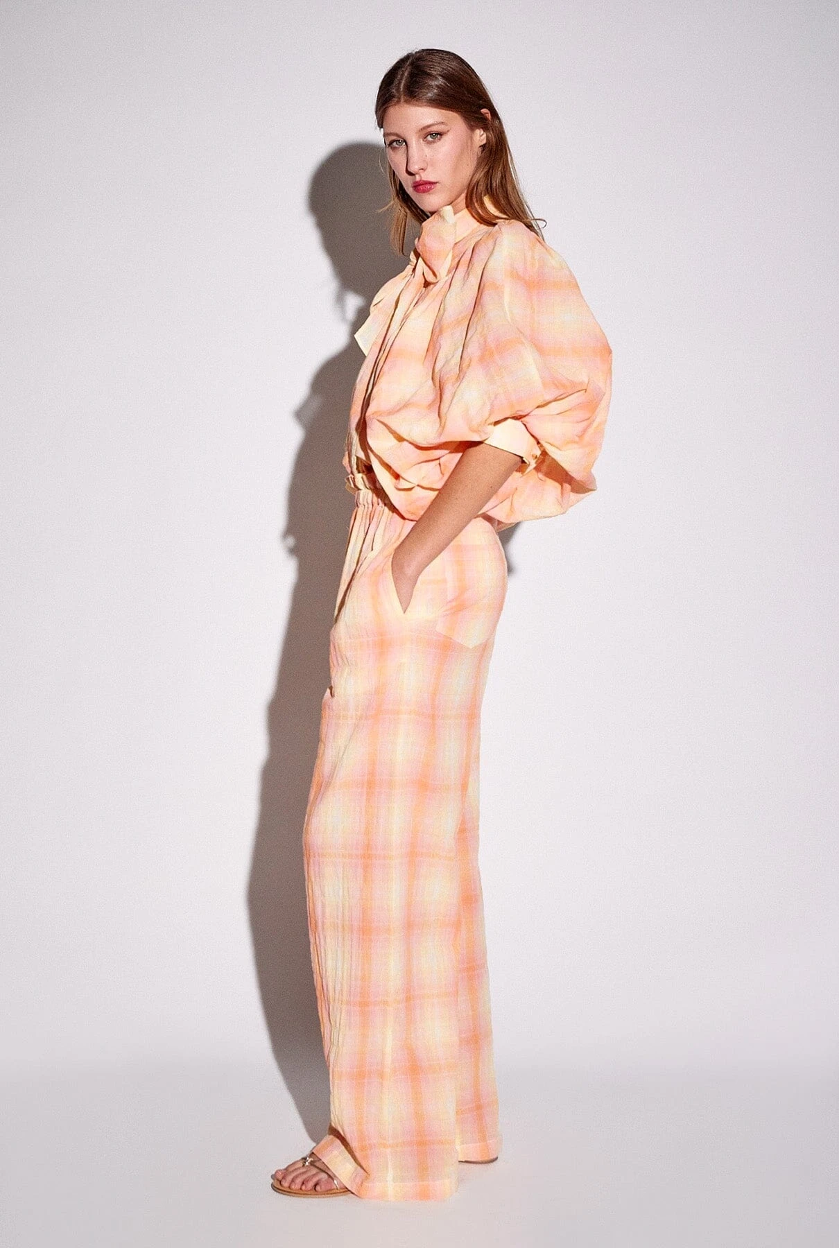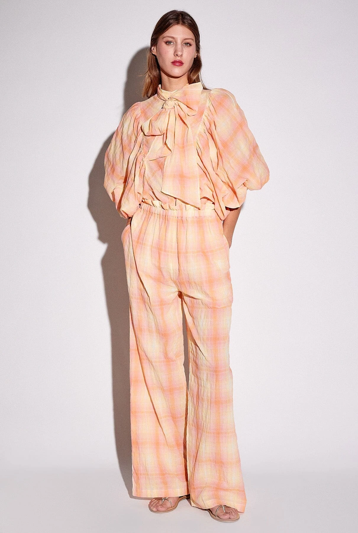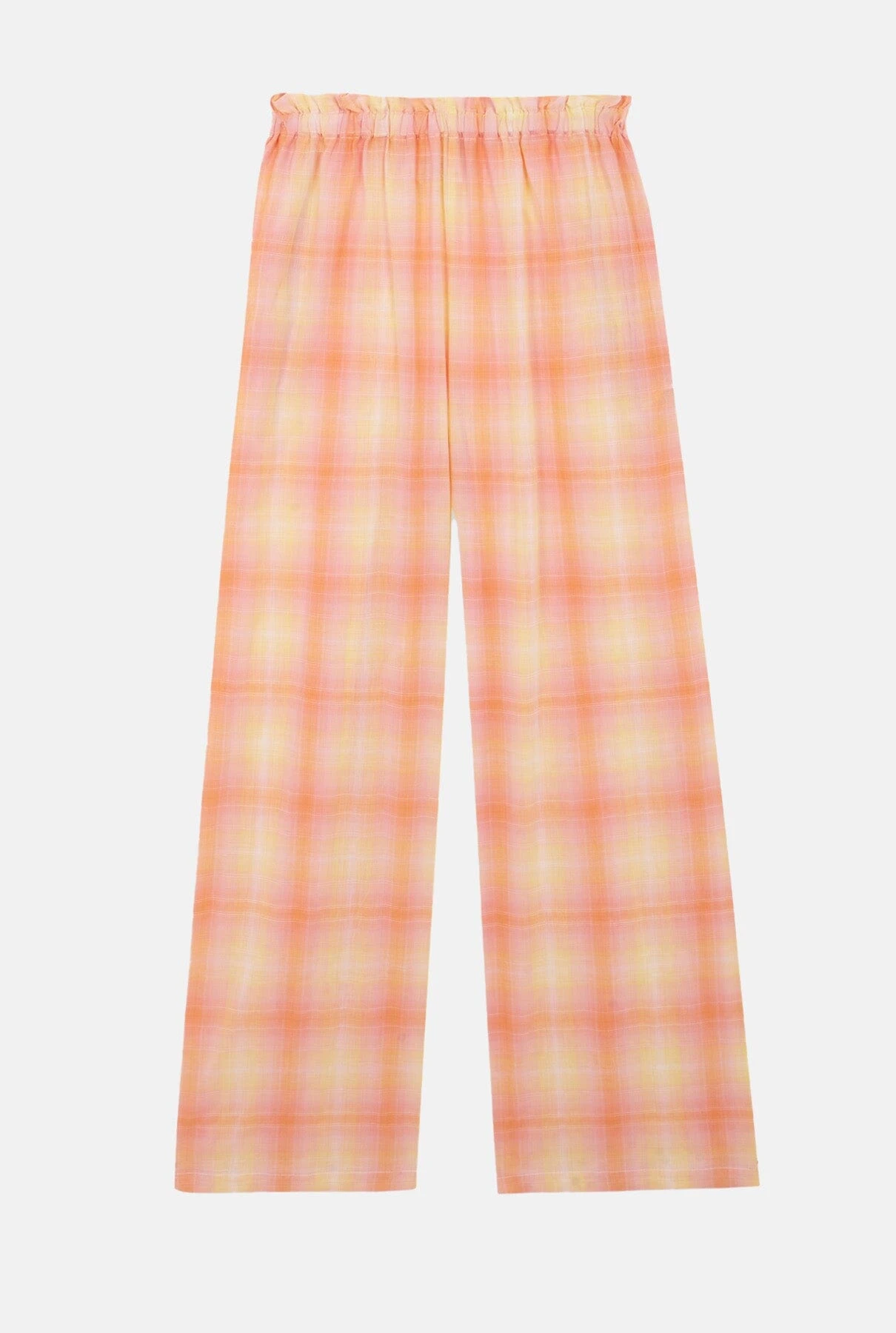 These long wide pants with elastic waistband come in a bright checkered lightweight fabric. A fresh and summerish piece to match with the Maeva Blouse for a total look.