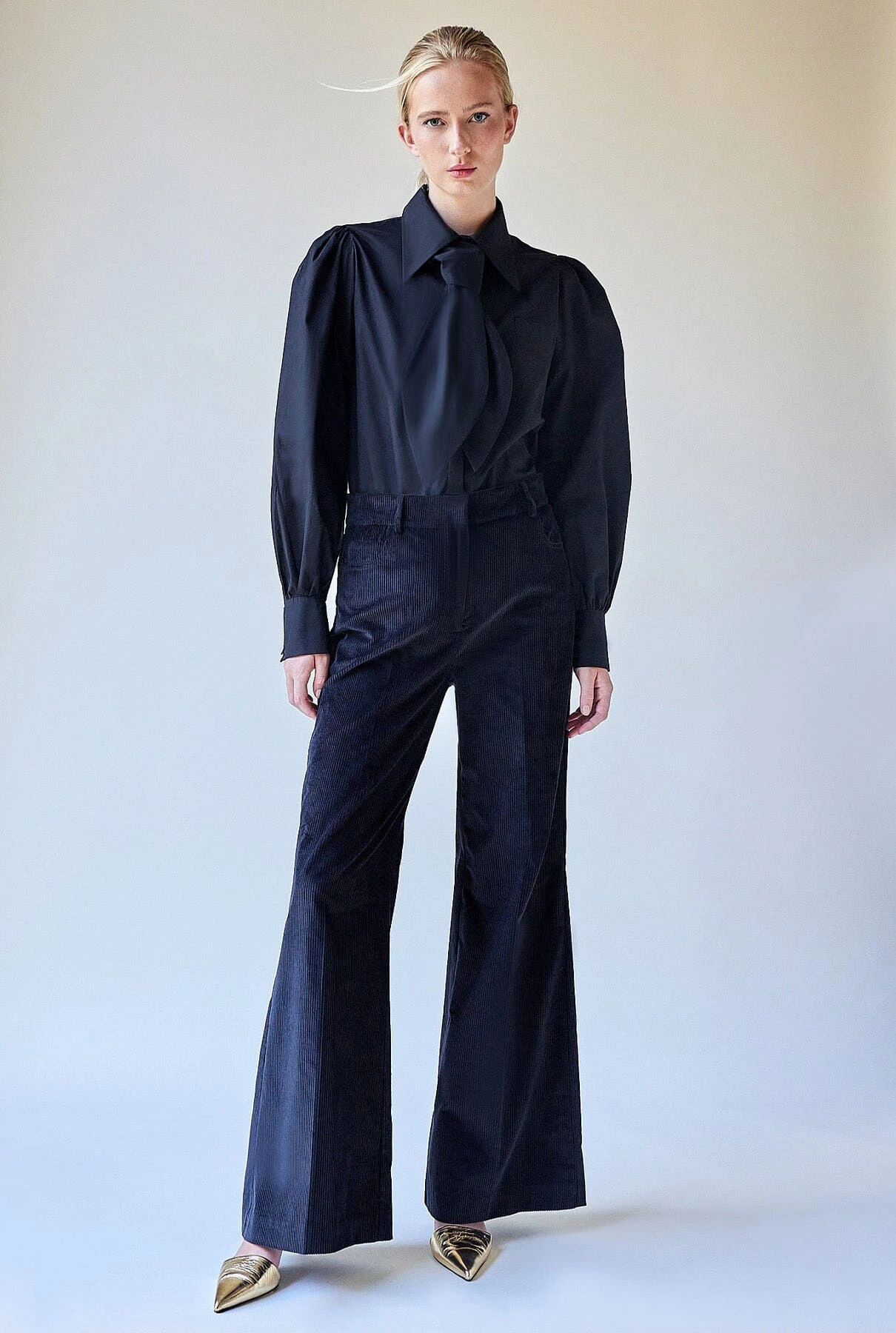 This elegant must-have black shirt comes with puffed sleeves and carefully gathered shoulders. It also features a matching tie so you can play around with it as you feel. Versatility at its best!