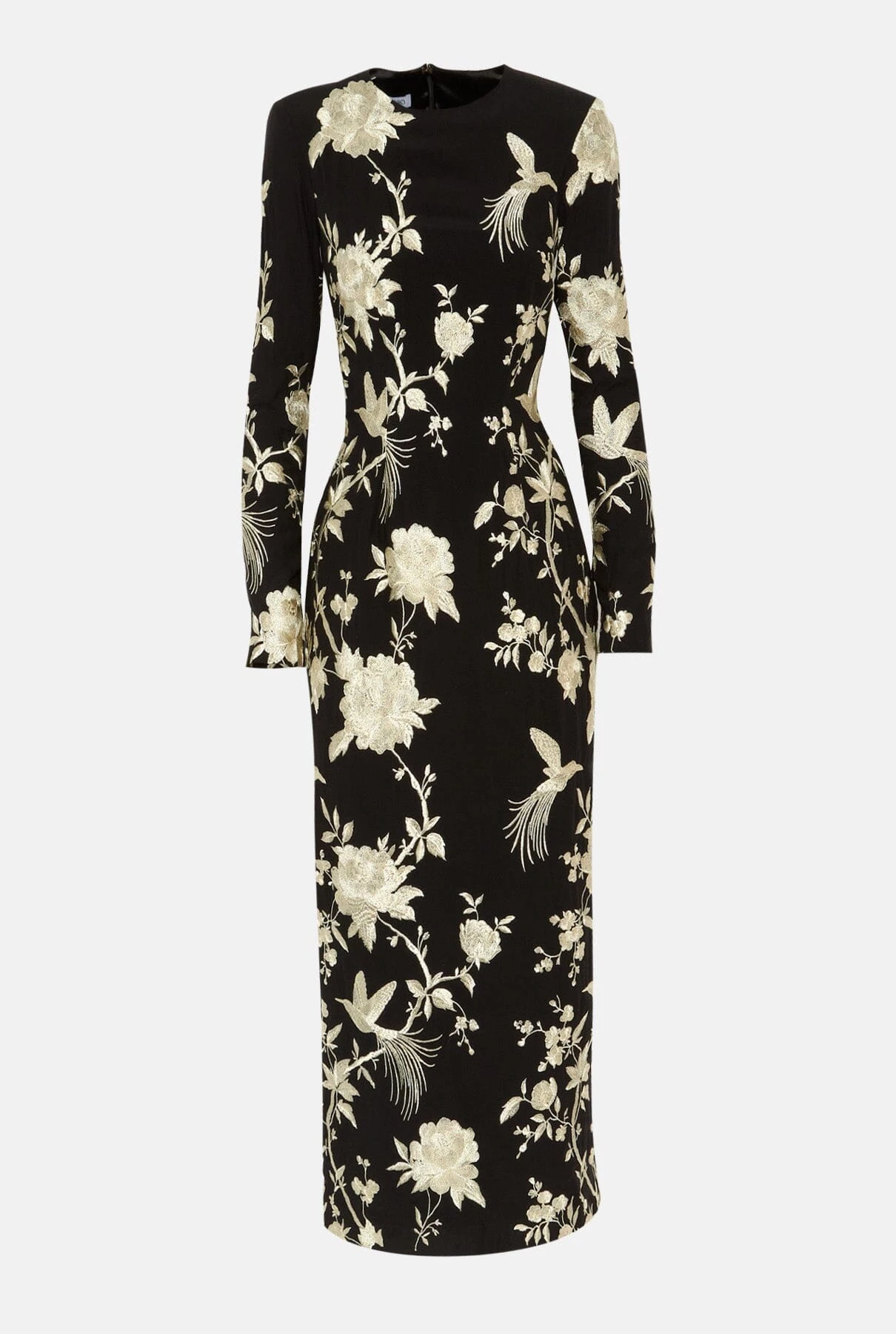 Dress with embroidered flowers and birds. Long sleeves, round neck and lengthn cut at the ankle. Zip at the back and lining. Available in two colours. Made in Spain.
