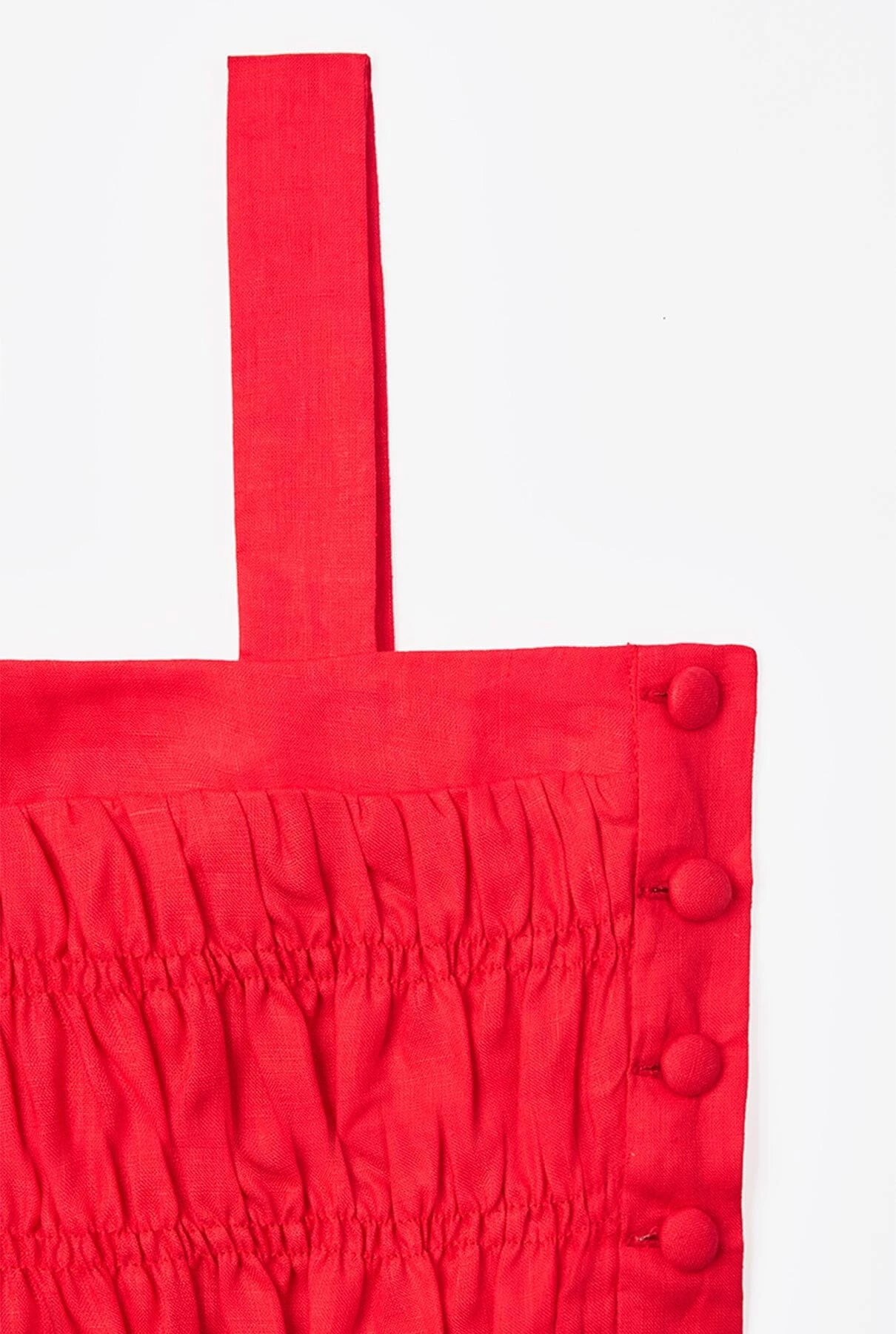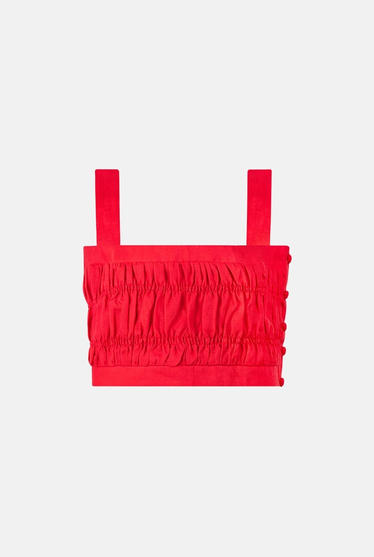 Crop top with gathering detail made of red natural linen, thick and straigh straps. Closed in the side with 5 summarys. It has a organic cotton lining inside.