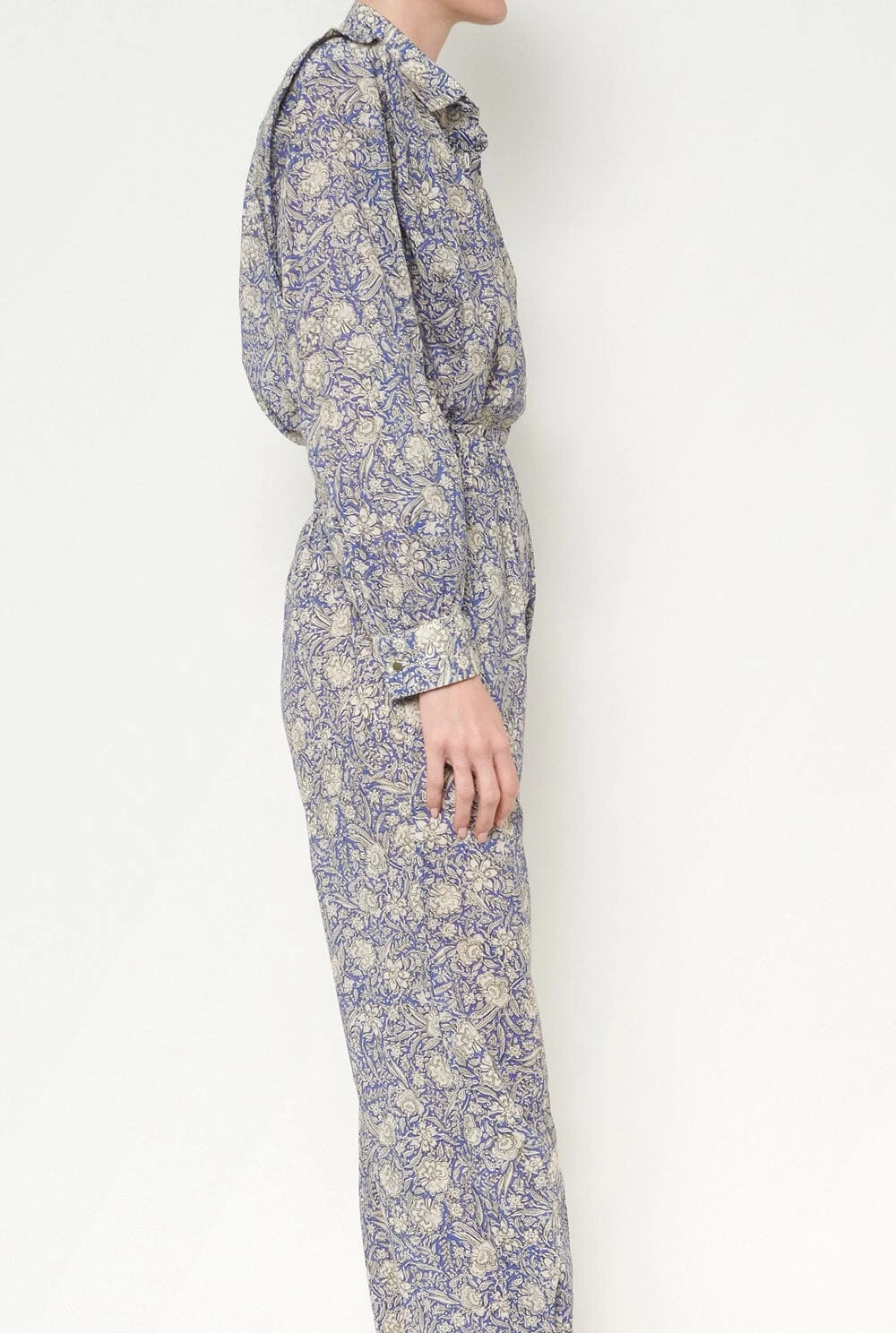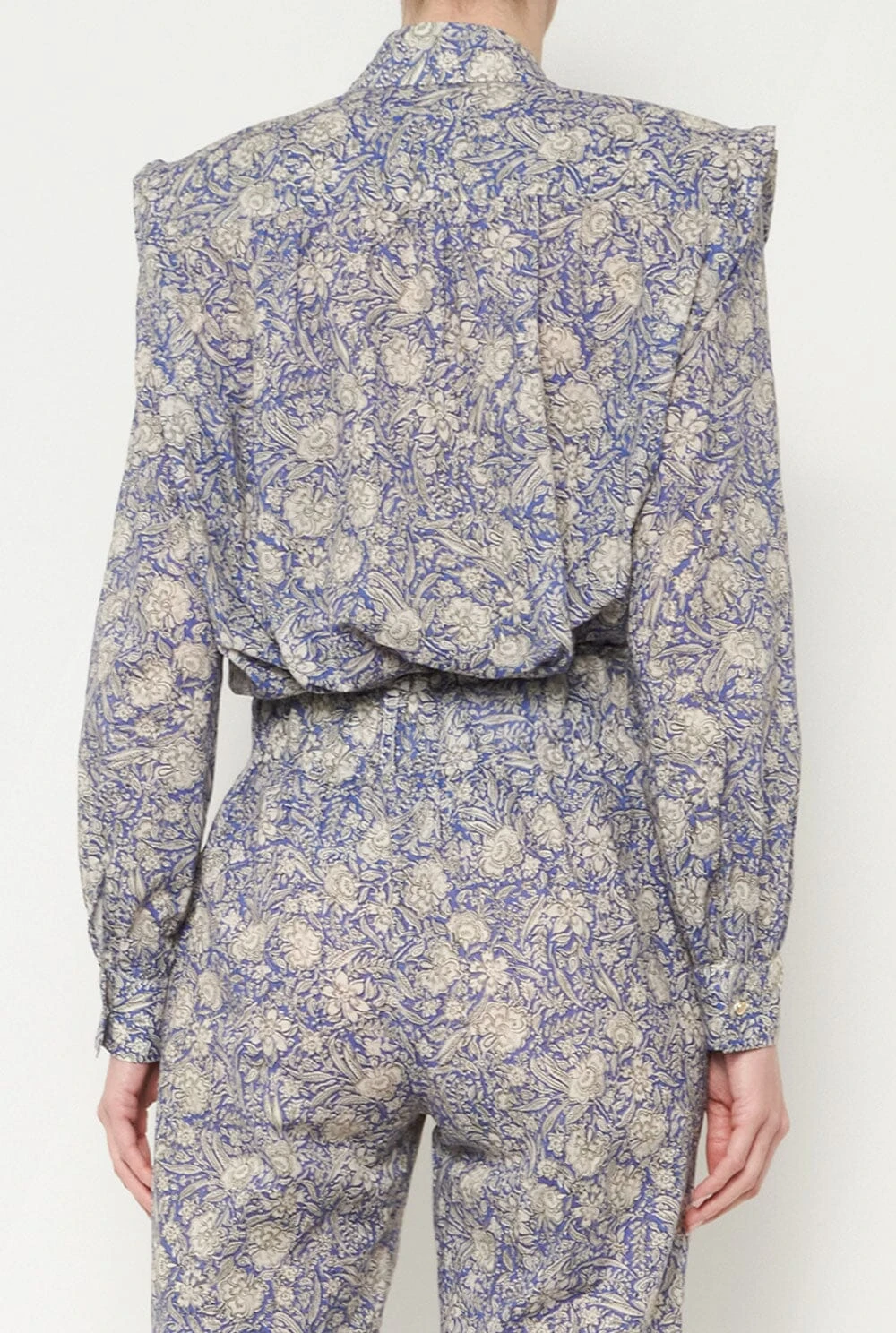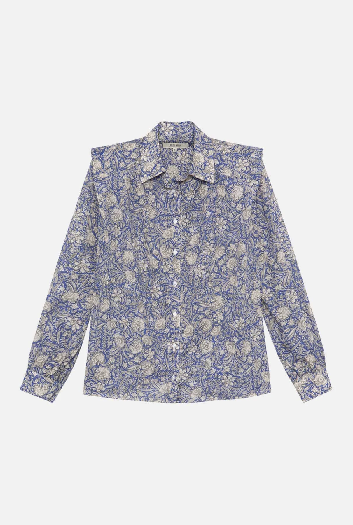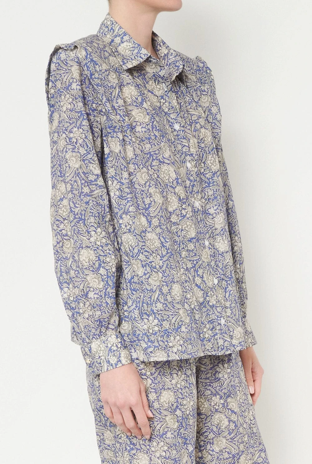 Long sleeve shirt with blue flower print. With summarys on the front. Ruffle detail on the shoulder and golden summary on the collar and cuffs. For a complete look it can be combined with Sofia trousers, Adela trousers and Sole sarong skirt. Made in 100% cotton. Designed by Julise Magon.