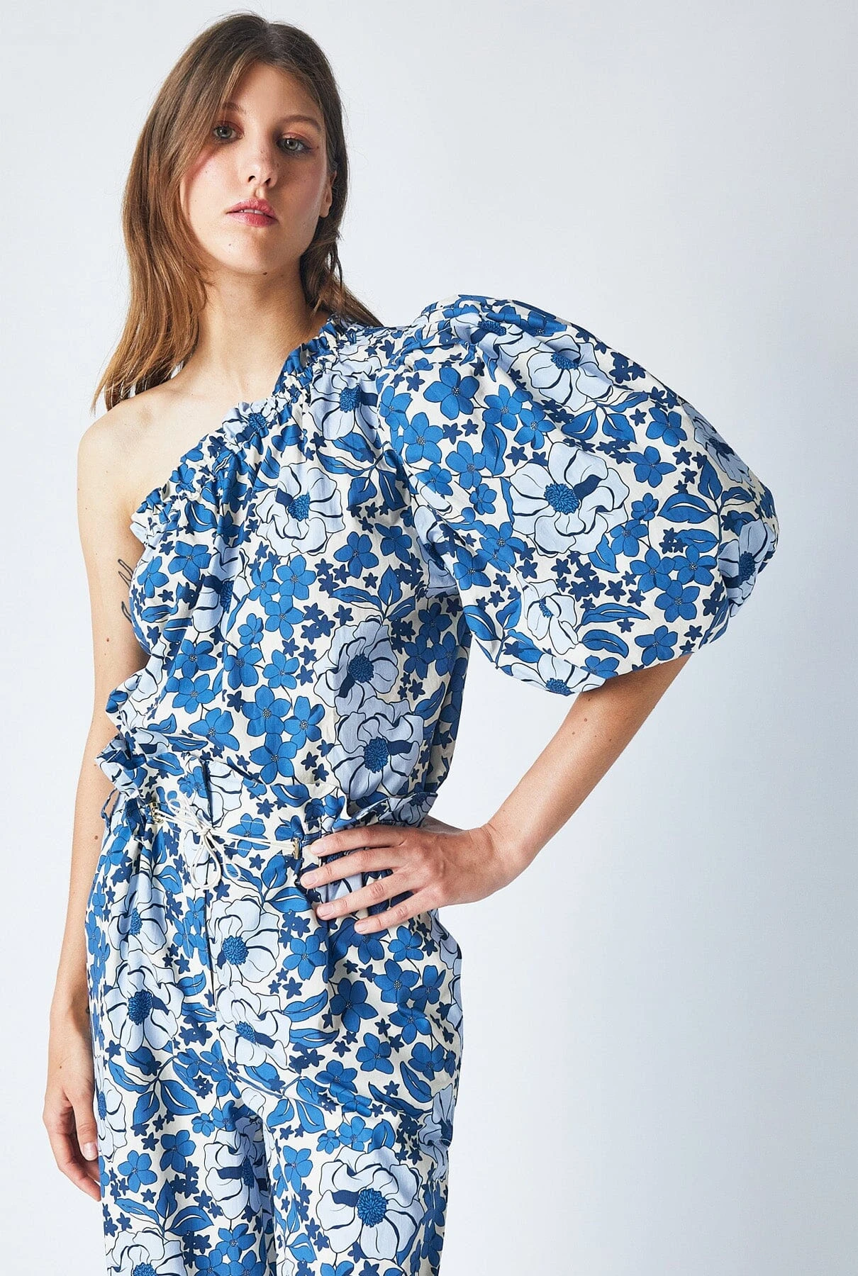 A fresh and summerish piece to wear either with urban or beachwear combos. This one-shoulder puffed top comes with comes with an elastic neckline in a bold blue blooming print.