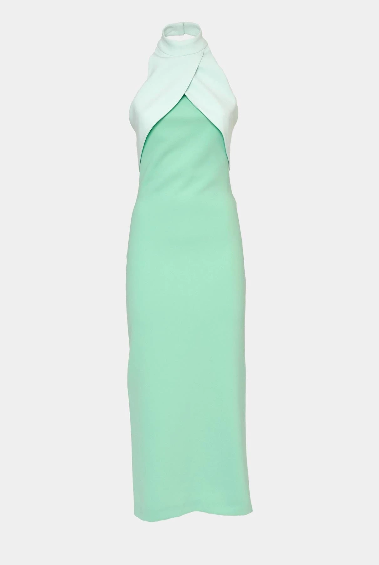 The iconic Montenegro, two-tone midi dress with halter neck. Skirt opening at the back. Lining. Made in Spain.
