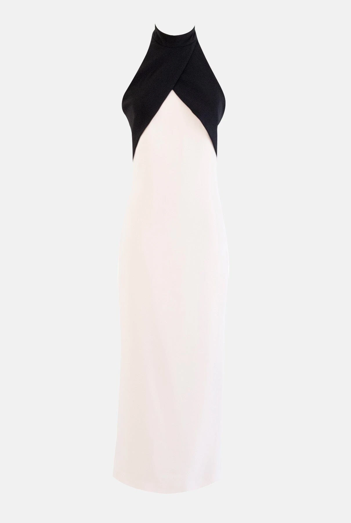 The iconic Montenegro, two-tone midi dress with halter neck. Skirt opening at the back, available in two colours. Lining Made in Spain.