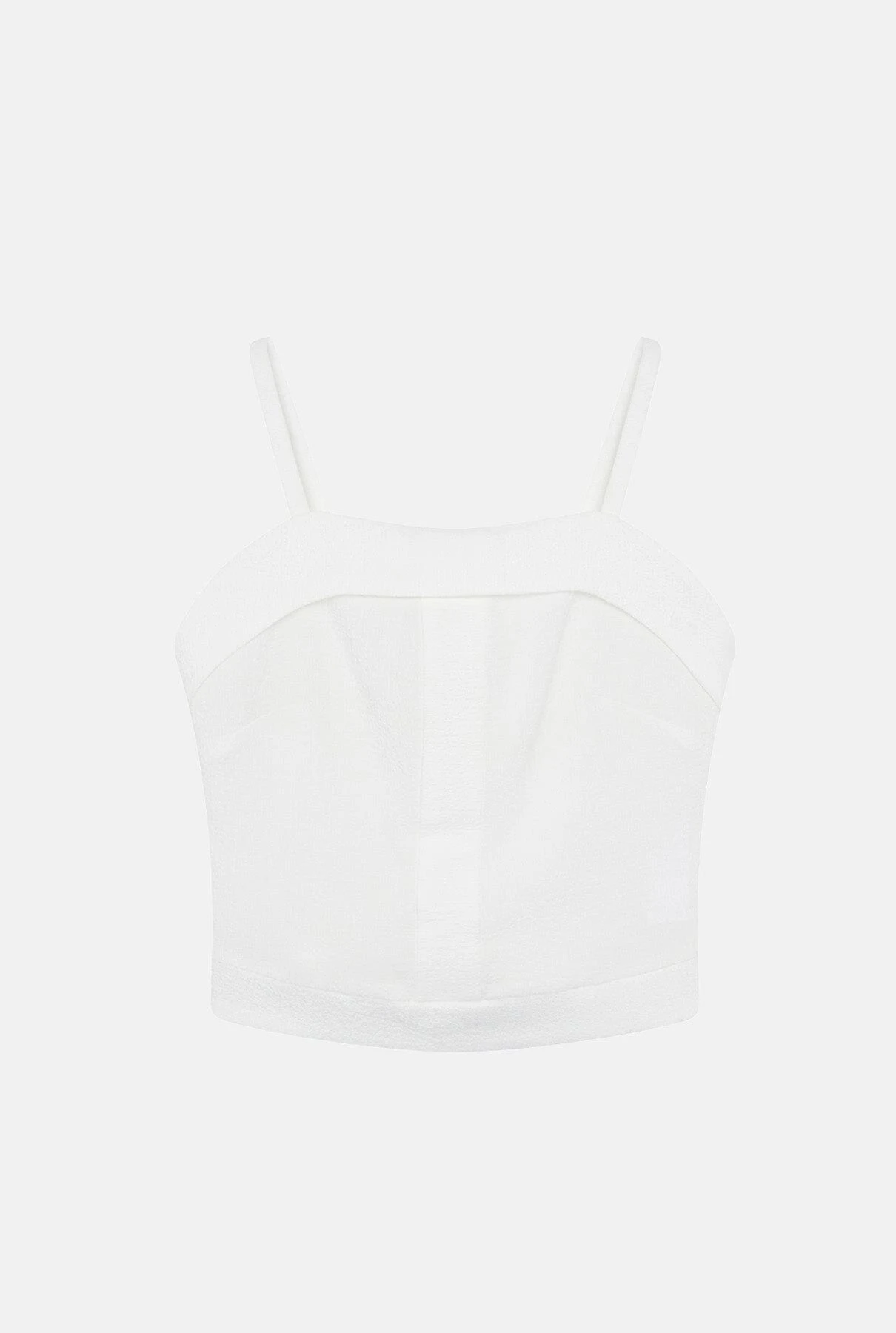 Top in textured fabric. Original rounded shape at neckline and back with straps. Side zip fastening. For a complete look it can be combined with the skirt Carlota or Claudia. In 3 tones: white, stone and khaki.