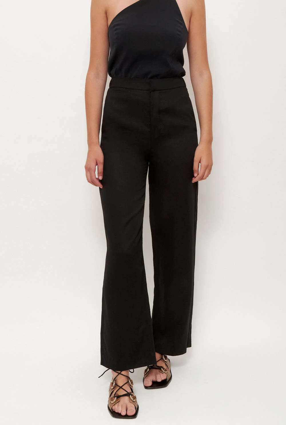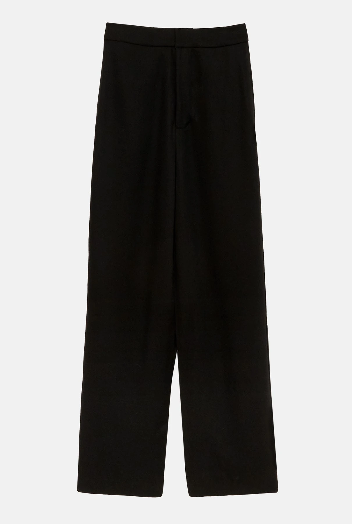 Black tencel high-waist trousers. Front pockets. Wide-leg design. Front zip fly and metal hook.
