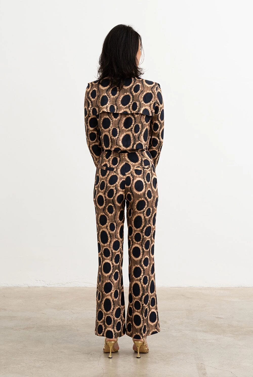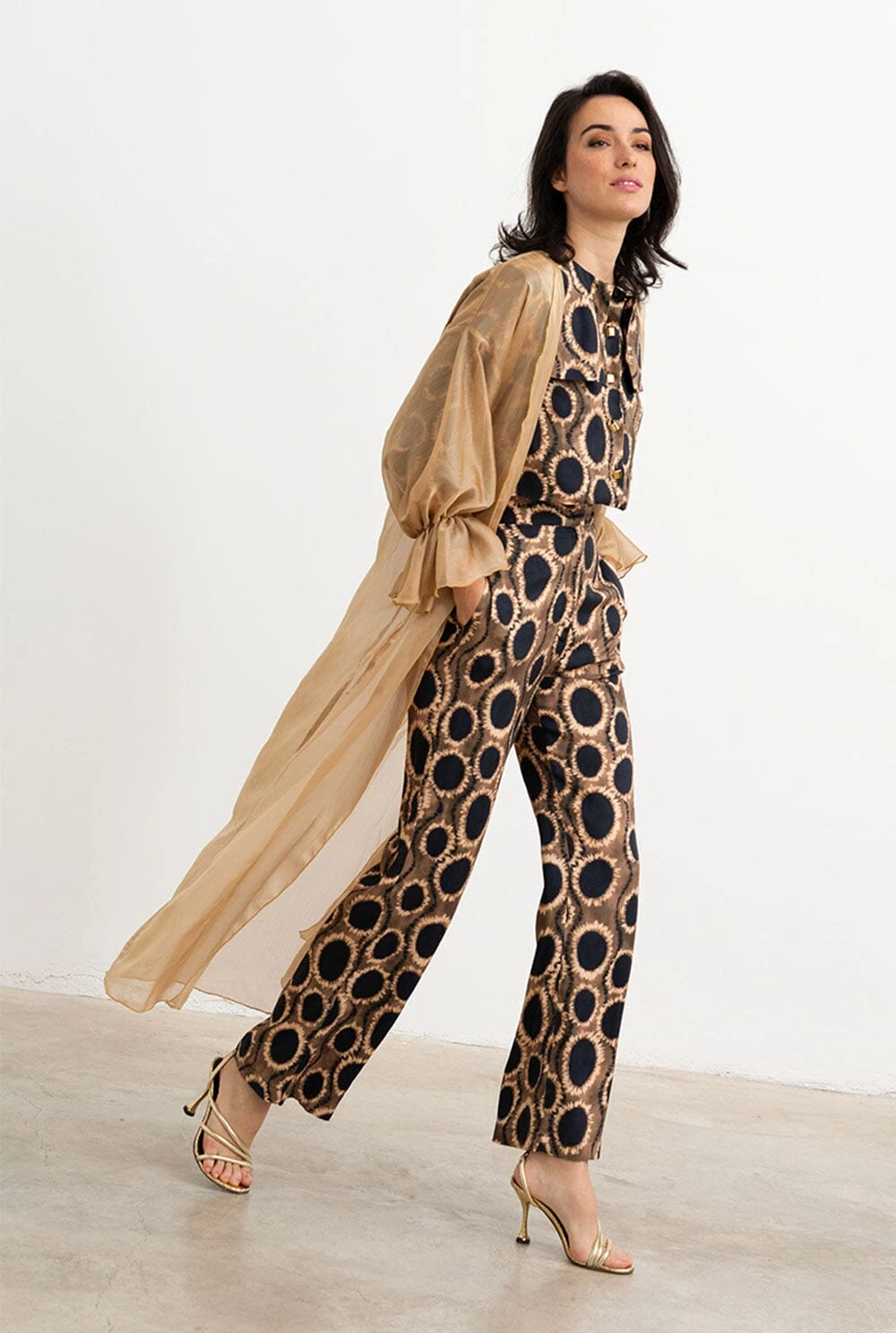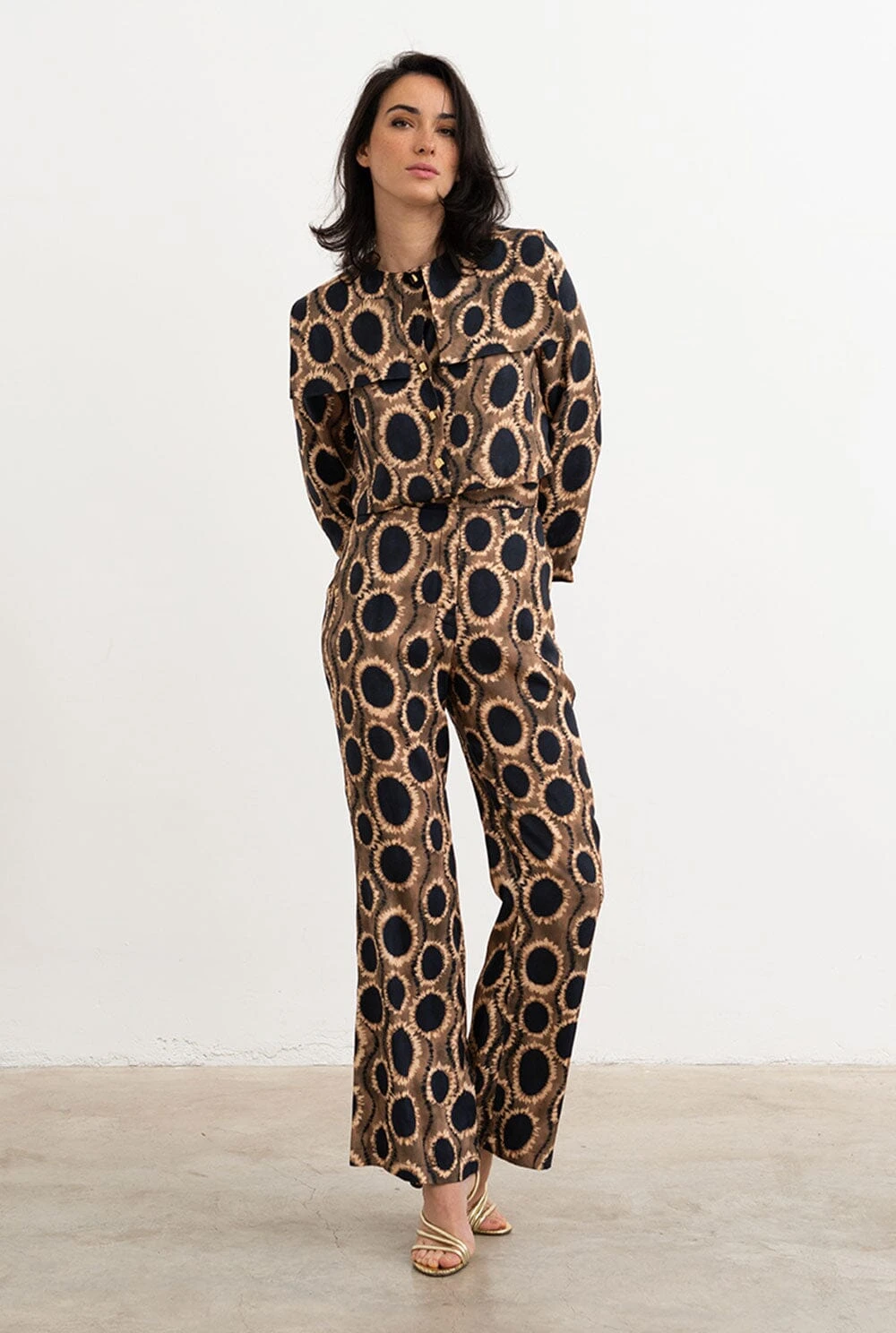 Palazzo-style pants, front closure with internal summary and zipper in brown, beige and black printed fabric. Side seam pockets and false pocket detail on the back. Wash at 30 degrees, iron at low temperature or with a tissue on it, do not tumble dry, do not dry clean and do not use bleach