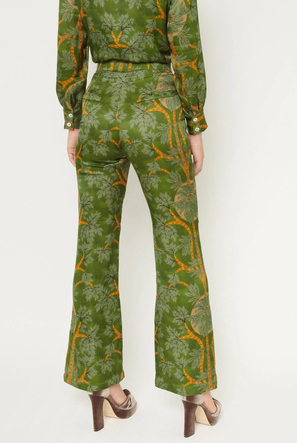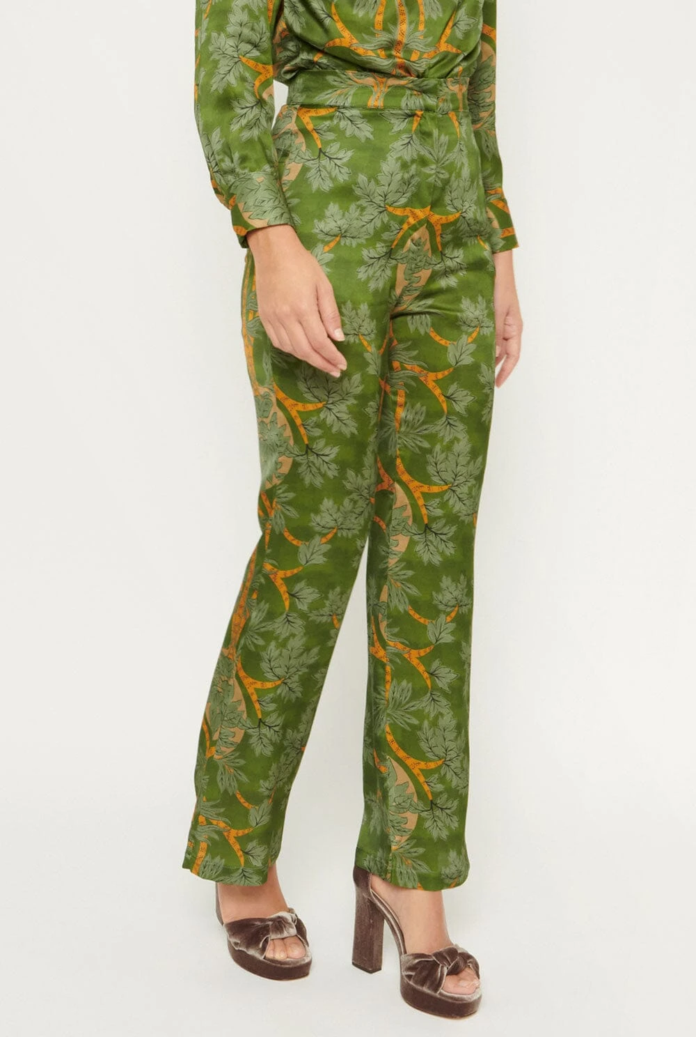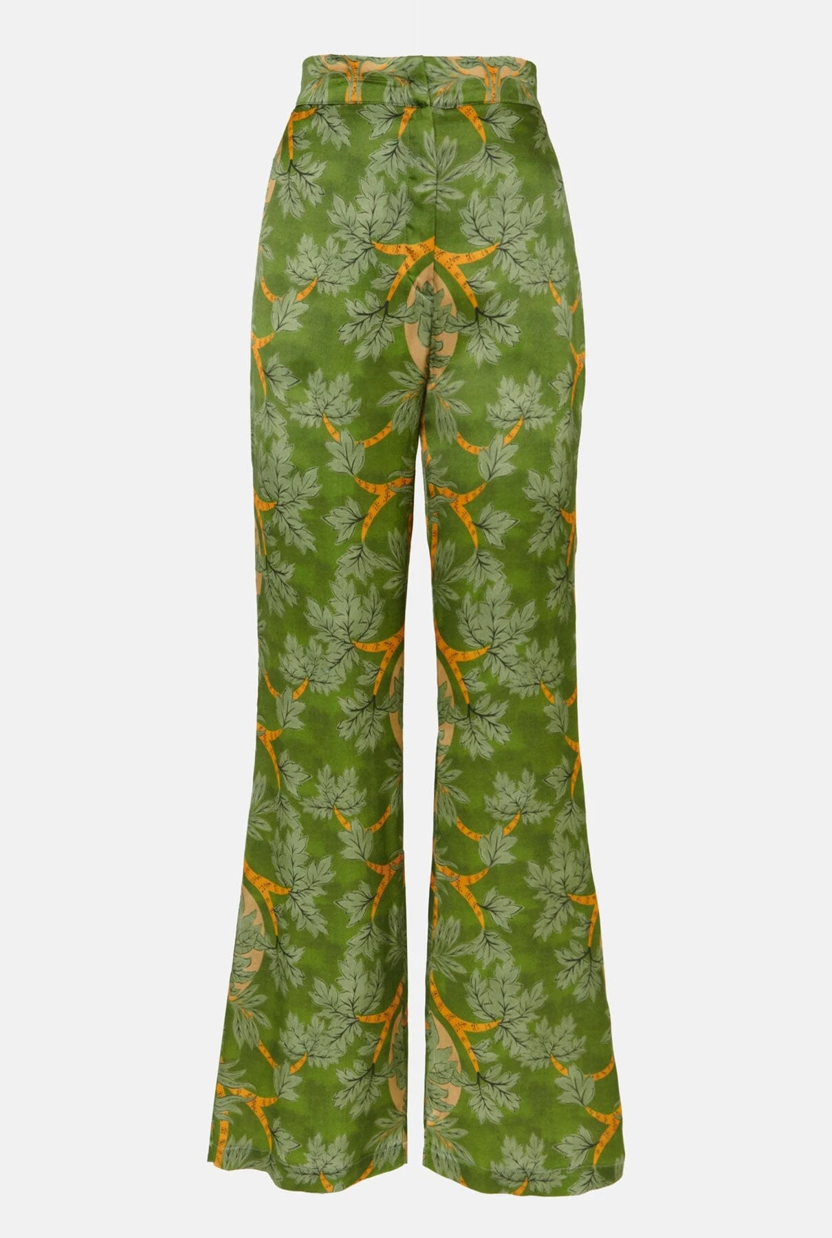 Palazzo-style pants, front closure with internal summary and zipper in green and mustard printed fabric. Side seam pockets and false pocket detail on the back. Wash at 30 degrees, iron at low temperature or with a tissue on it, do not tumble dry, do not dry clean and do not use bleach