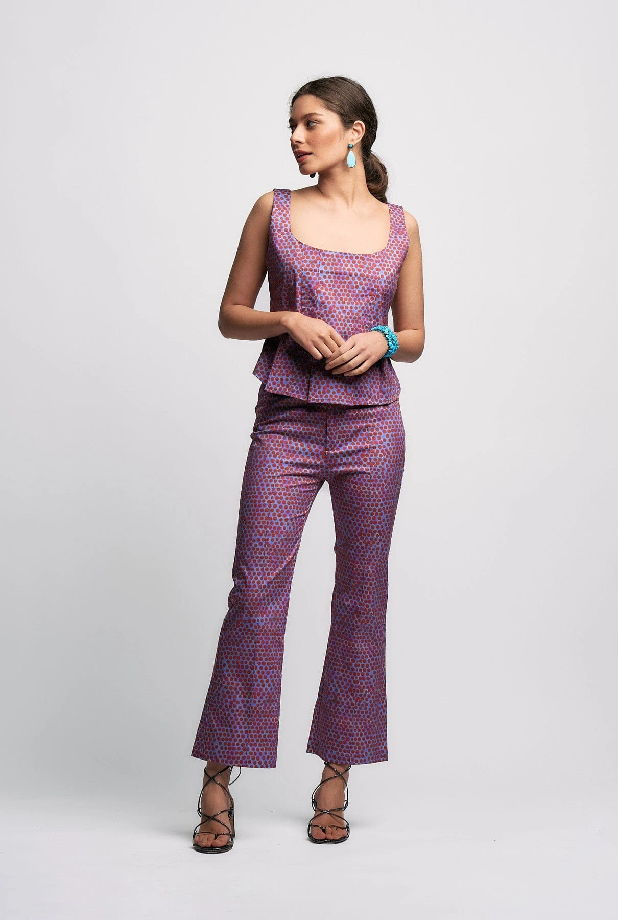 Flare trousers in the new Lavinia print. With an elasticated waistband and inner summary, these trousers have a very flattering cut to wear with any Dunas top, Max top or a blouse like our Rania blouse.