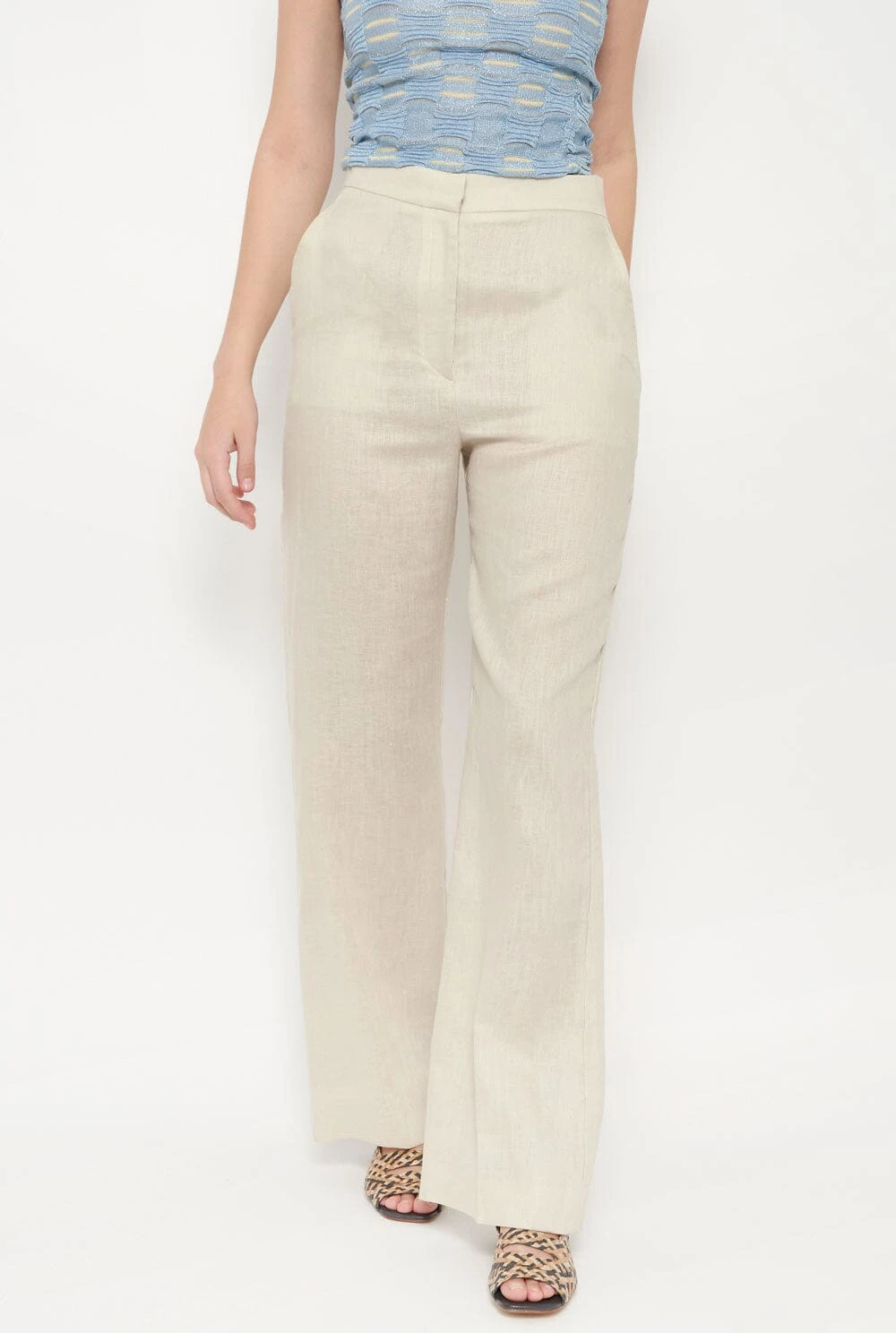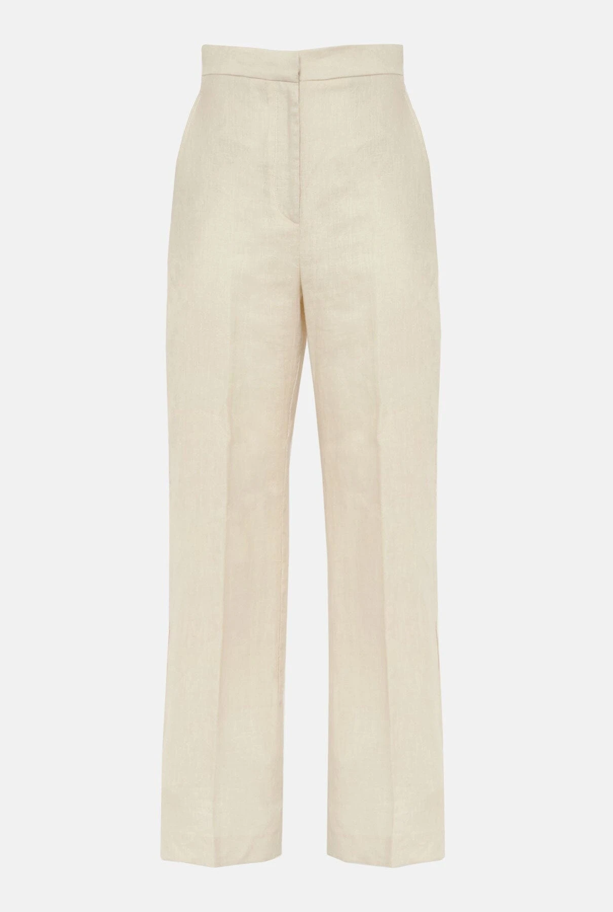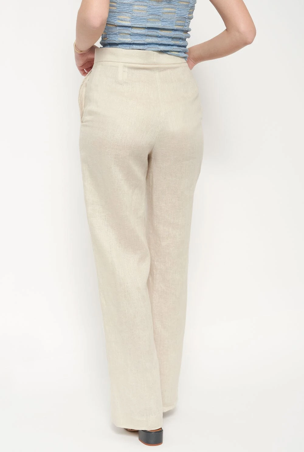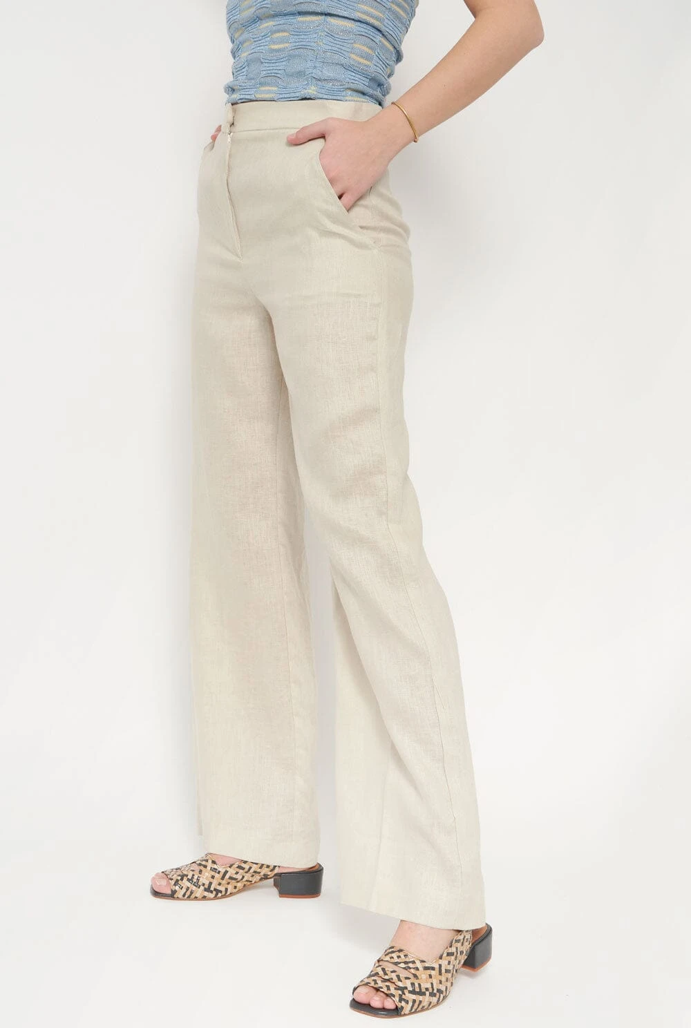 Linen high-waist trousers. Front pockets. Wide-leg design. Front zip fly and metal hook. Wash by hand, iron low temperature, do not tumble dry, do not use bleach. Designed by Alava Brand