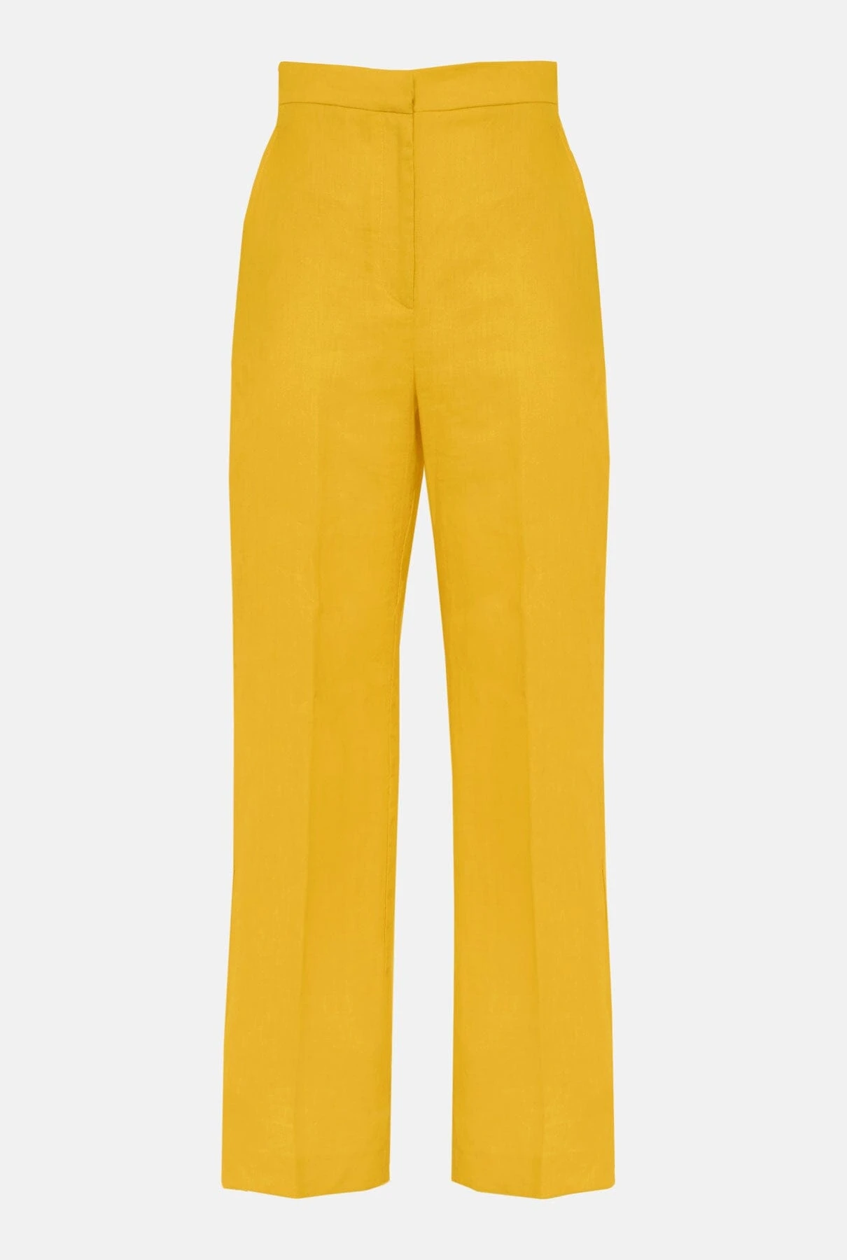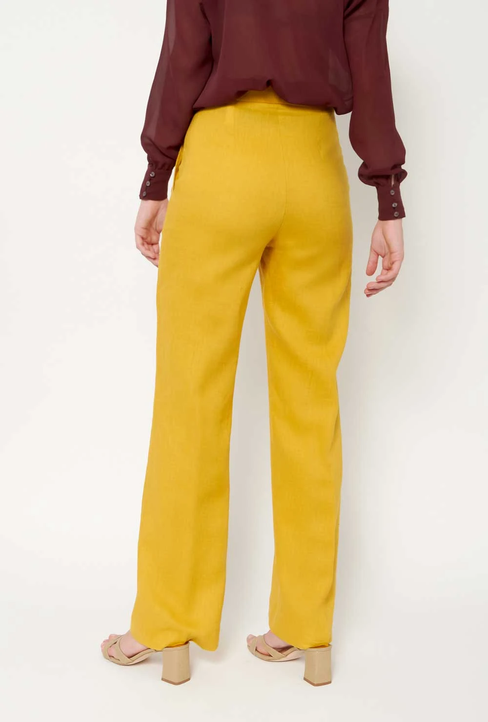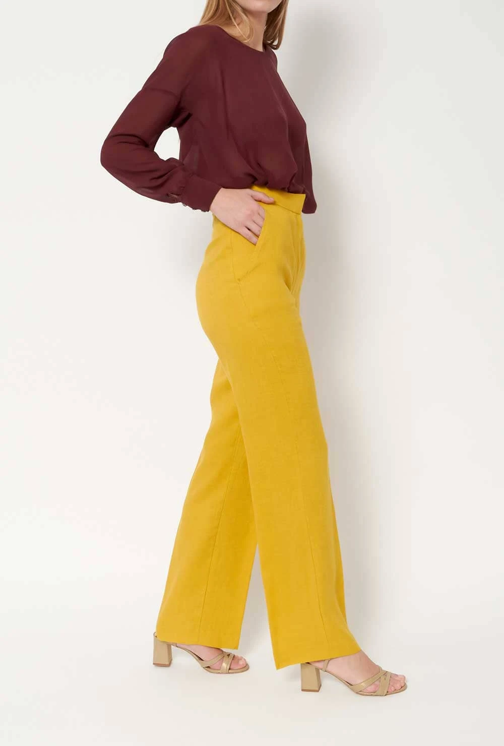 Linen high-waist trousers. Front pockets. Wide-leg design. Front zip fly and metal hook. Wash by hand, iron low temperature, do not tumble dry, do not use bleach. Designed by Alava Brand