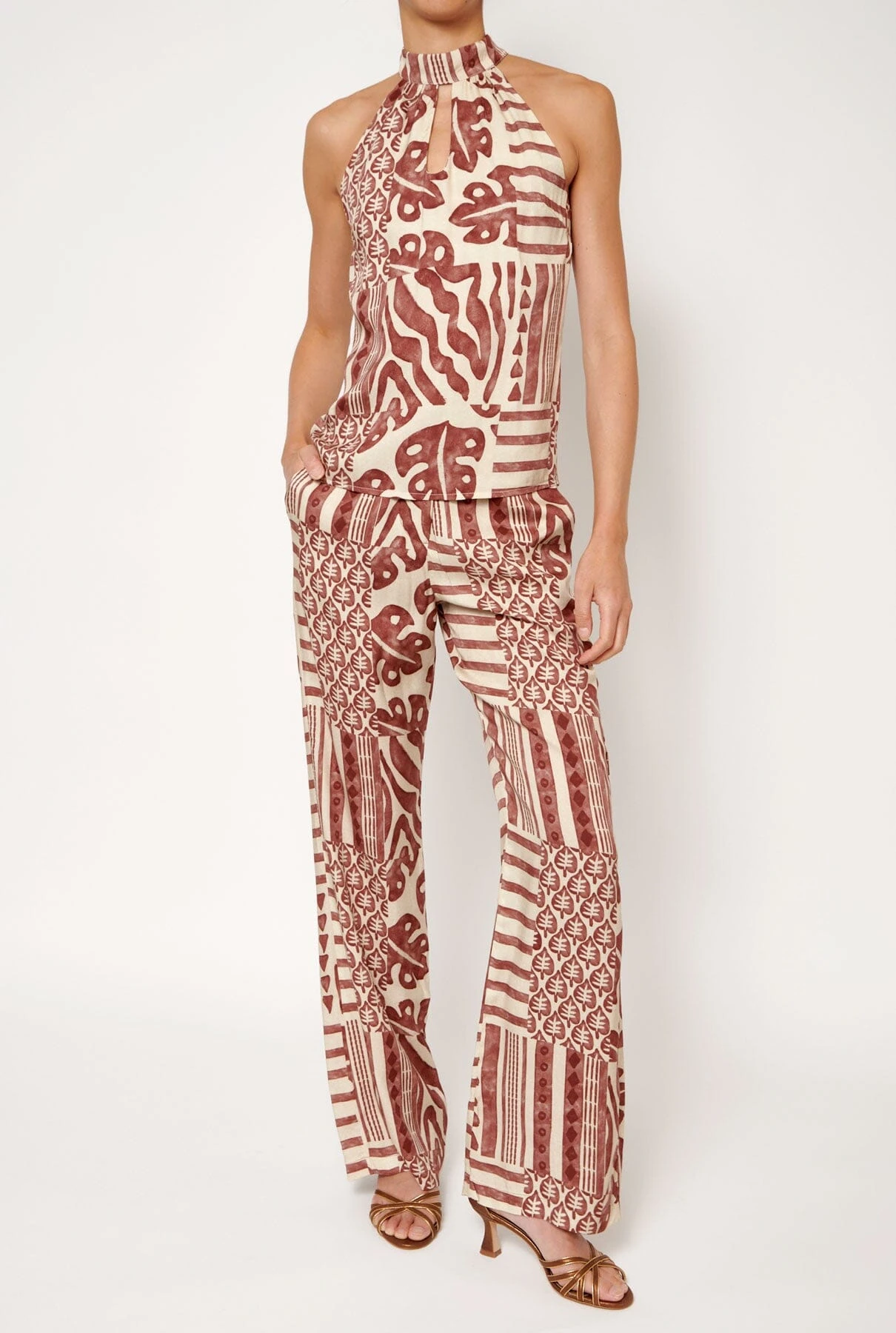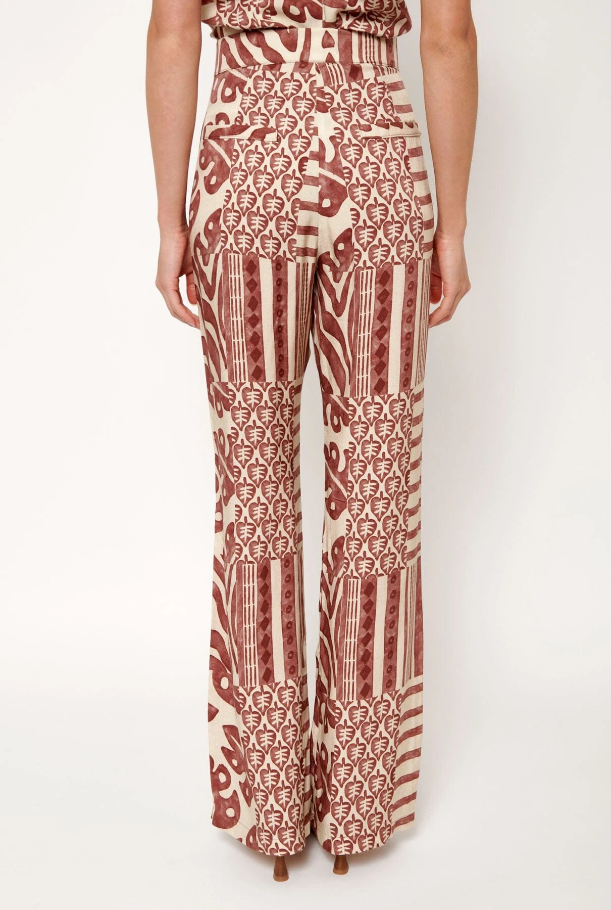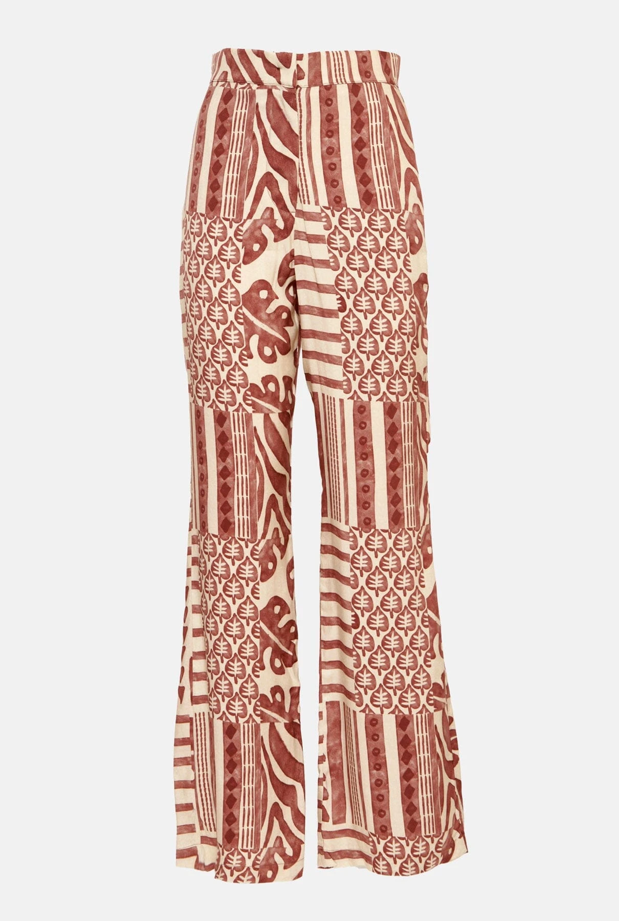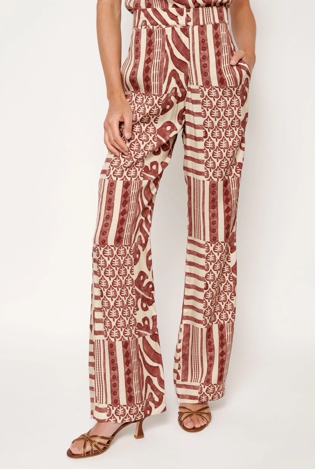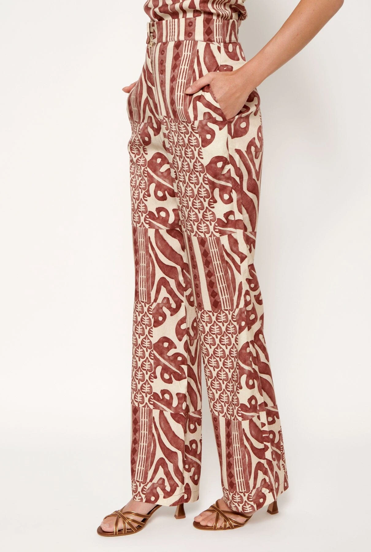 Palazzo-style pants, front closure with internal summary and zipper in red and beige printed fabric. Side seam pockets and false pocket detail on the back.