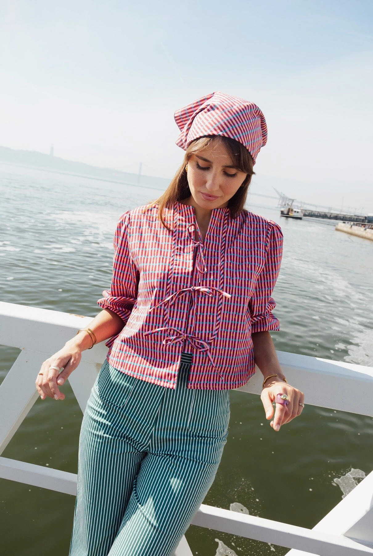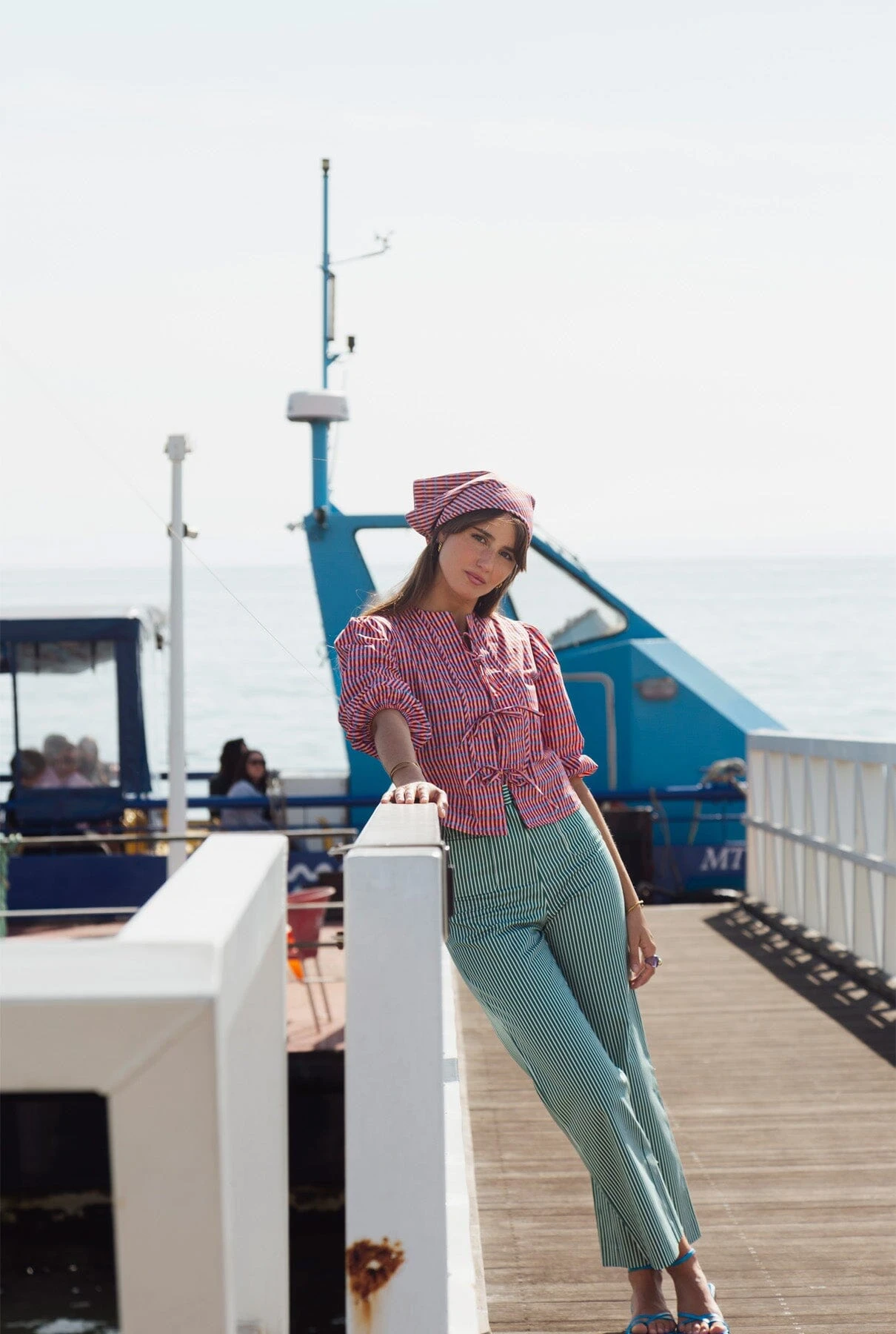 High-waisted straight trousers for a slim figure. They have pockets on both sides and summary fastening. Made from a green vertical striped cotton fabric. Very flattering.