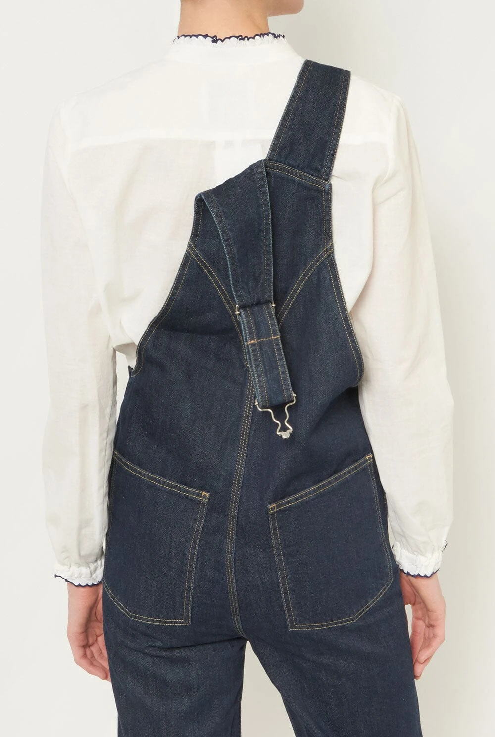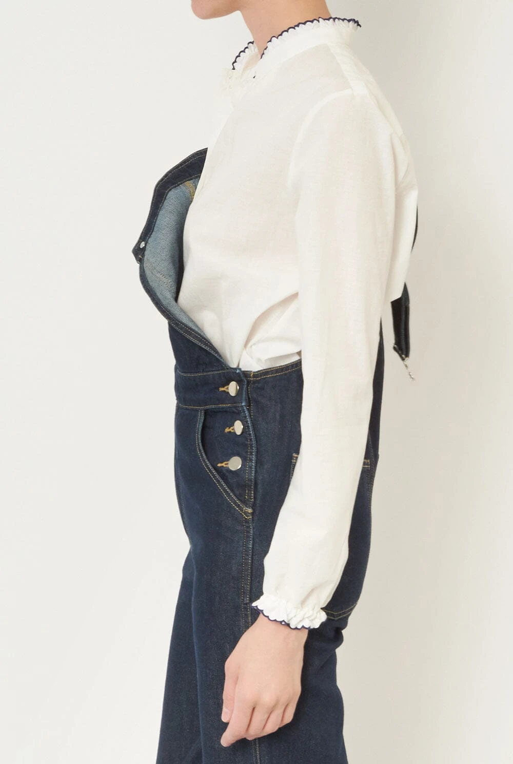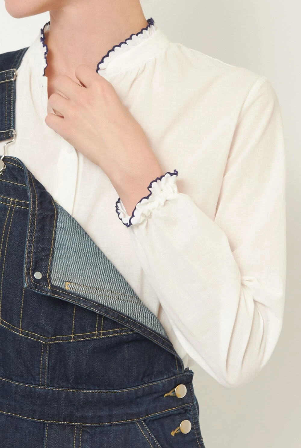 Off-white blouse with ruffled flounce and navy blue embroidered trim on collar and cuffs. Made in Spain