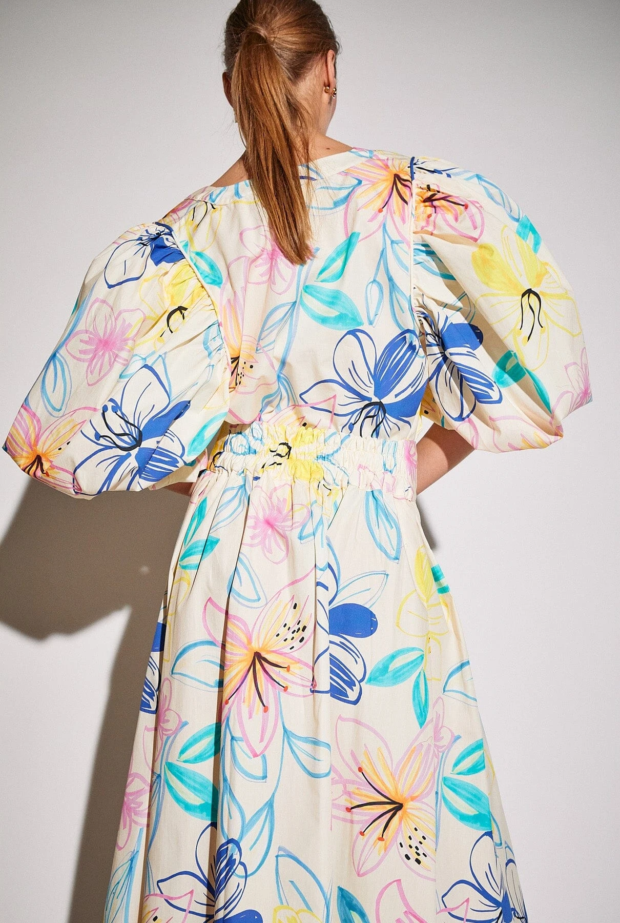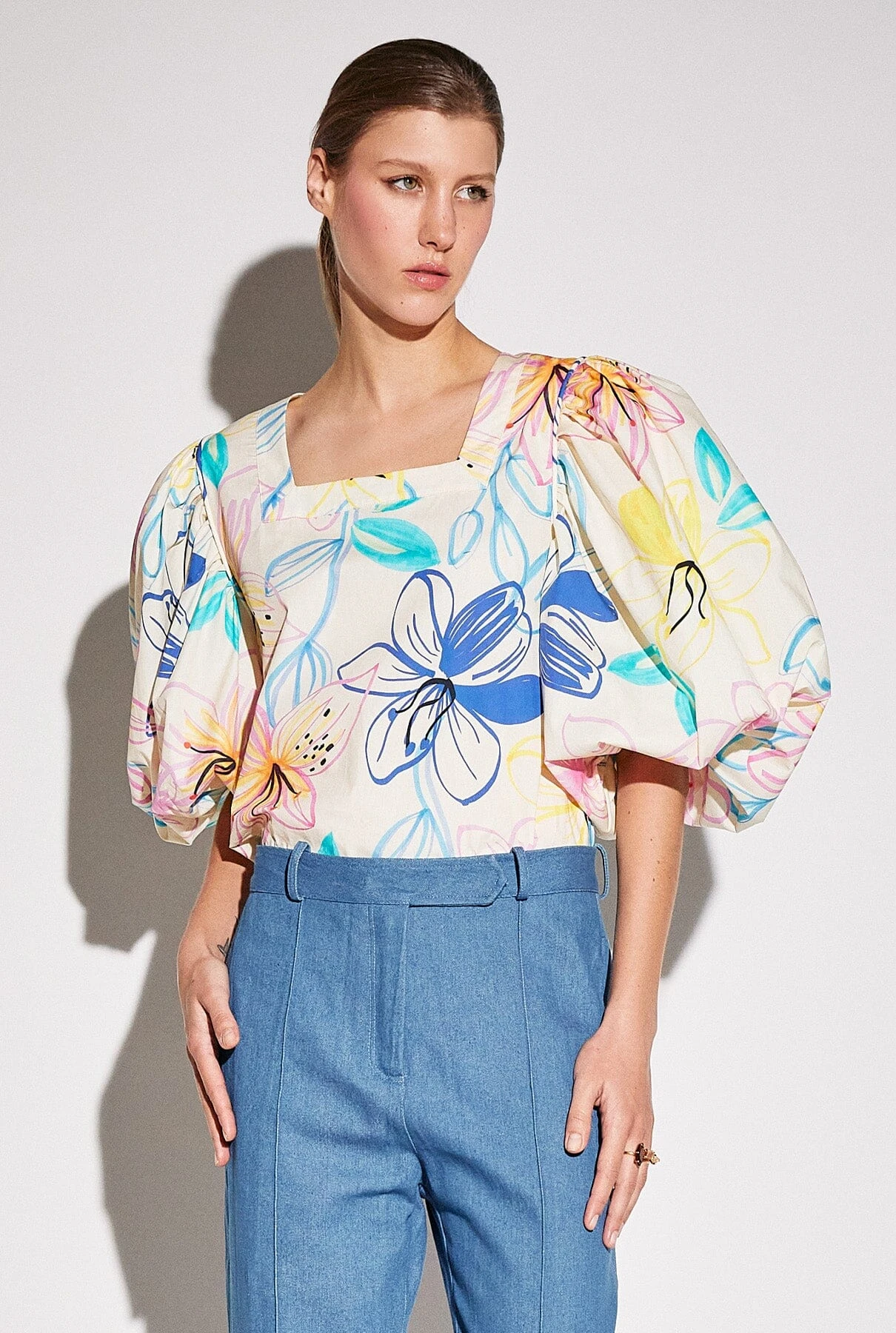 A playful piece to match your summer outfits. This version comes with puffed sleeves, elastic cuffs and a squared neck in a bright flowered cotton.