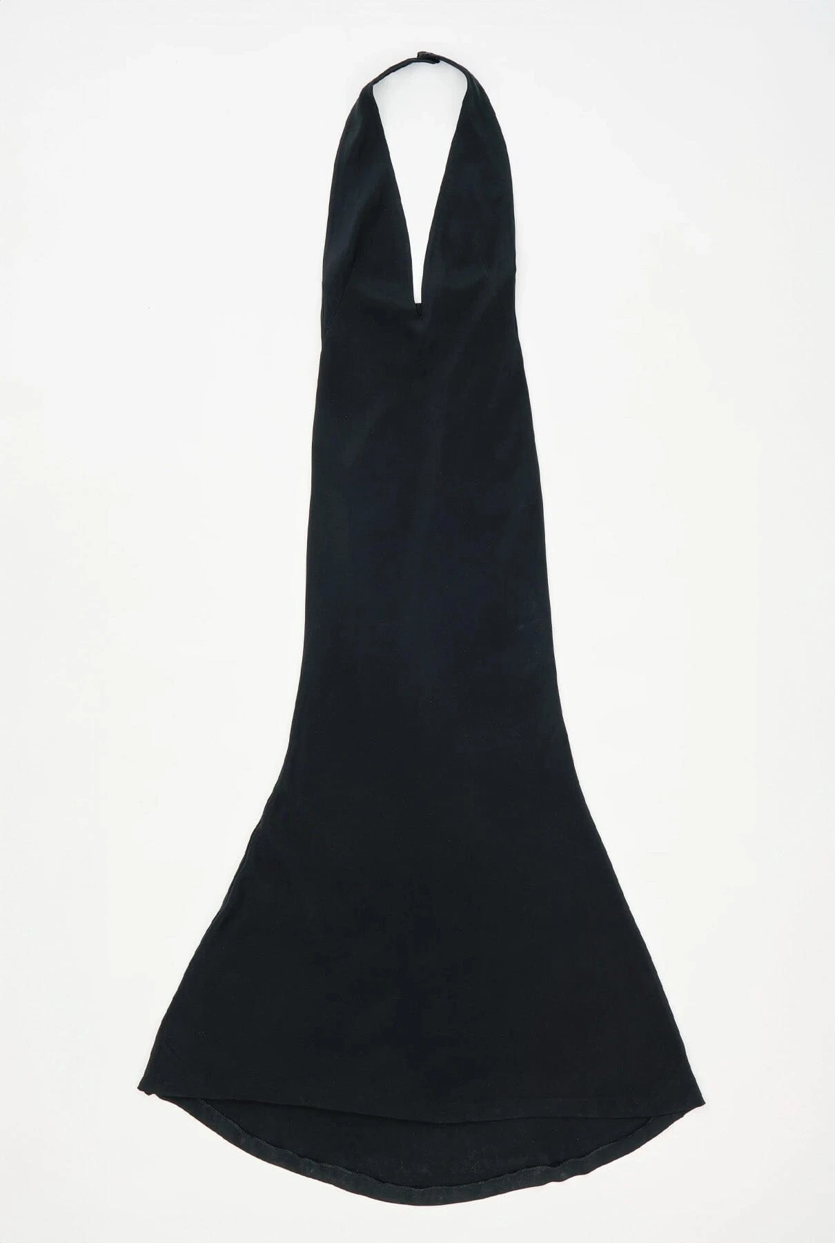 Long dress cut on the bias, with deep v-neckline in the front and completely naked back draped over the lumbar area.