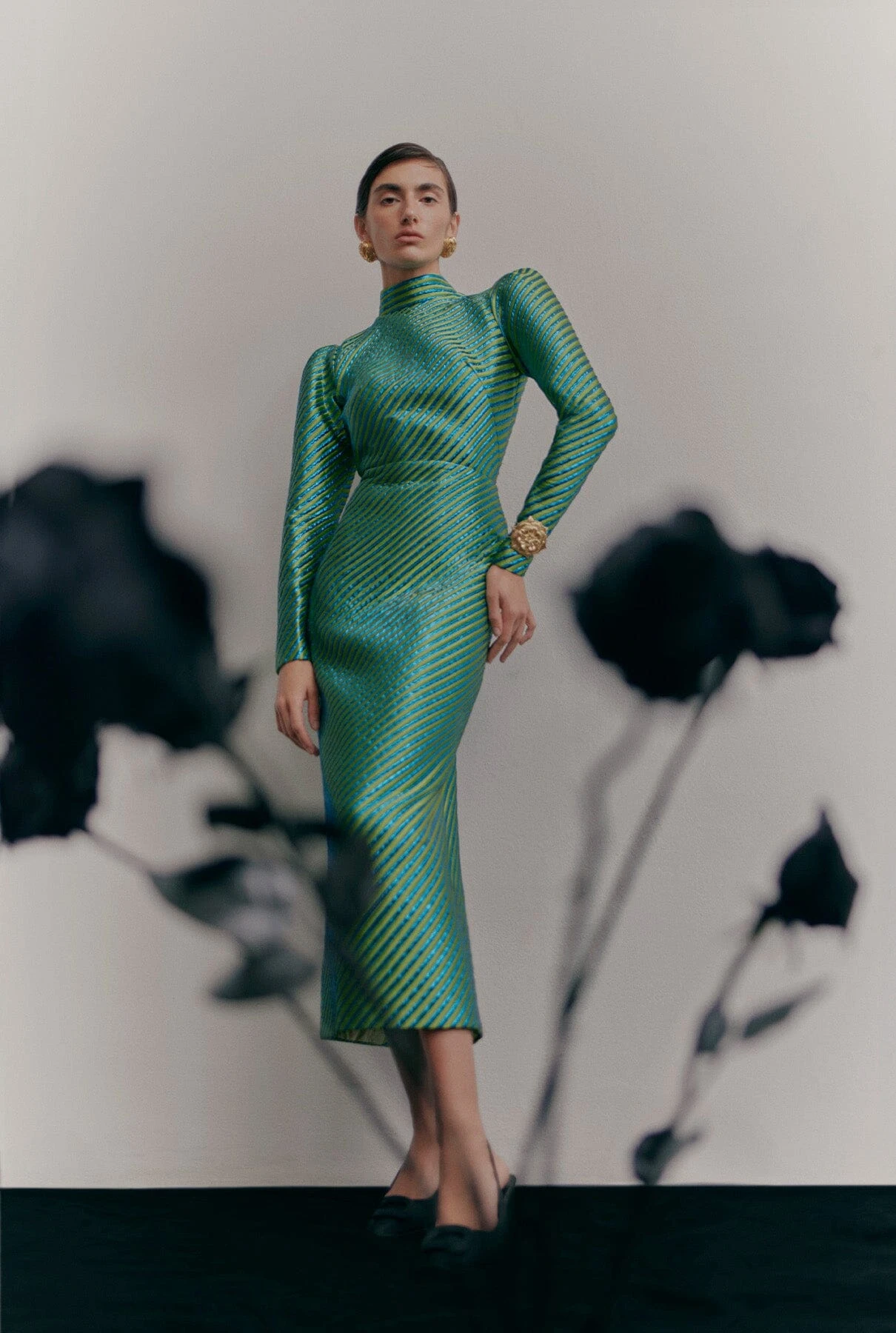 Midi dress, in two-tone lurex fabric. Long sleeves, puffed shoulders and high neck. Lining and back zip Available in two colours. Made in Spain.