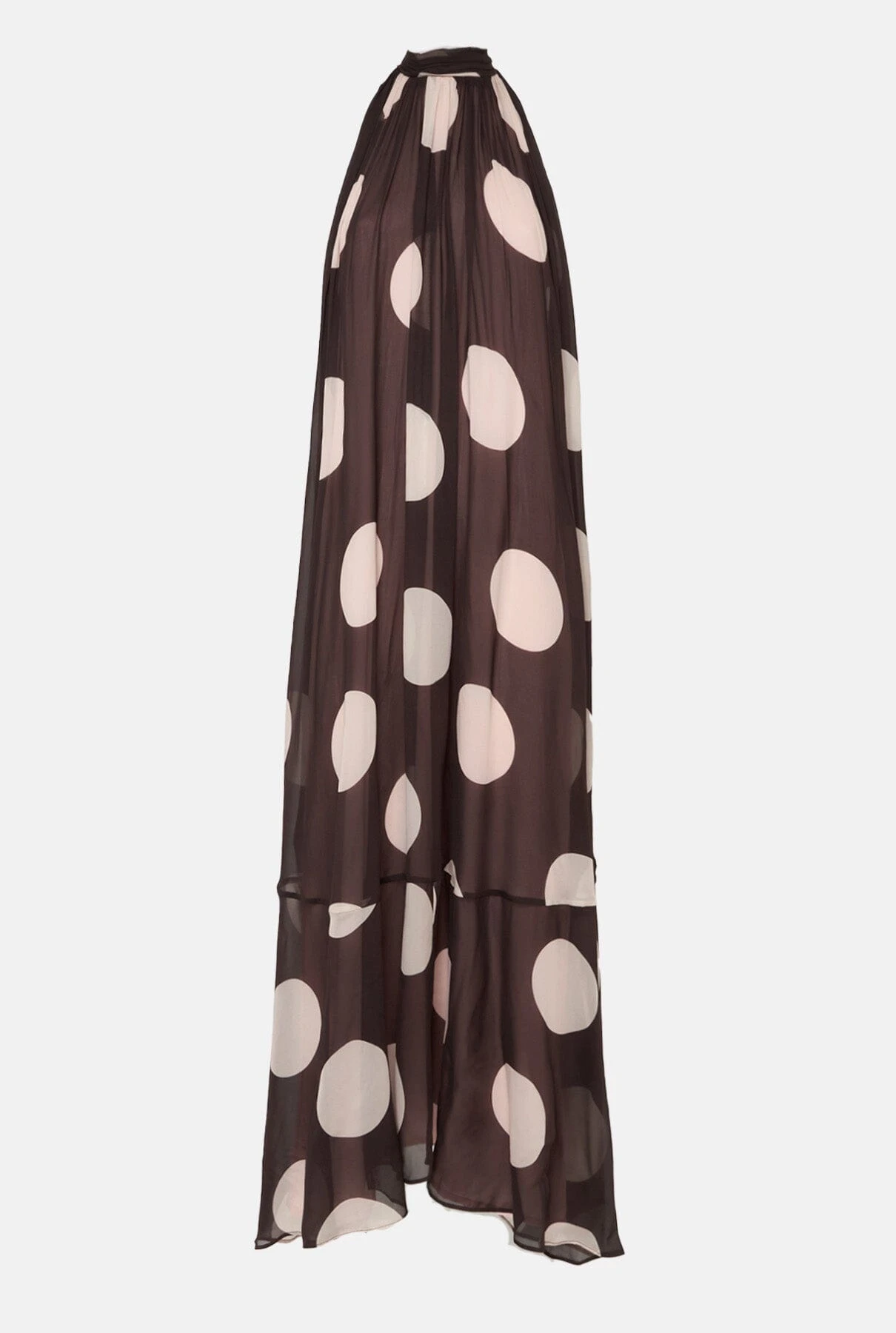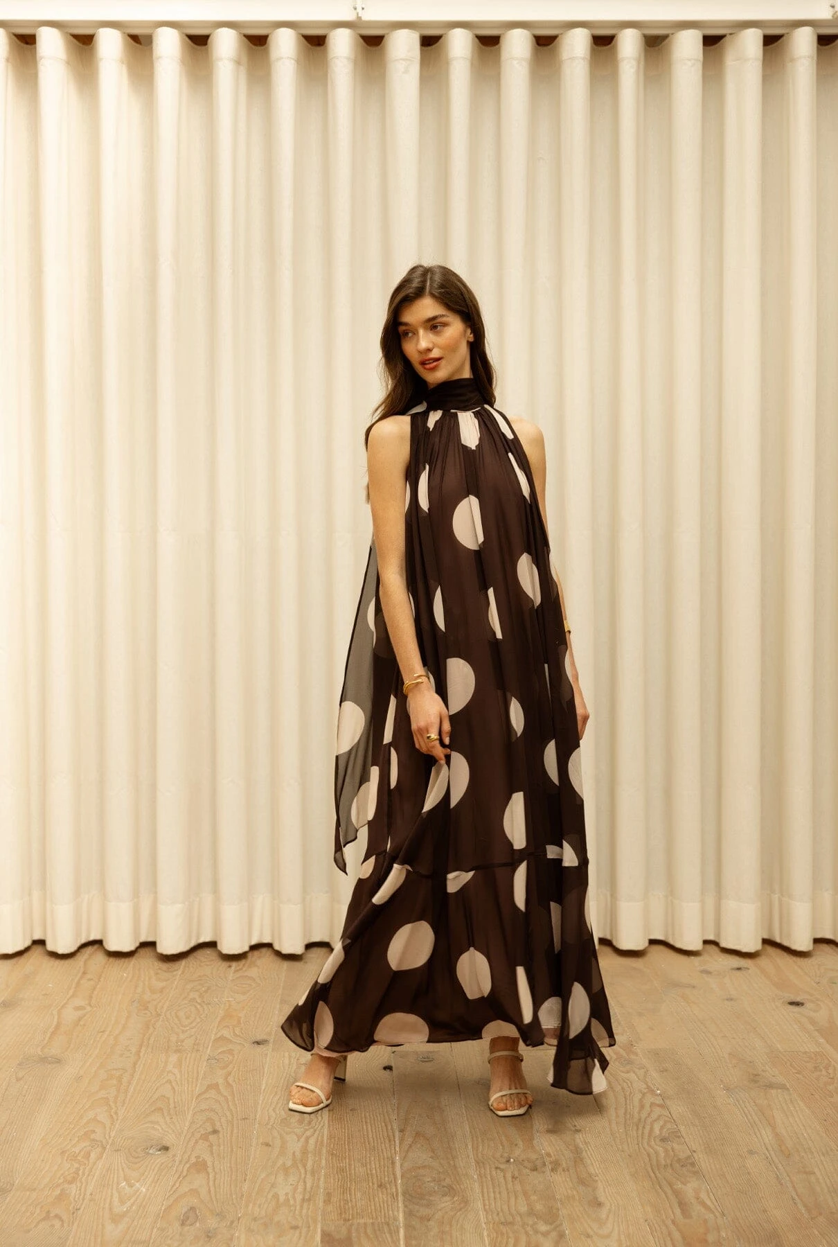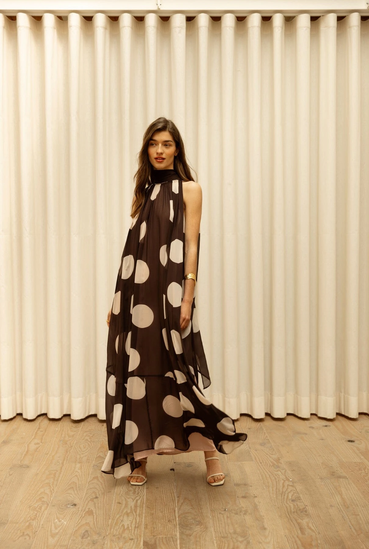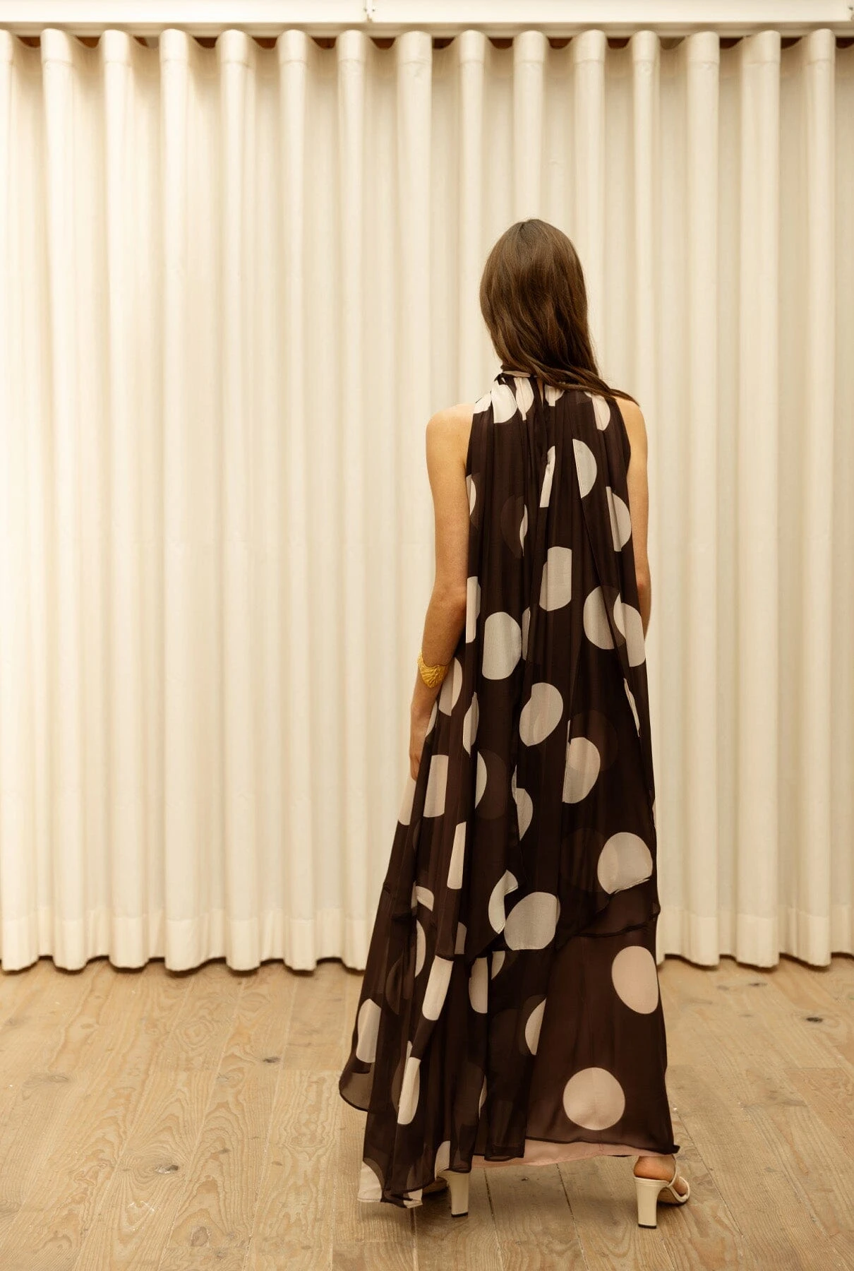 Oversized halter dress with ankle length. It is shirred at the neckline, and it has a lot of flounce. It has a skirting at the hem which gives it even more lift. The neckline has two long loops to turn it around.