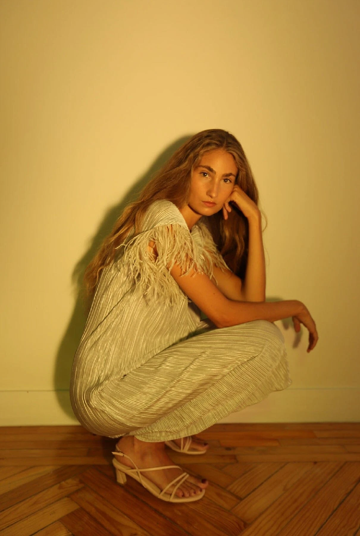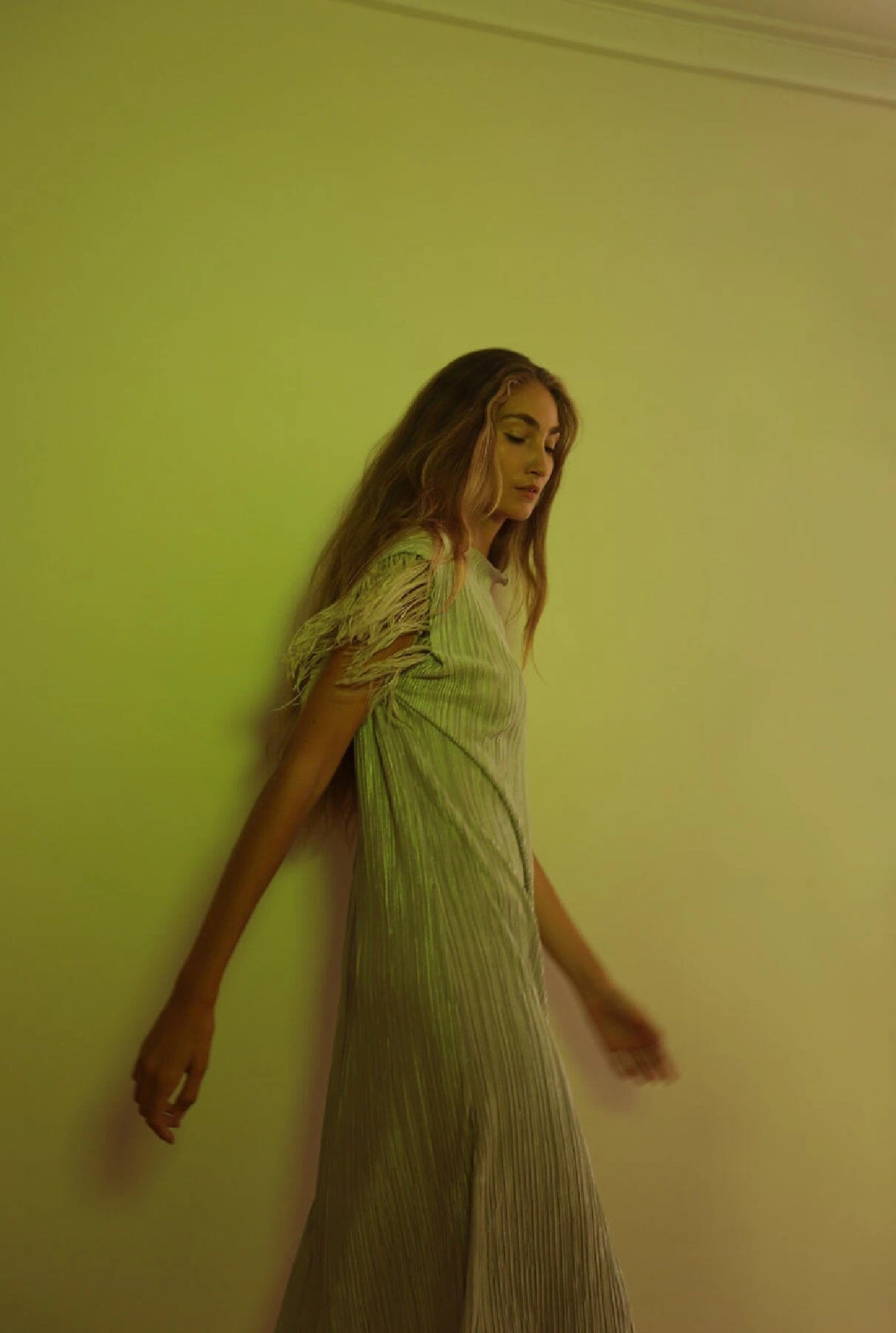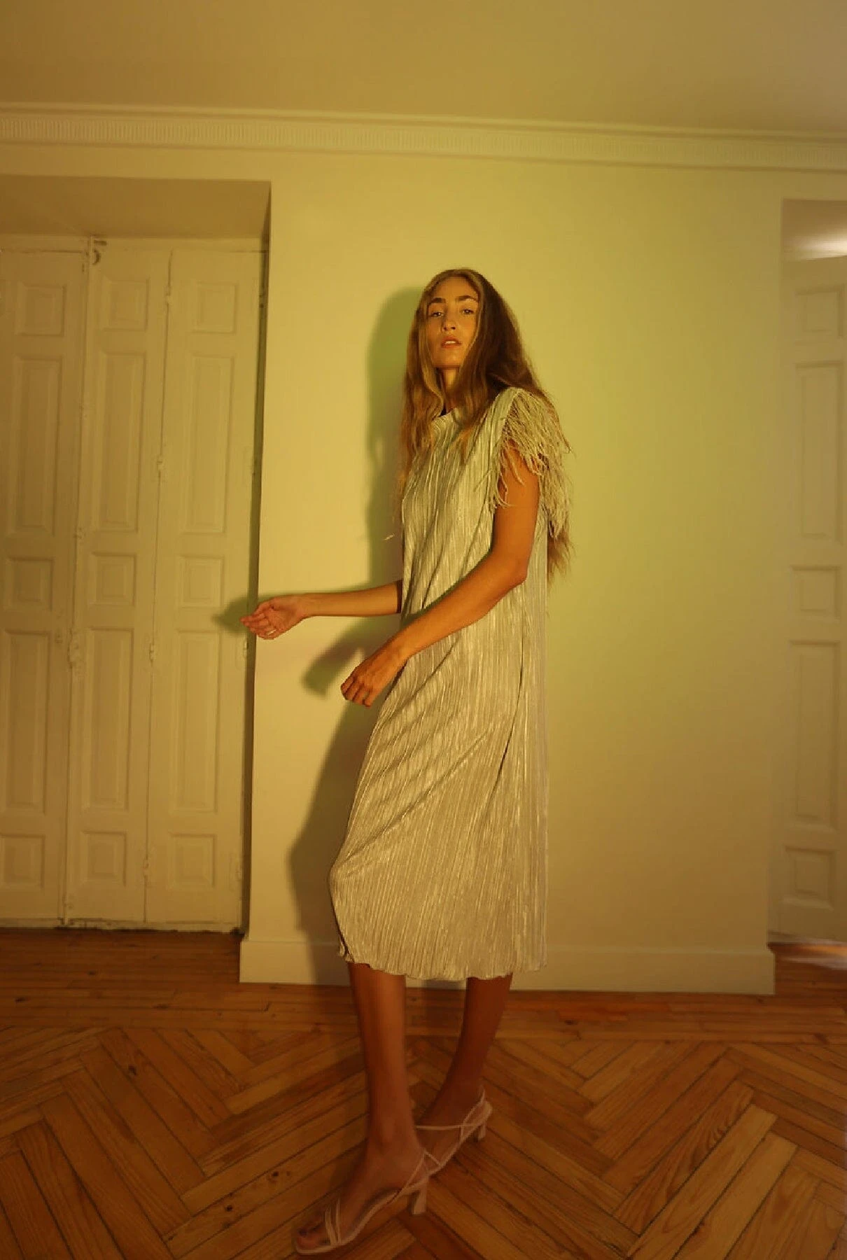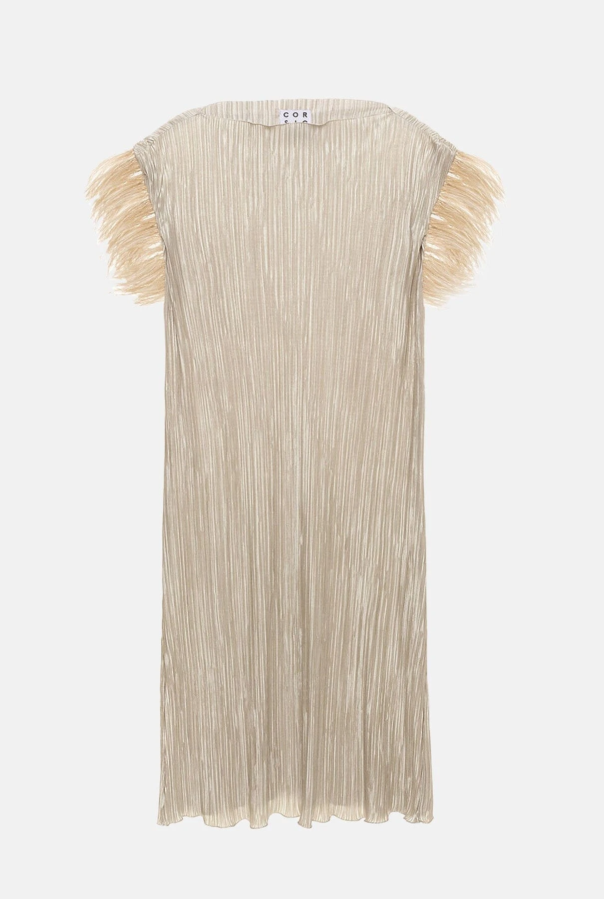 Pleated straight dress with detail made of real feathers. Boat shape collar. This style belongs to PREVIO x Corsicana. Our customizable collection of sartorial pieces. ¡Create yours!