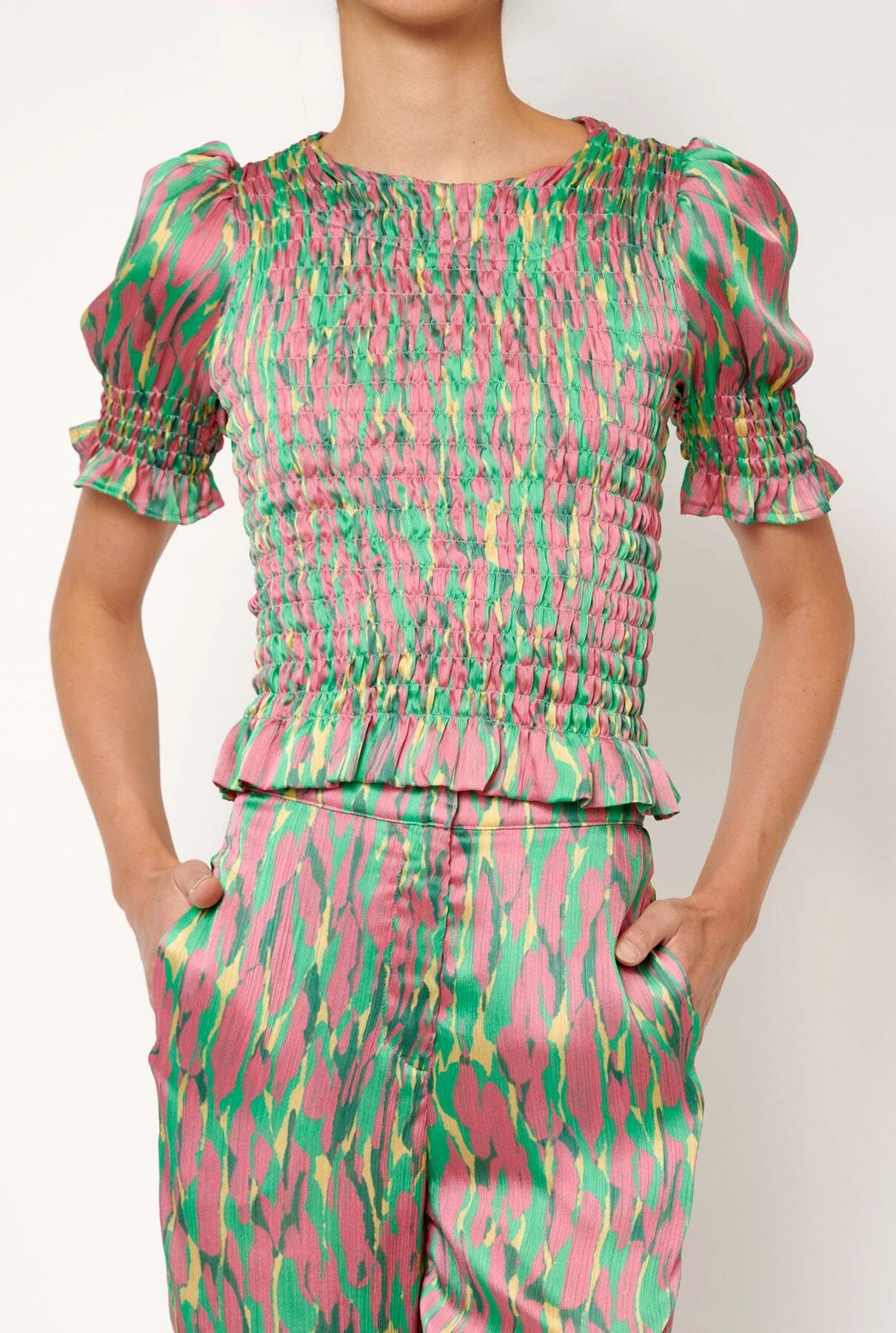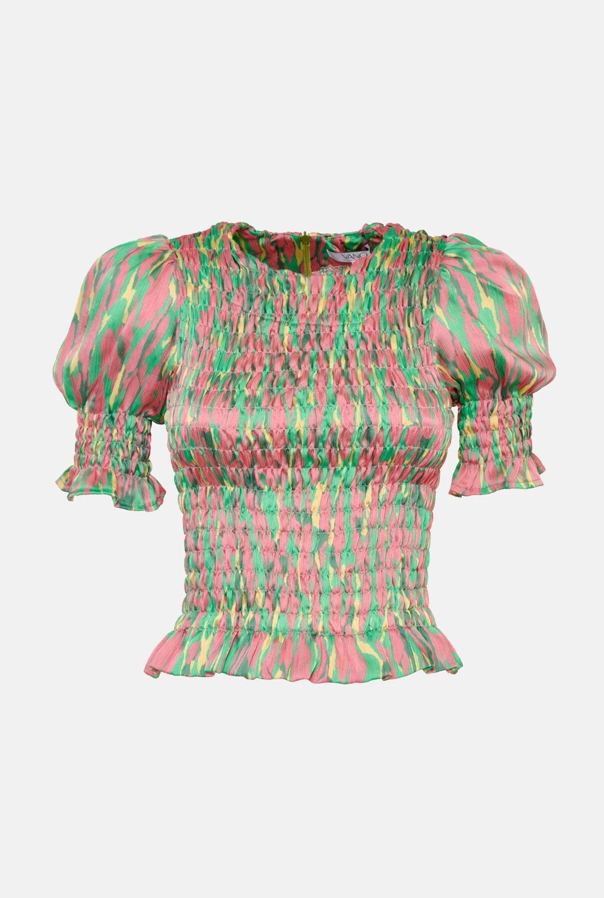Colorful short-sleeved top with a ruched body that adapts to different body types. Short sleeves with small gathers and back closure with invisible zipper.