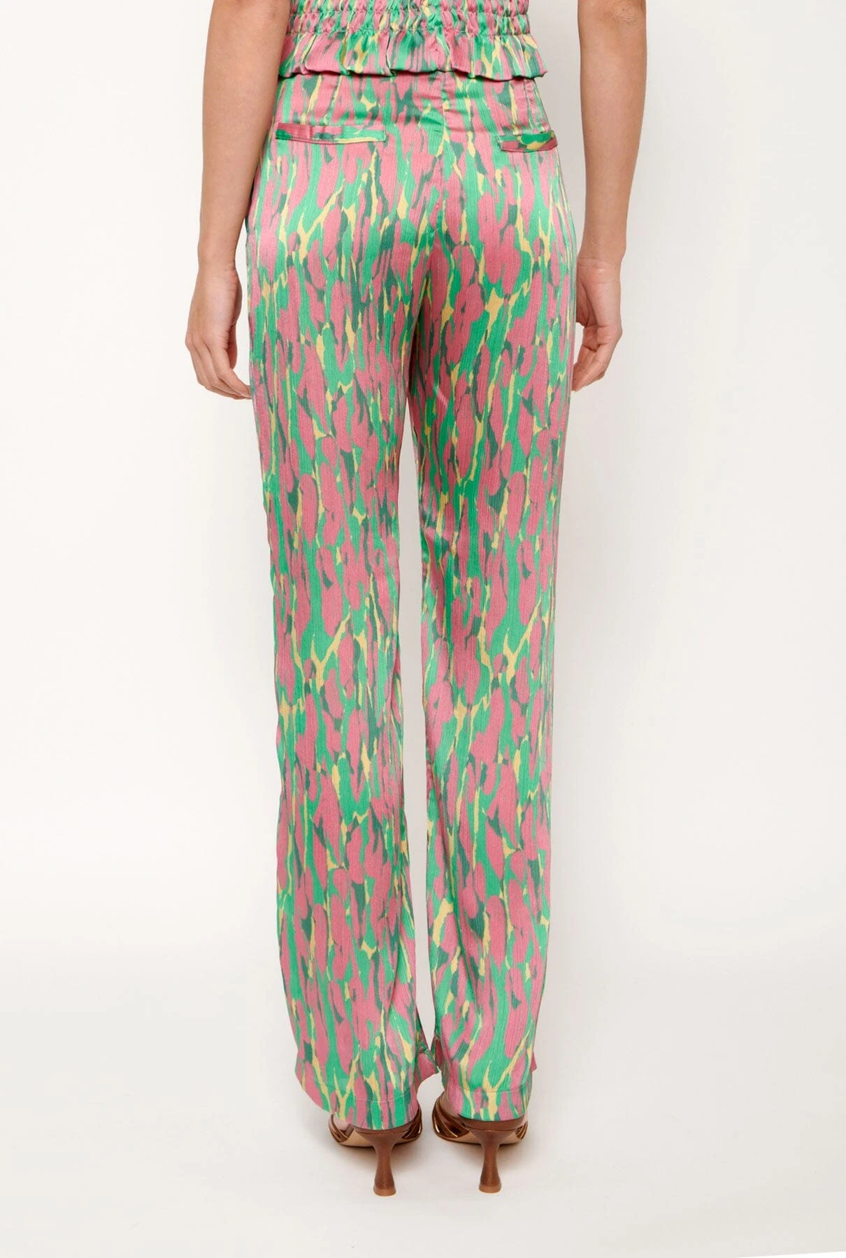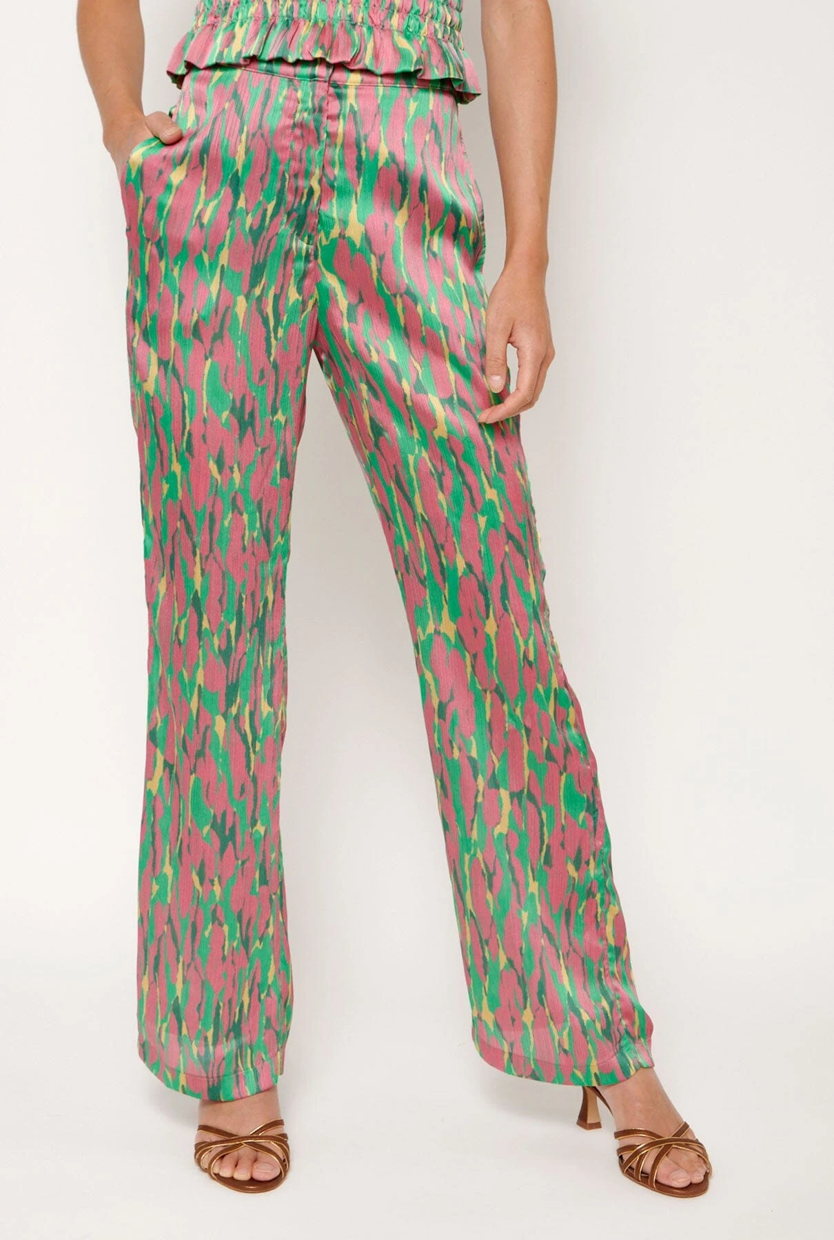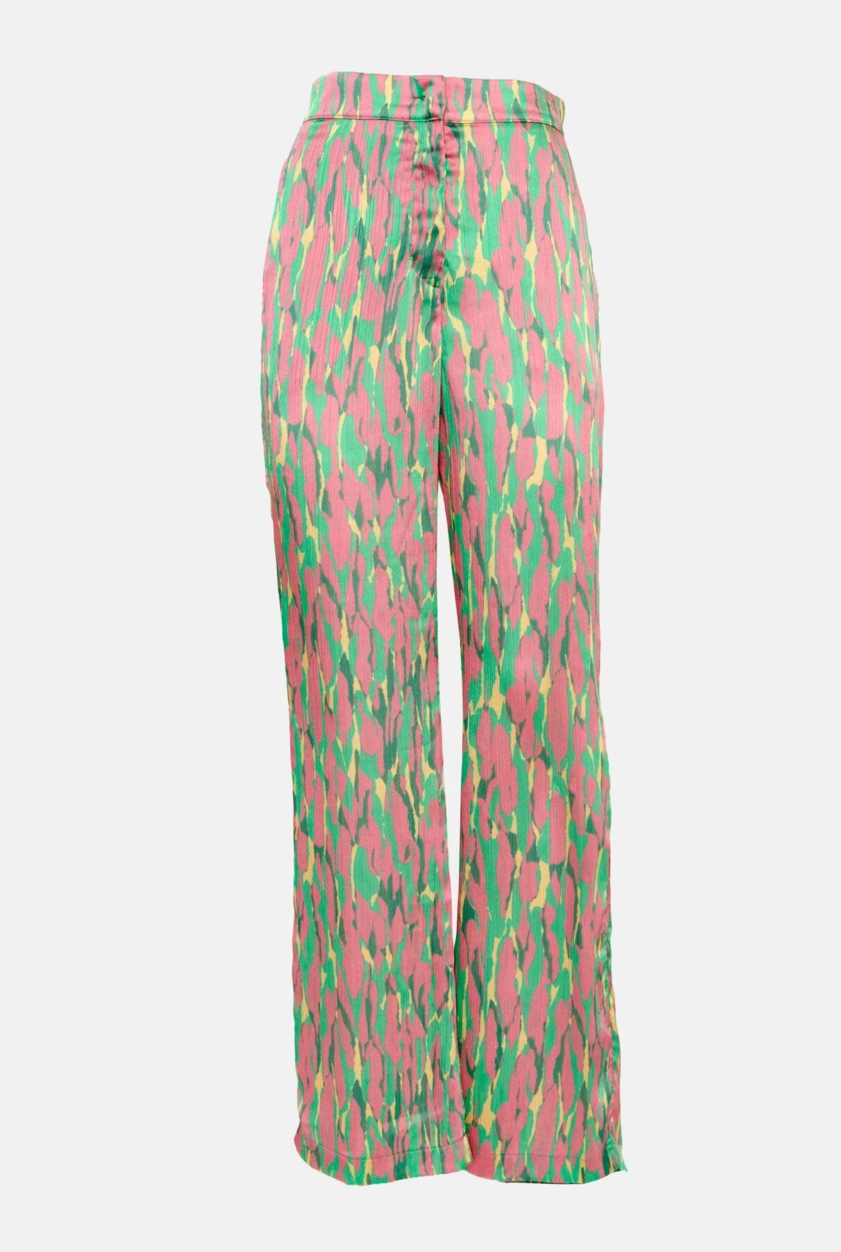 Palazzo-style pants, front closure with internal summary and zipper in red and beige printed fabric. Side seam pockets and false pocket detail on the back.
