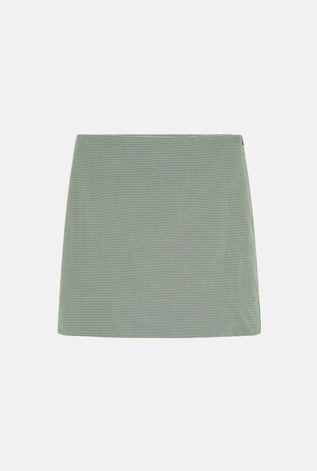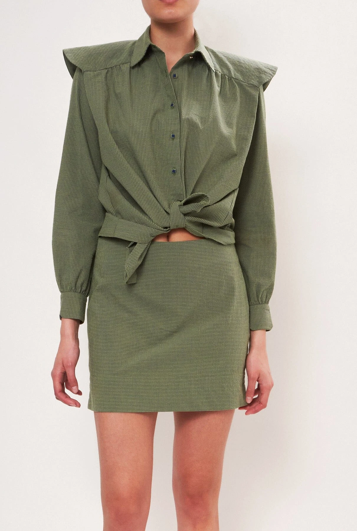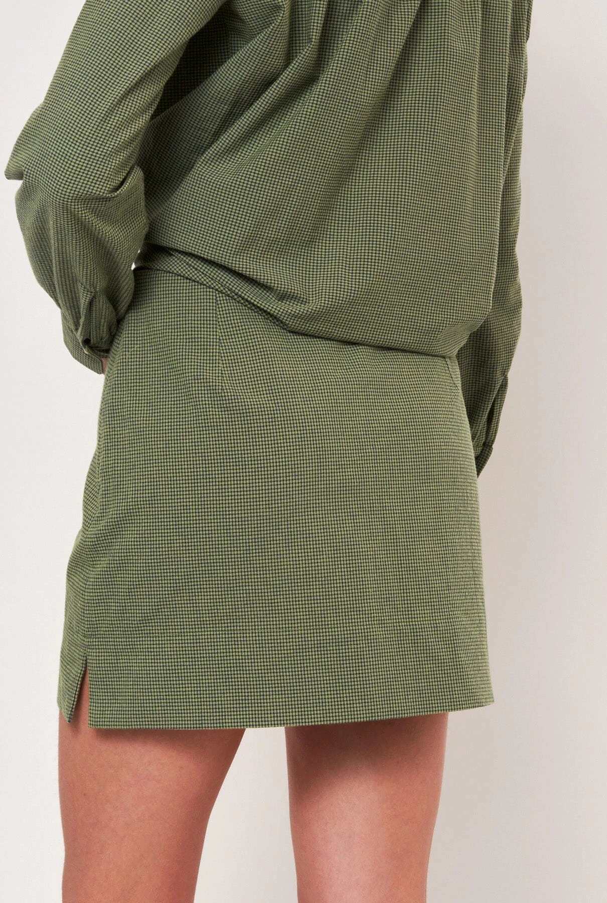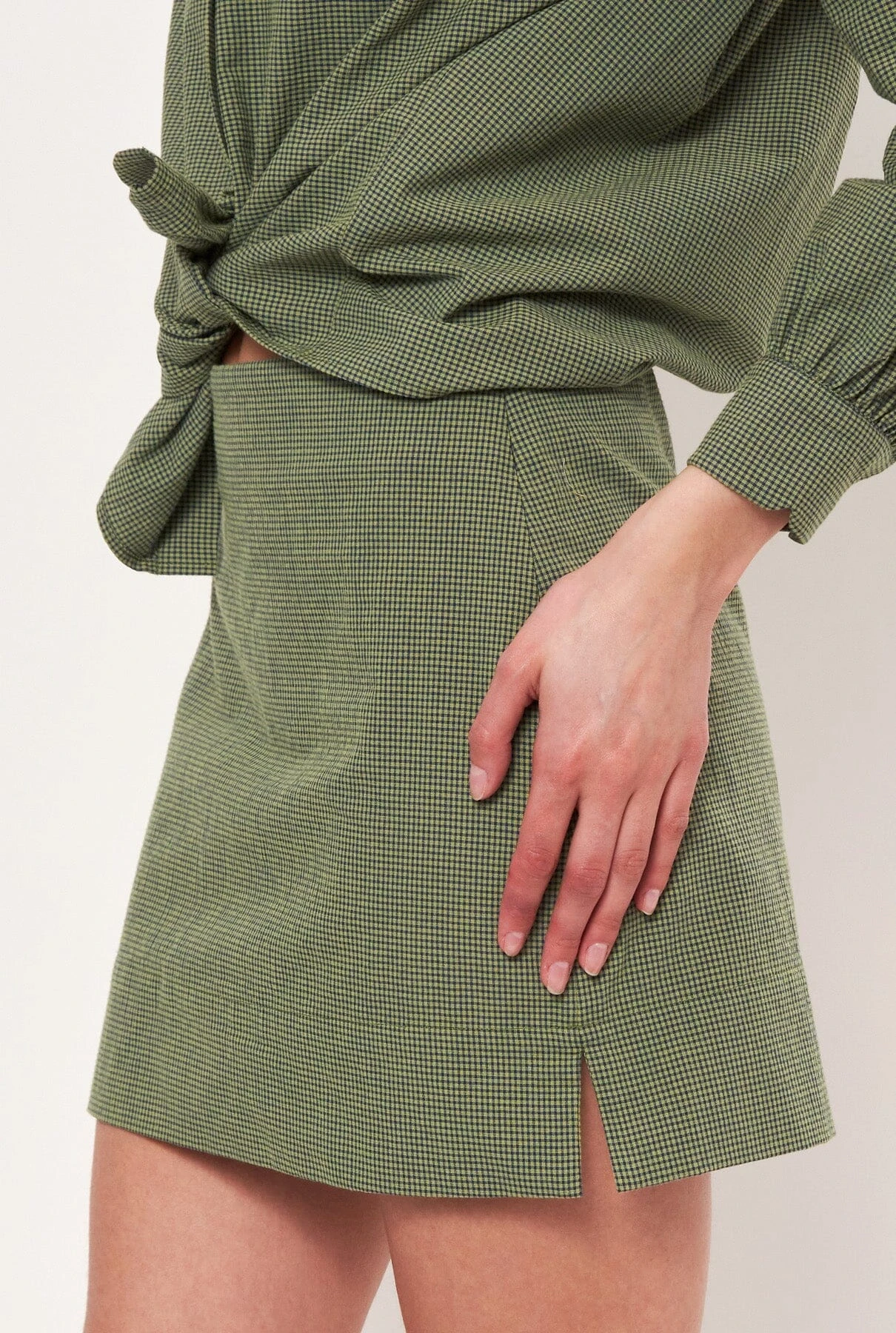 Straight mini skirt in green and navy blue microvichy. With 2 small side slits and zip fastening. For a complete look, combine it with the Miru olive shirt, Miru sleeveless or Marieta voile blue.