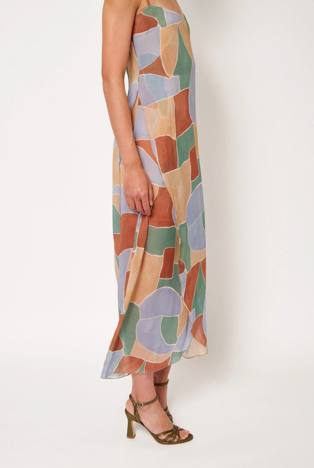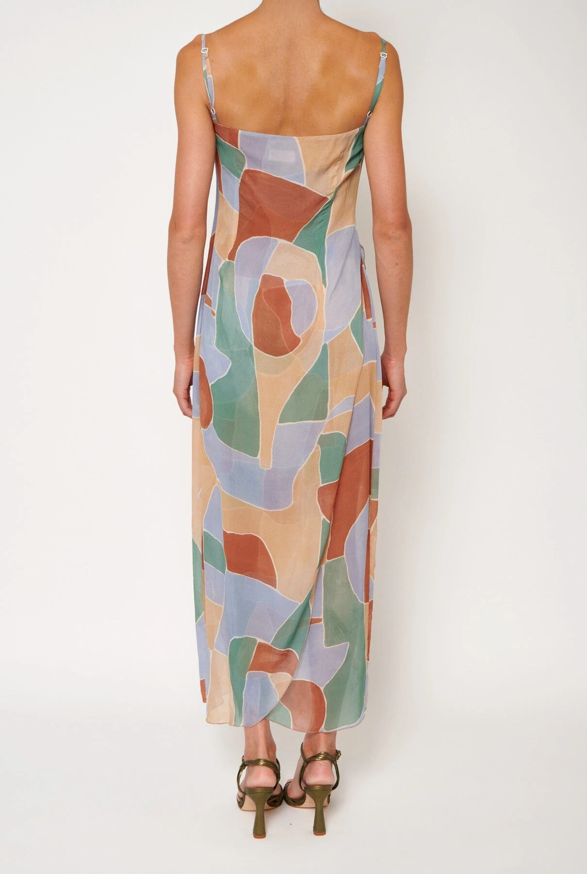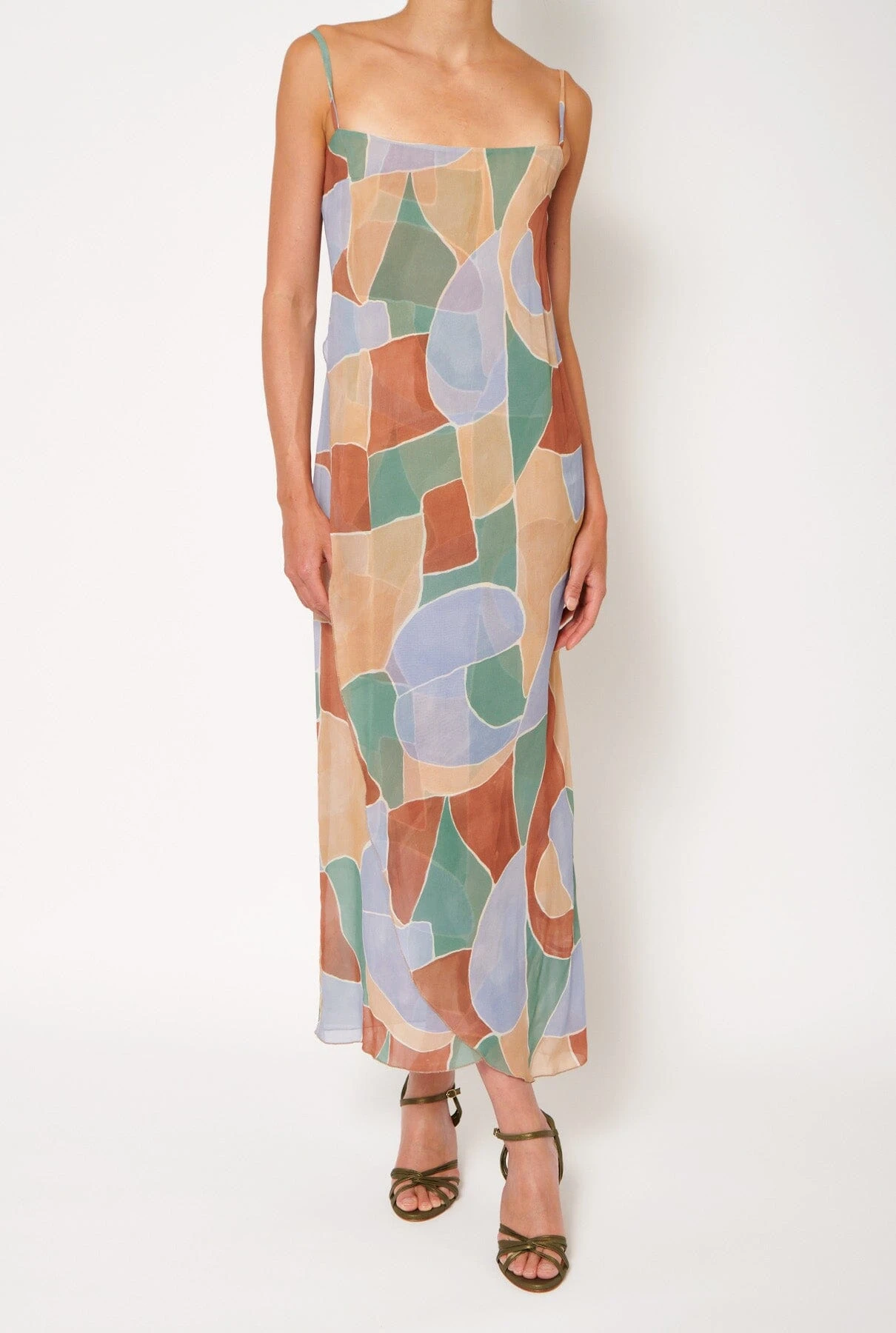 Long flowy dress made of a chiffon light fabric in different shades of blue.