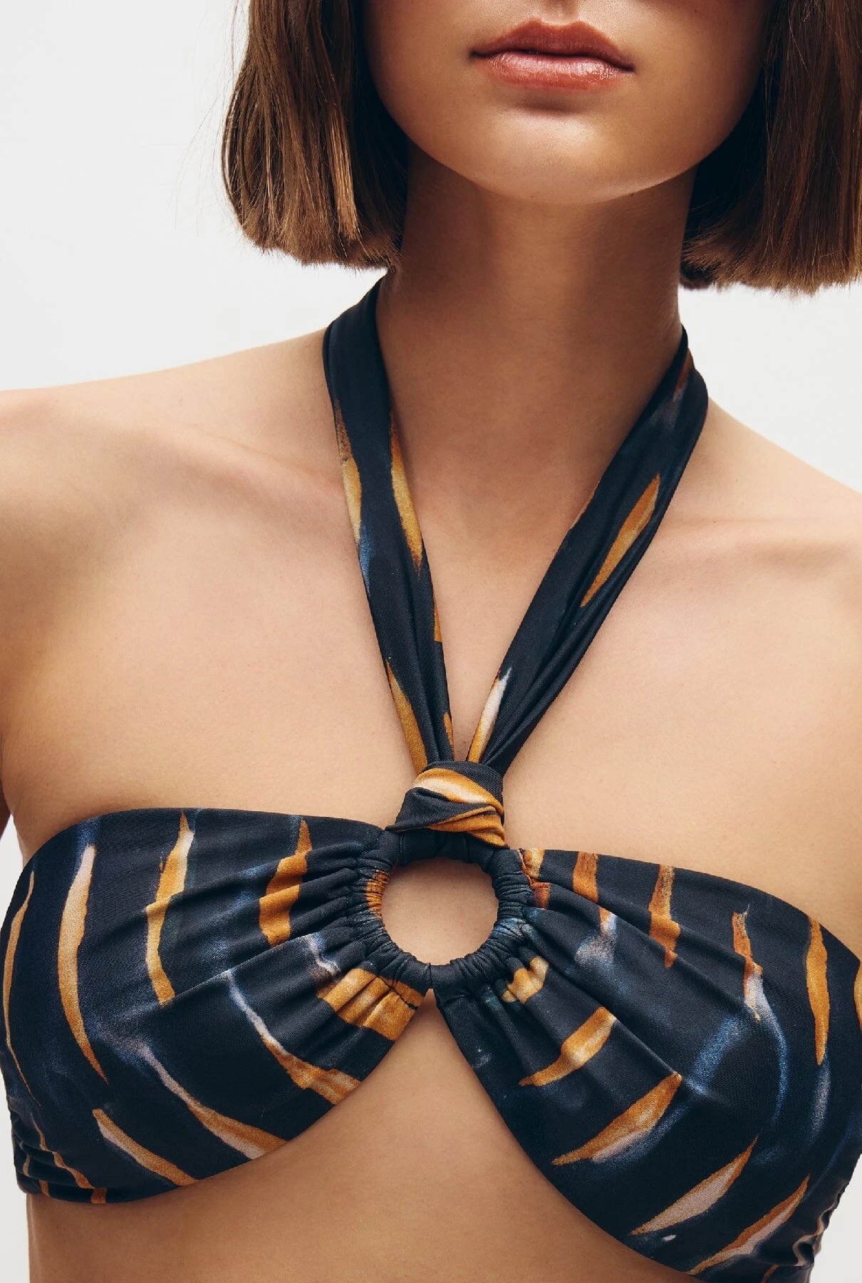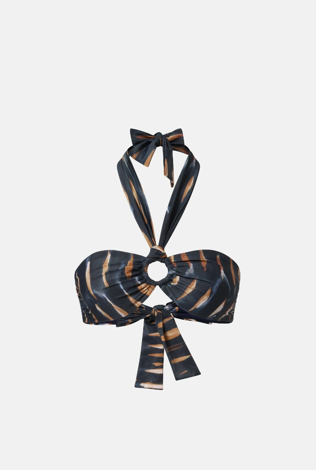 Bandeau bikini top with tie dye print and trim, removable foam and bow fastening.