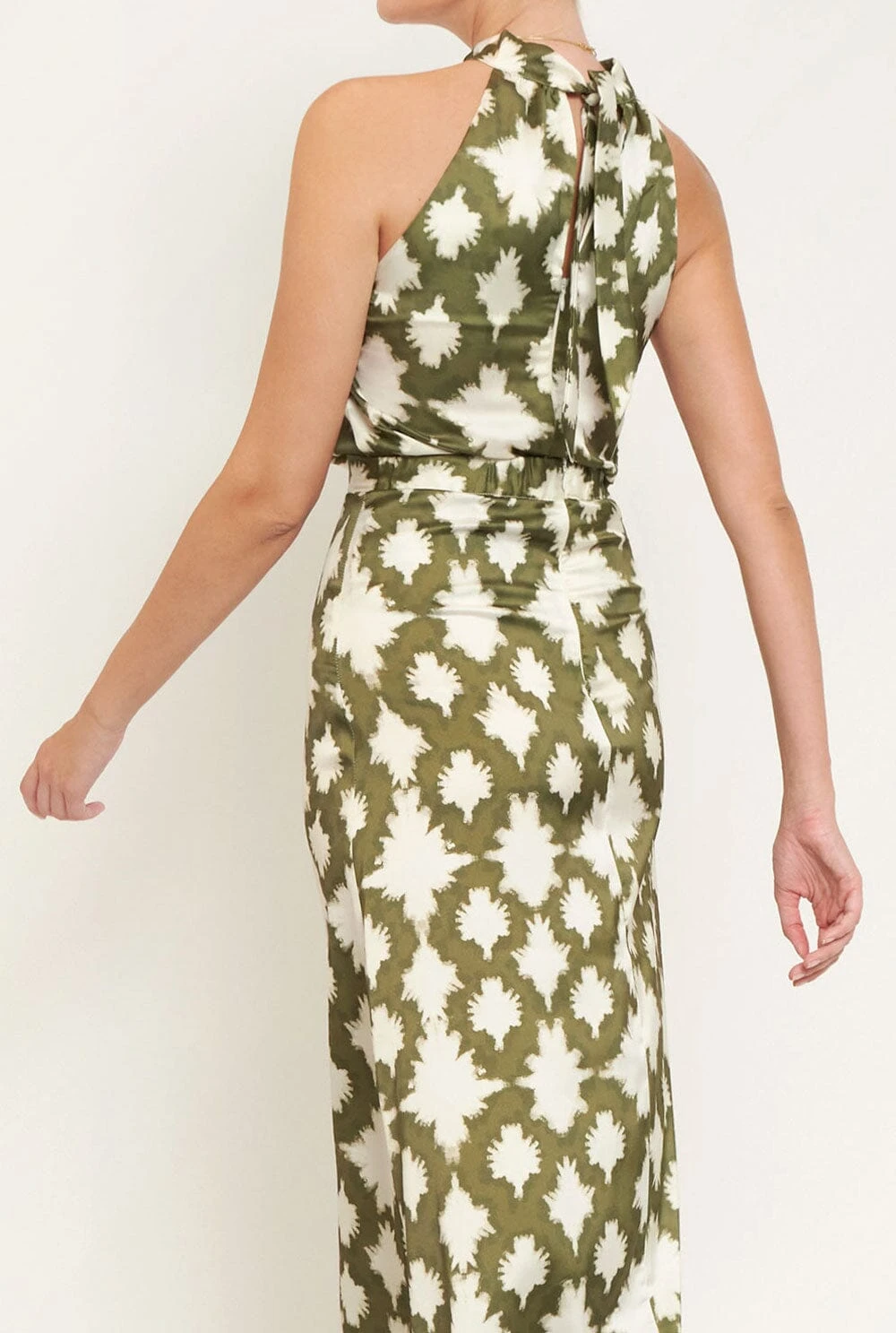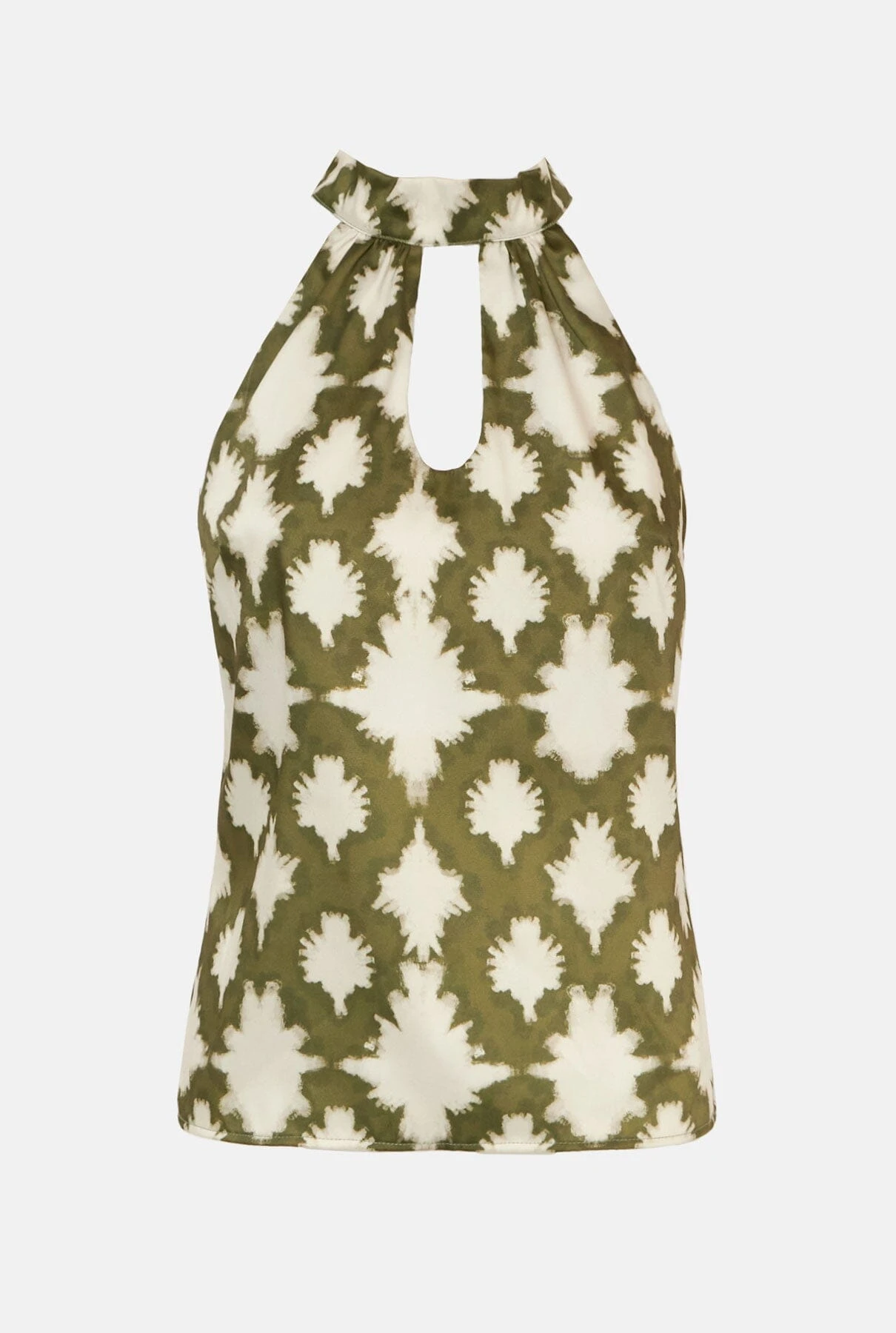 Halter-neck top in green and off-white printed fabric. Closure with back zip and back lace. Wash at 40 degrees, do not iron, do not tumble dry, do not dry clean and do not use bleach