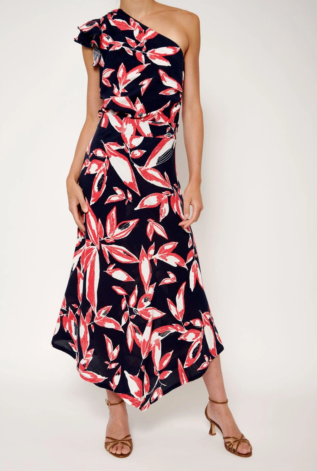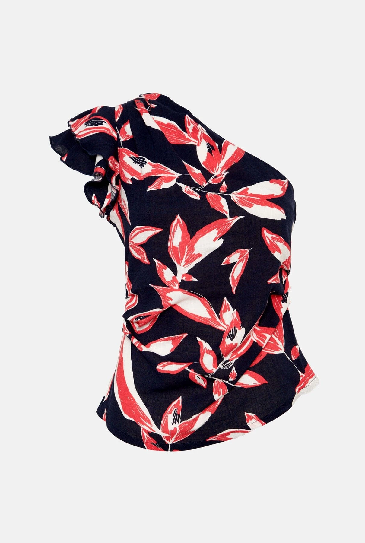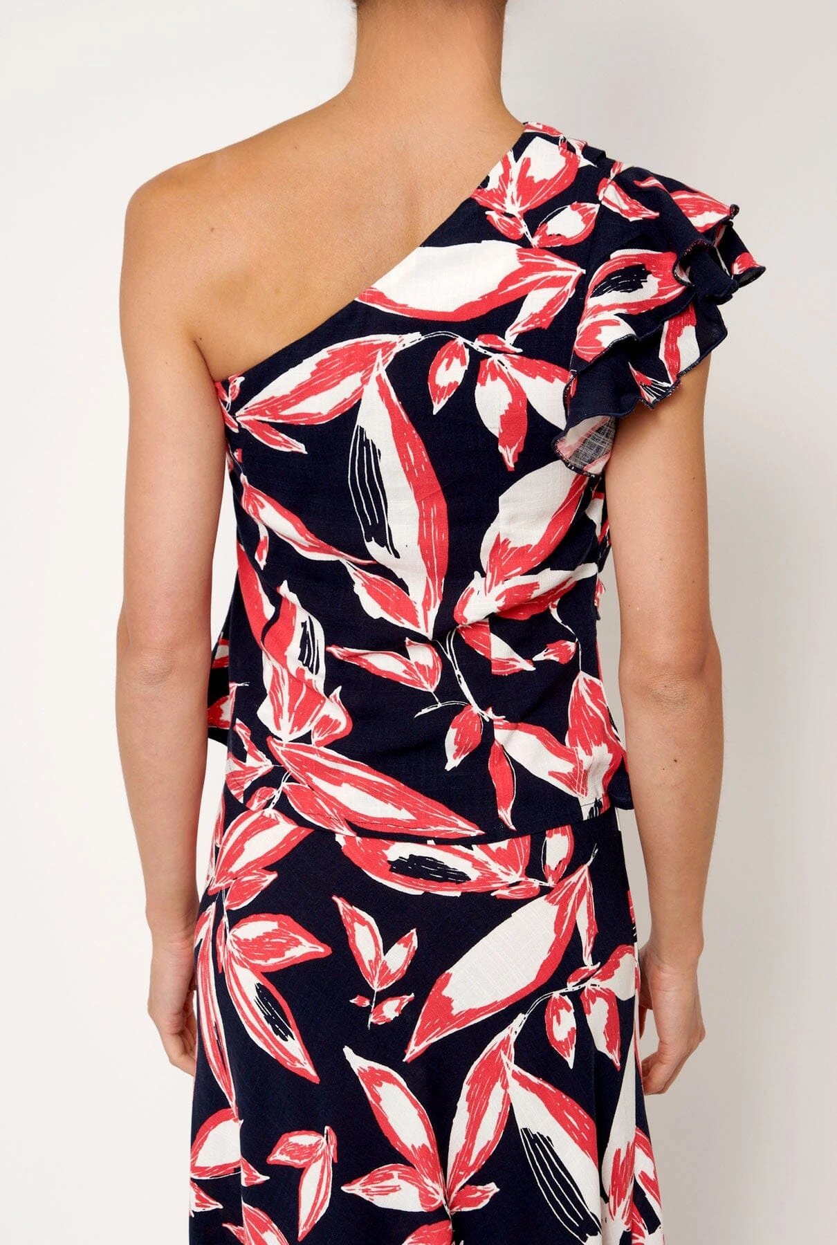 Asymmetrical top with ruffle on one shoulder. Printed fabric in navy, red and white.