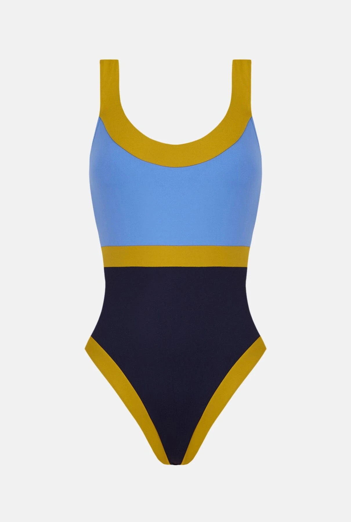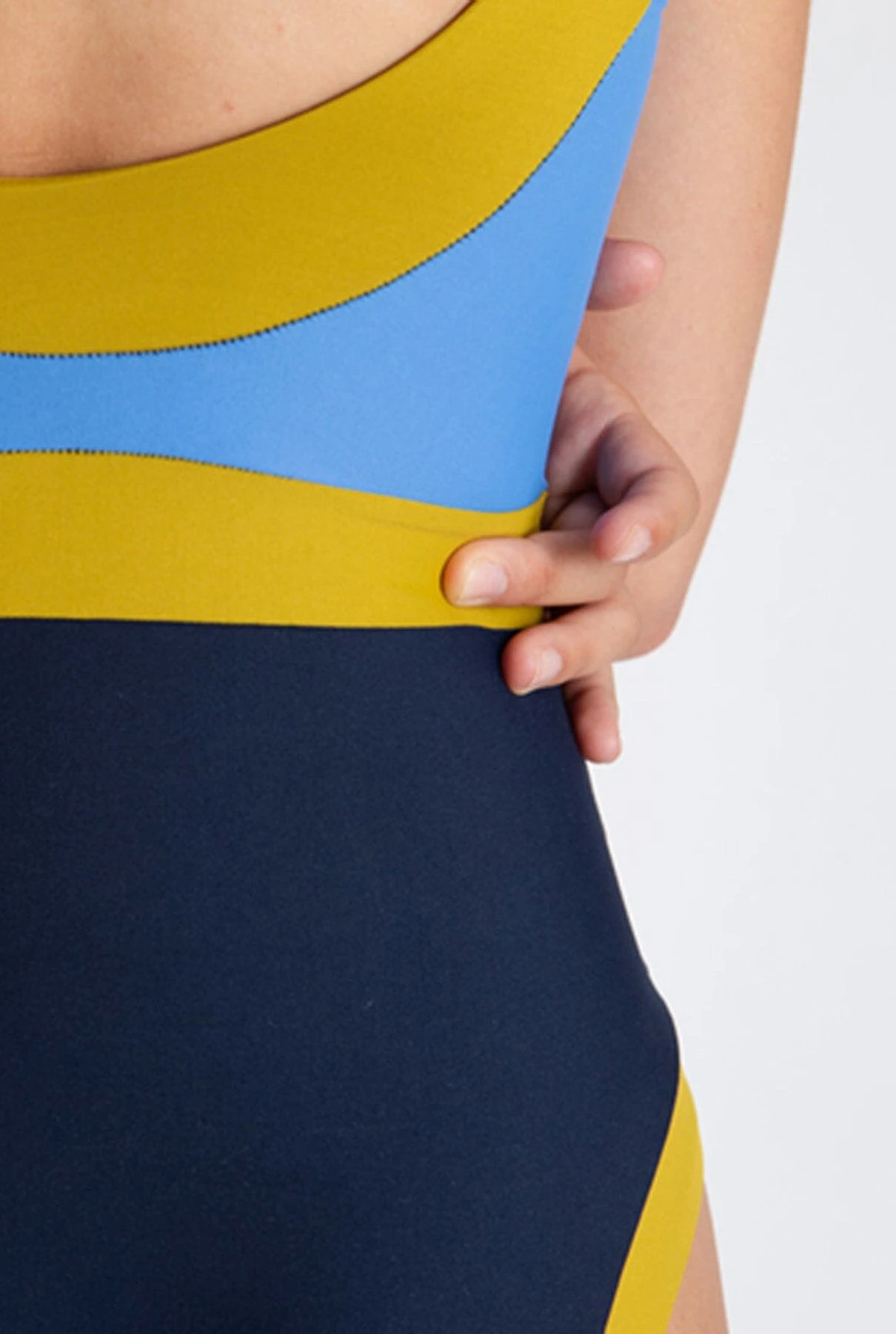 Elegant and super comfortable swimsuit. With a purple inner lining, removable cups and summary detail on straps. The contrasting mustard waistband adds a touch of freshness and style, while the round neckline in both front and back provides perfect coverage and a sophisticated look. With a higher leg cut than the rest, it provides a streamlined look. Its high back offers a comfortable fit and good bust support. It stands out for its soft and pleasant fabric.