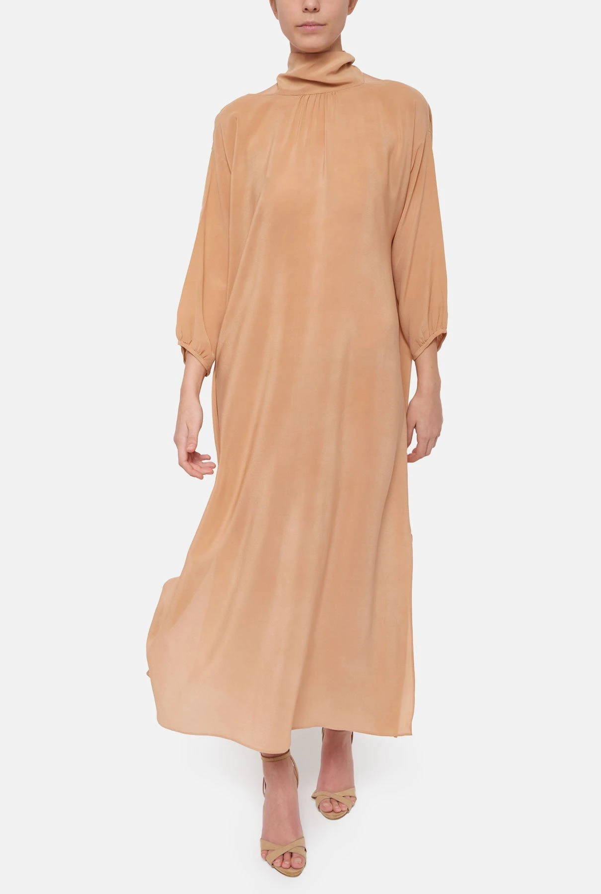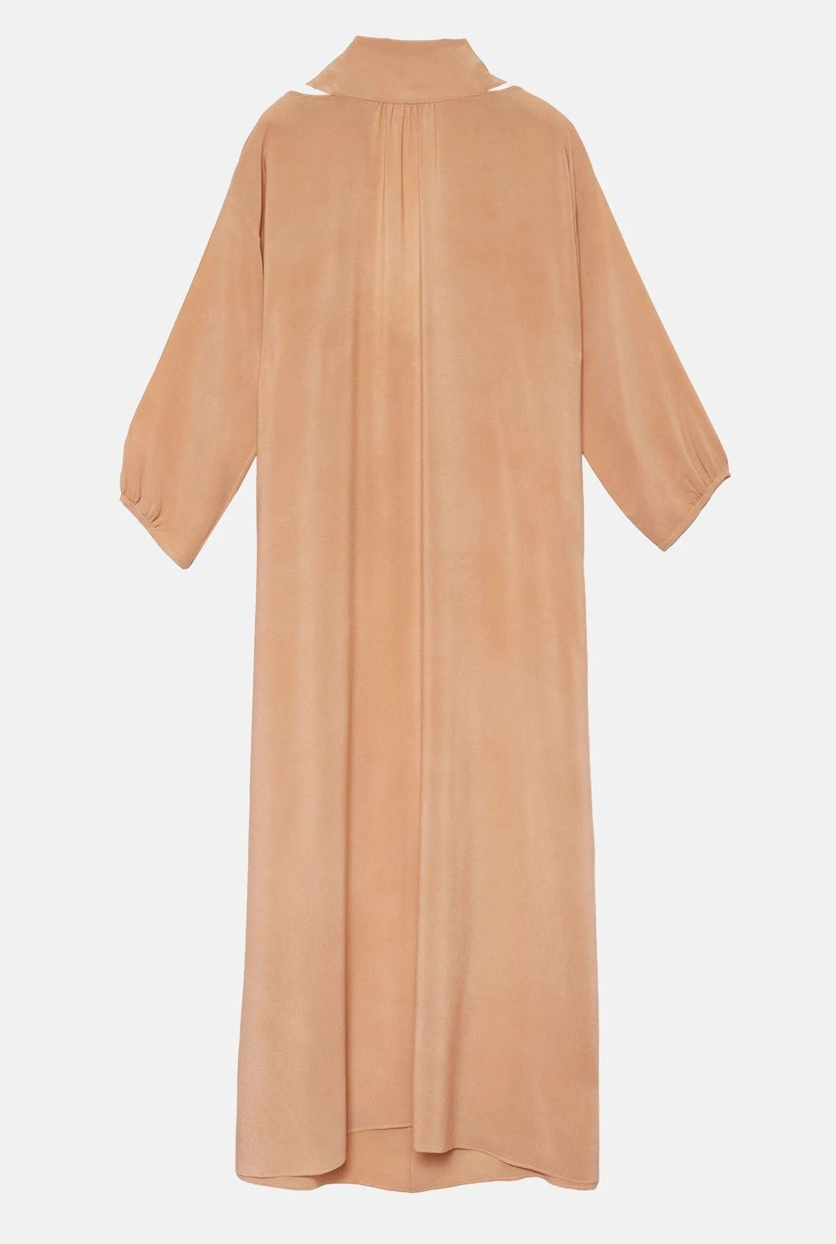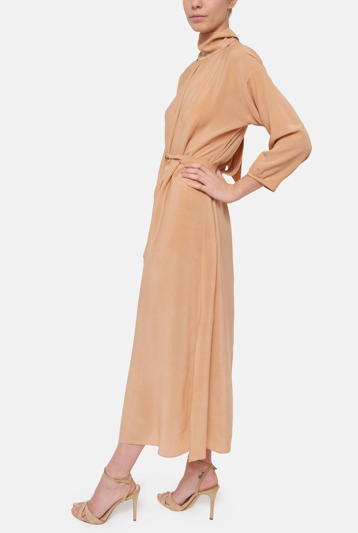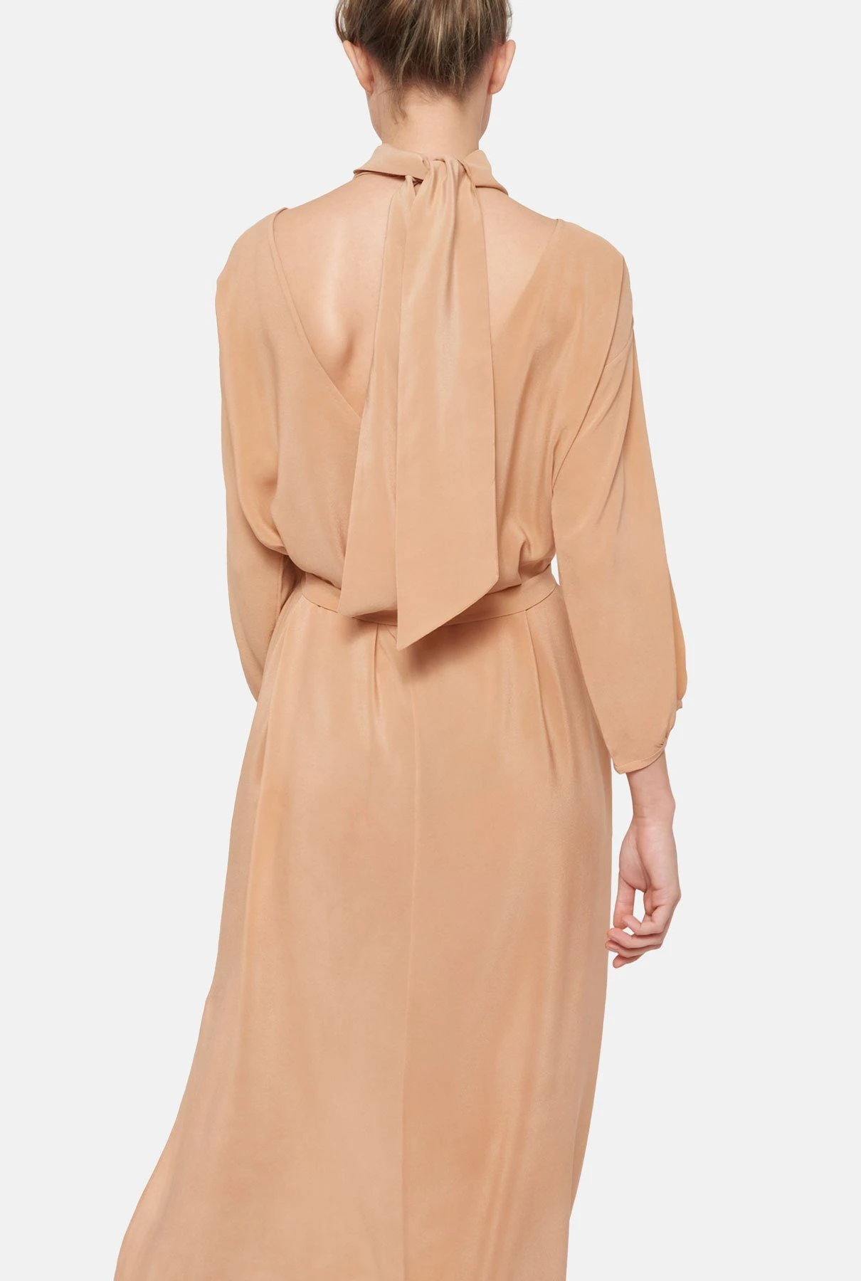 The «Valentina» is a midi length fluid dress, with a two-tone long neck tie and a matching belt, 3/4 gathered cuff sleeves and round open back. Slit on both sides to create more fluidity.