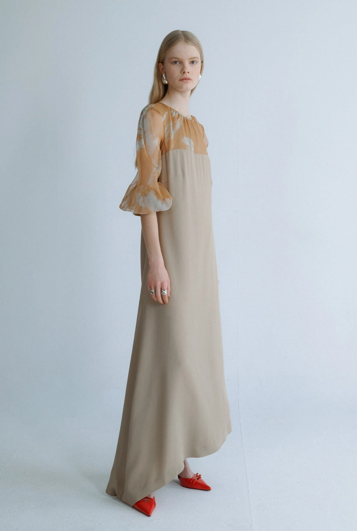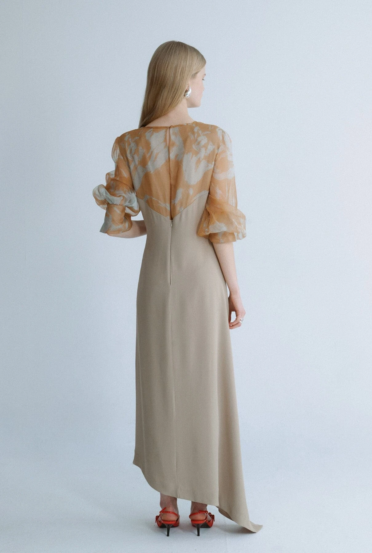 Miguel Marinero dress in stone-coloured crepe with printed organza detail on the neckline and sleeves. Round neckline, asymmetric hem and transparent sleeves. Sophisticated dress for guests and special occasions.