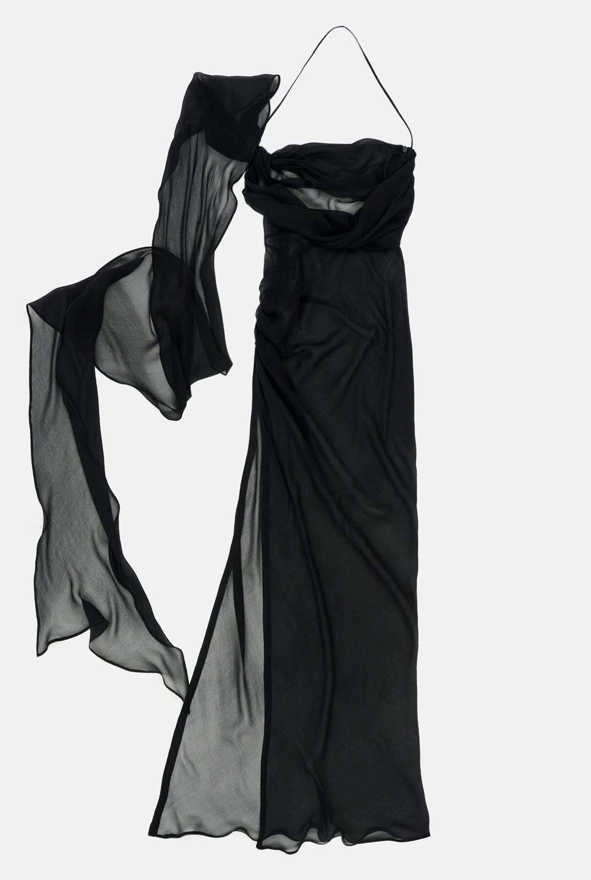 Asymmetrical bias binding dress with side front summarying, ending in a maxi opening. Designed by Juan Vidal.