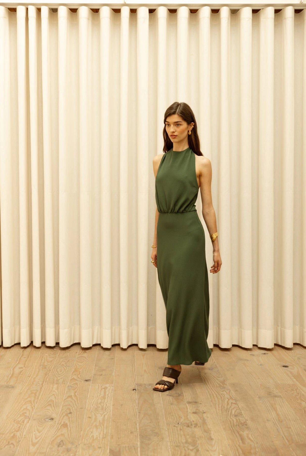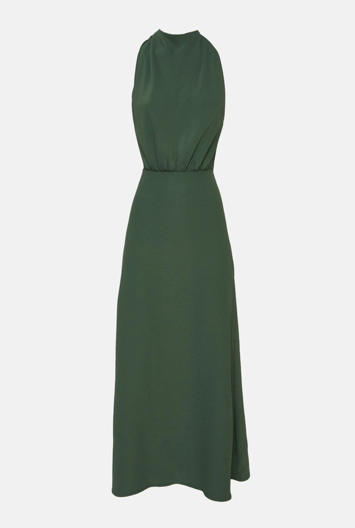 Halter neckline midi dress with low-cut back (high enough to wear a bra). It has a gathering at the front of the top at the waist. The skirt of the dress is flared.