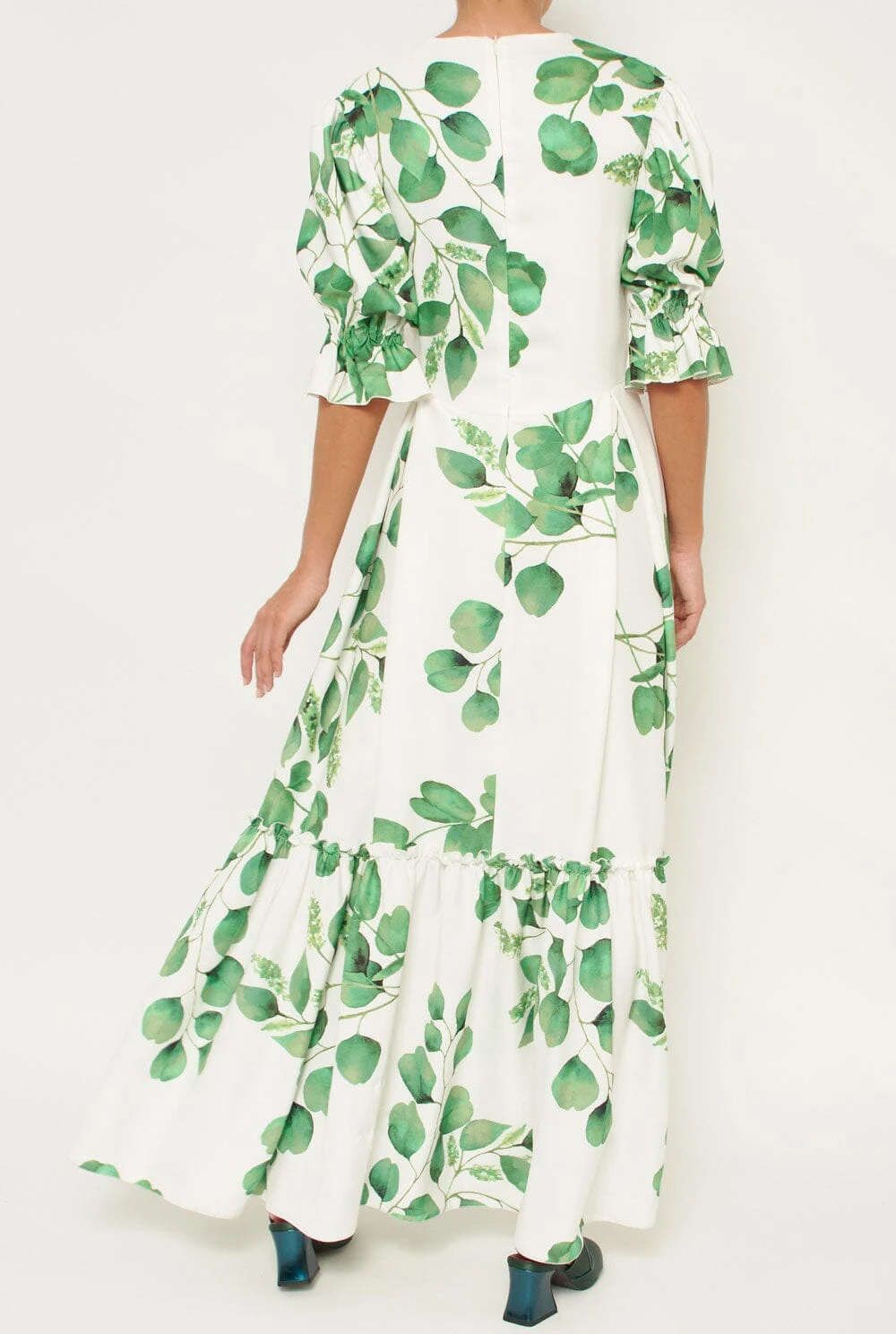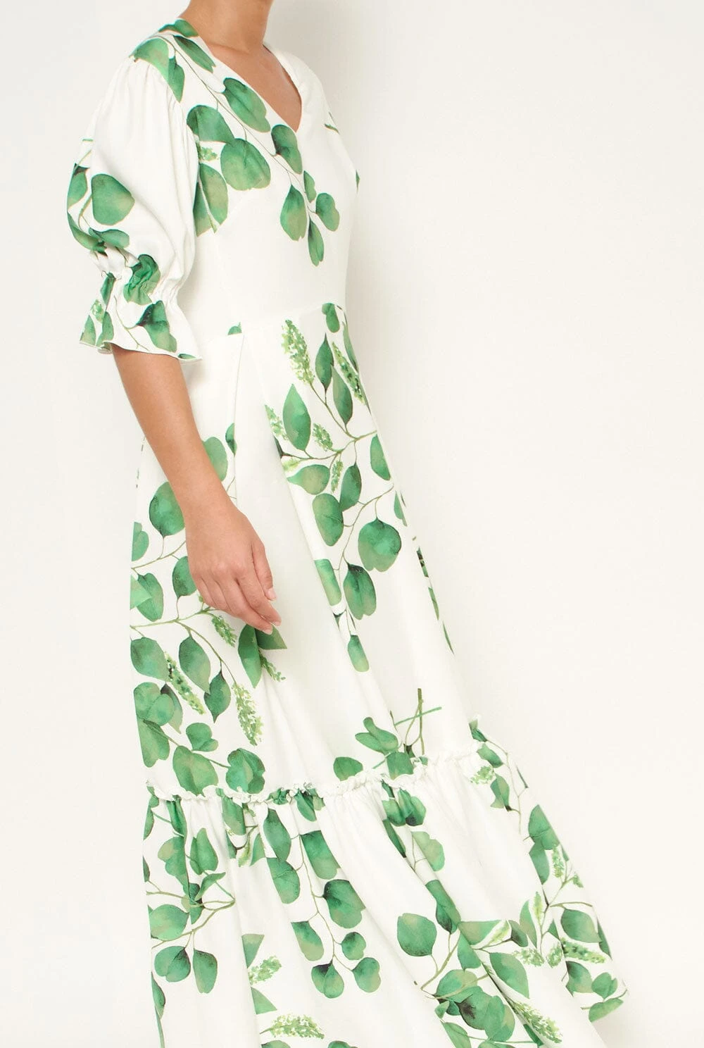 Dress with V-neckline. Long with a large ruffle. Slightly puffed sleeve with a small ruffle at the end. Cut at the waist and back closure with invisible zip. Designed by Devota & Lomba.