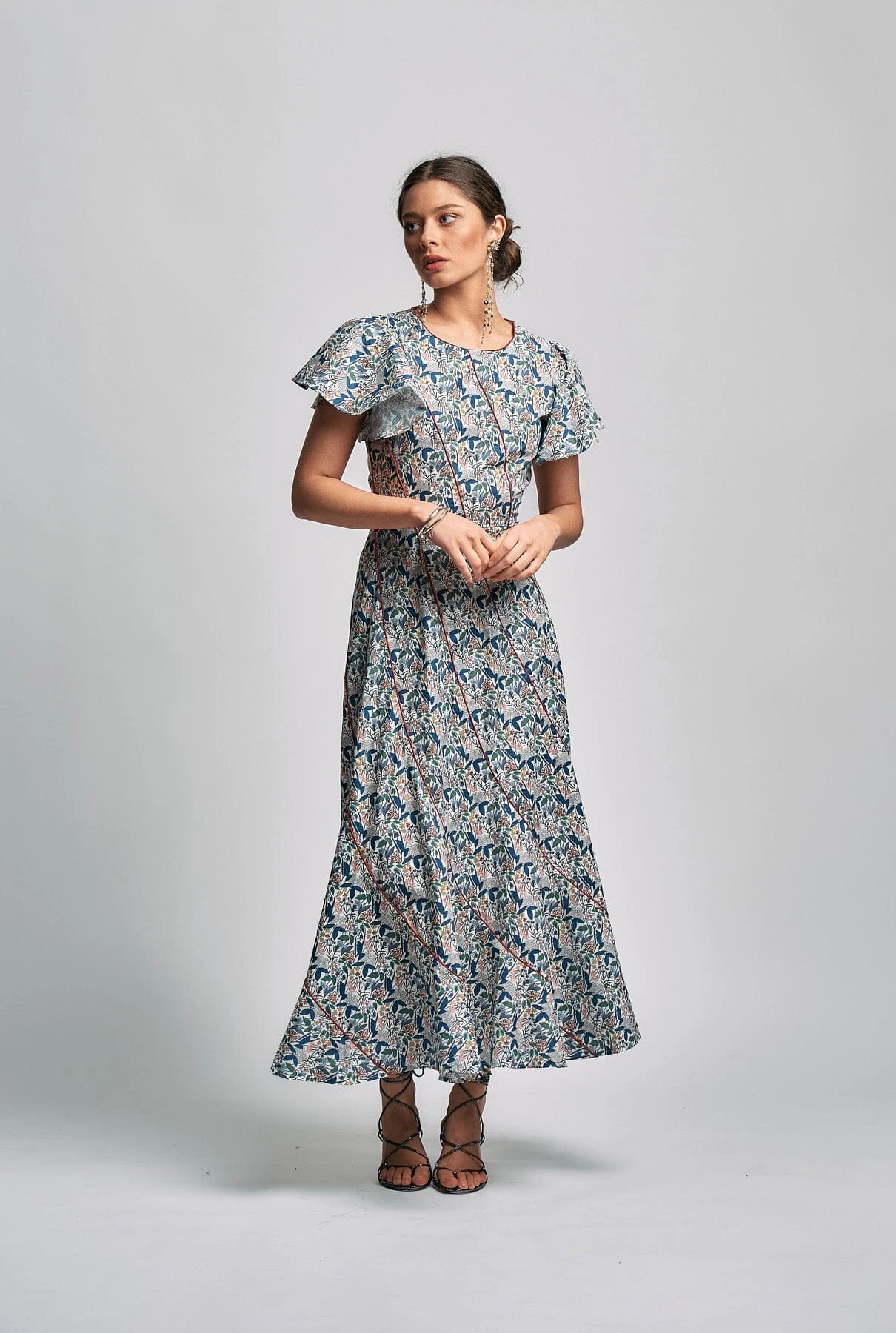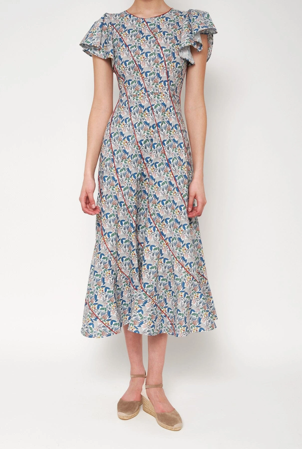 We present our latest version of the Lolita dress, super feminine with its curved cuts and ruffled sleeves. This time in a floral liberty print with contrasting tile trim;