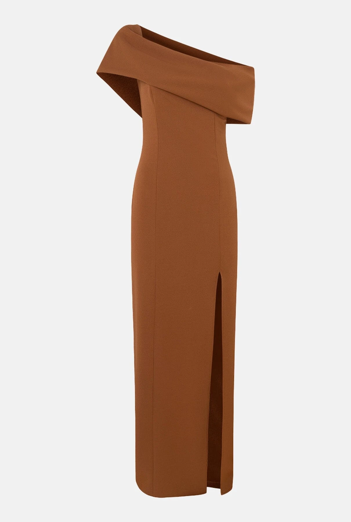 Long brown knitted crepe dress, bardot neckline and skirt opening.
