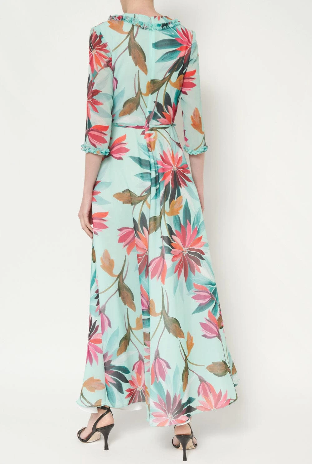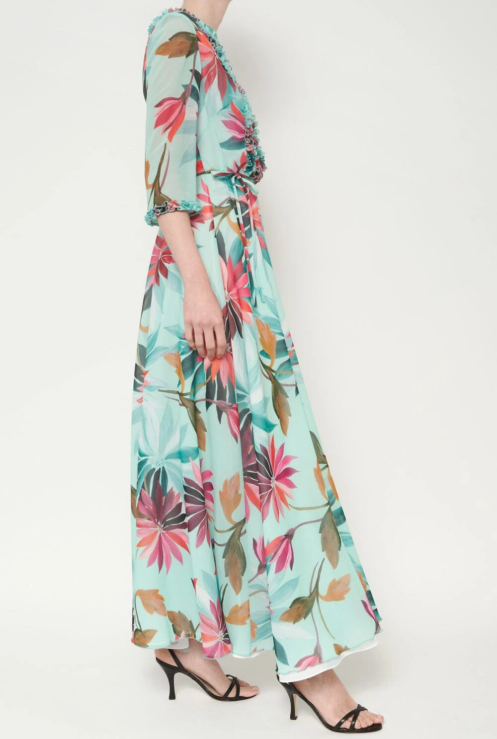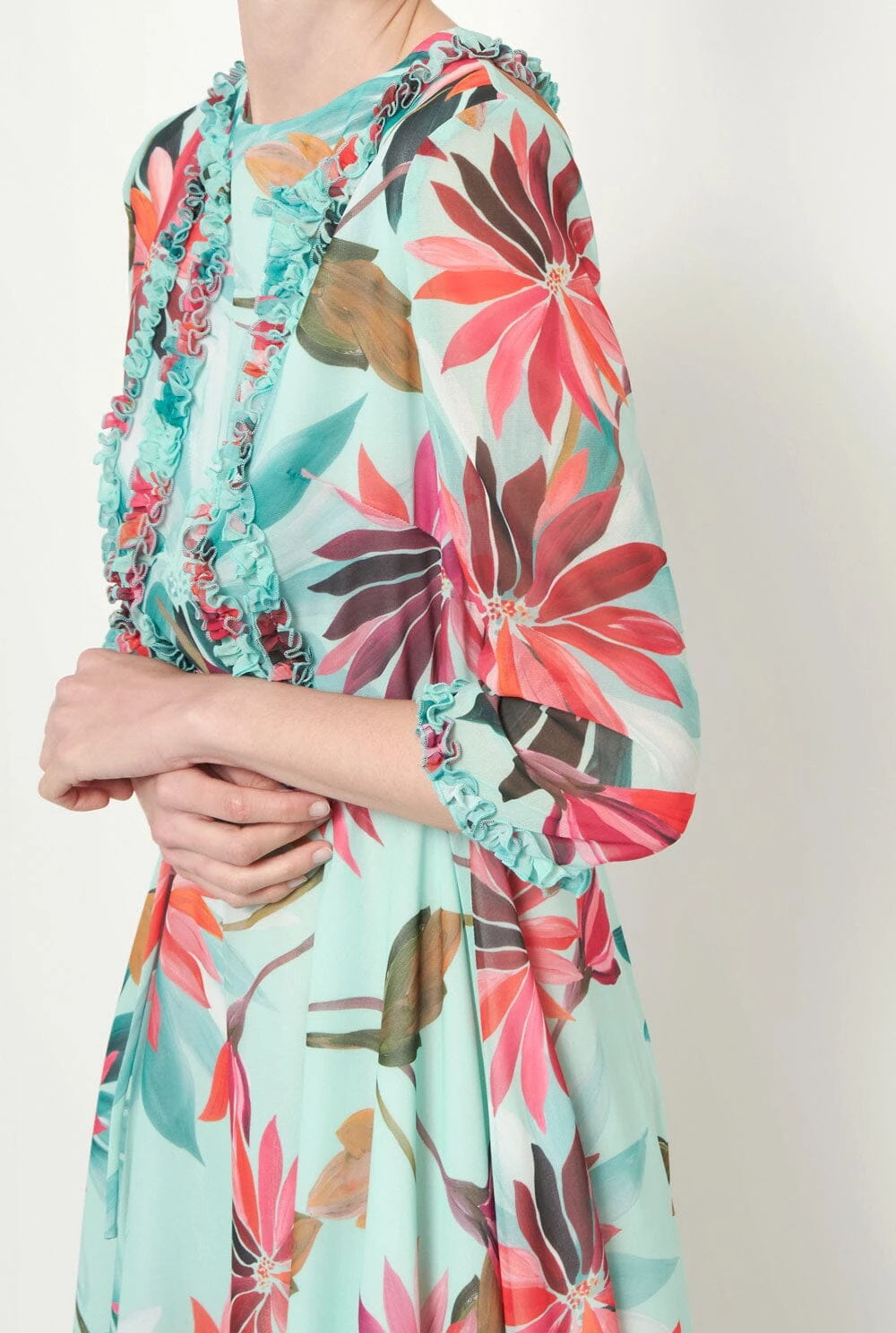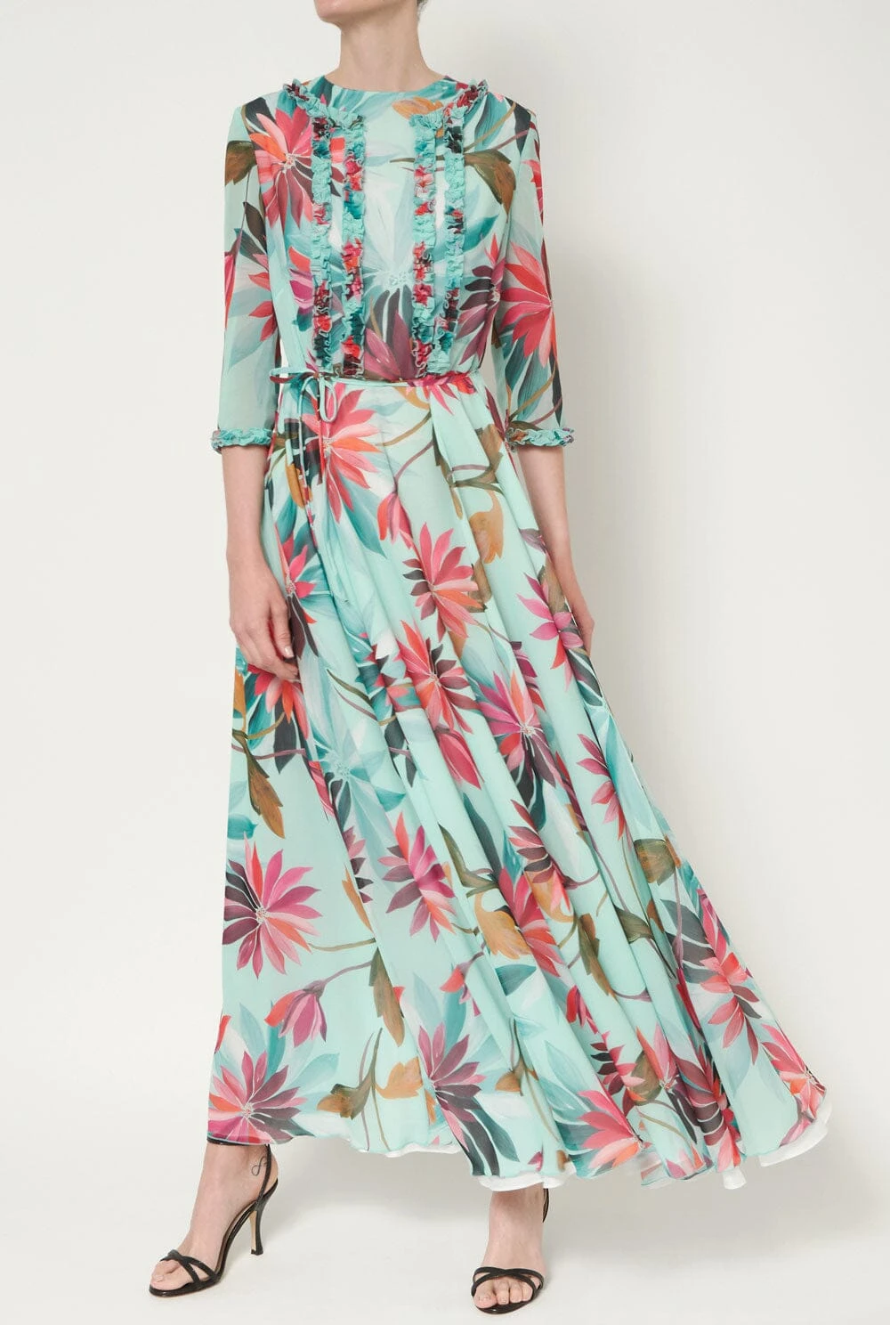 Semi-sheer floral dress with aqua blue background. Designed by Devota & Lomba.