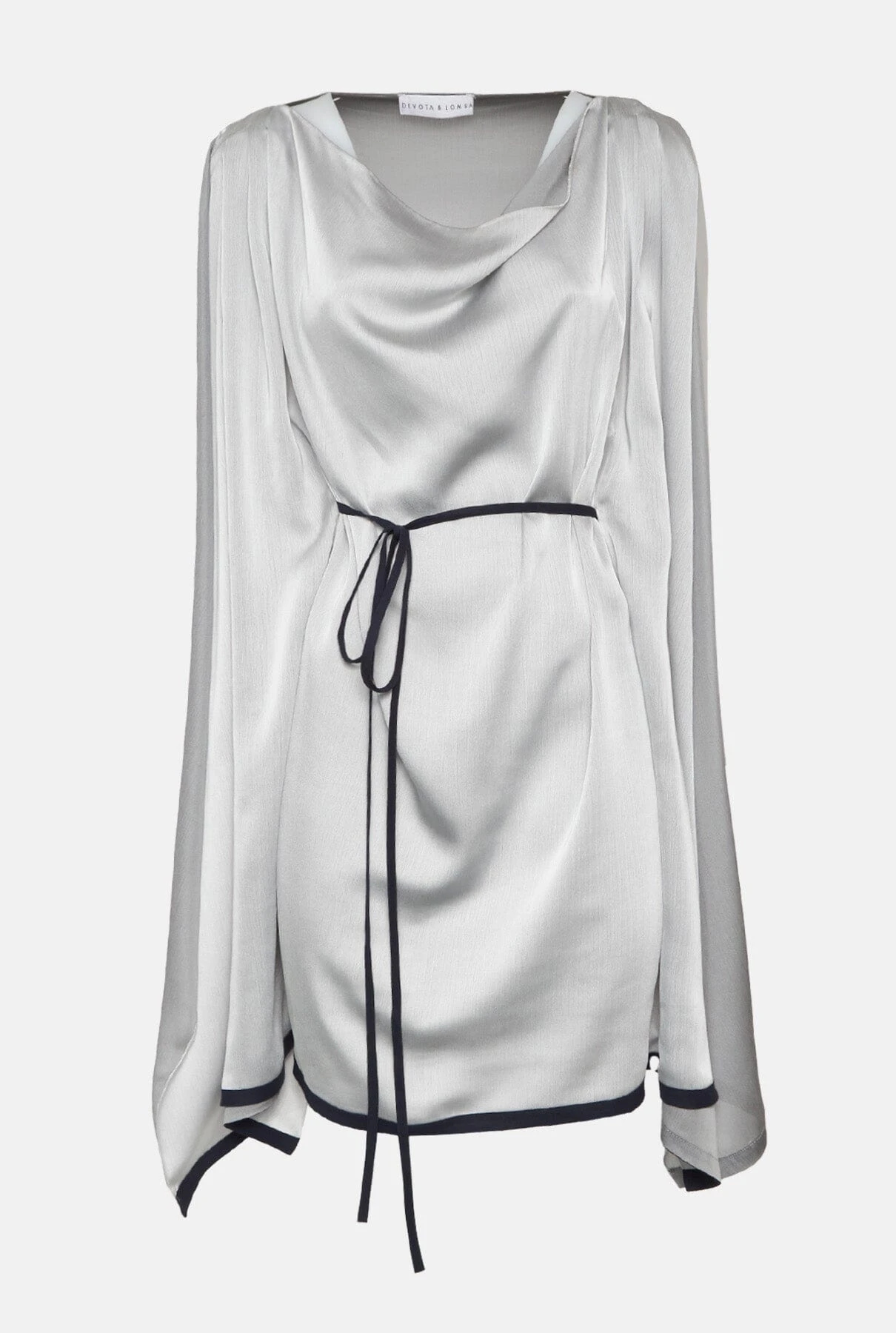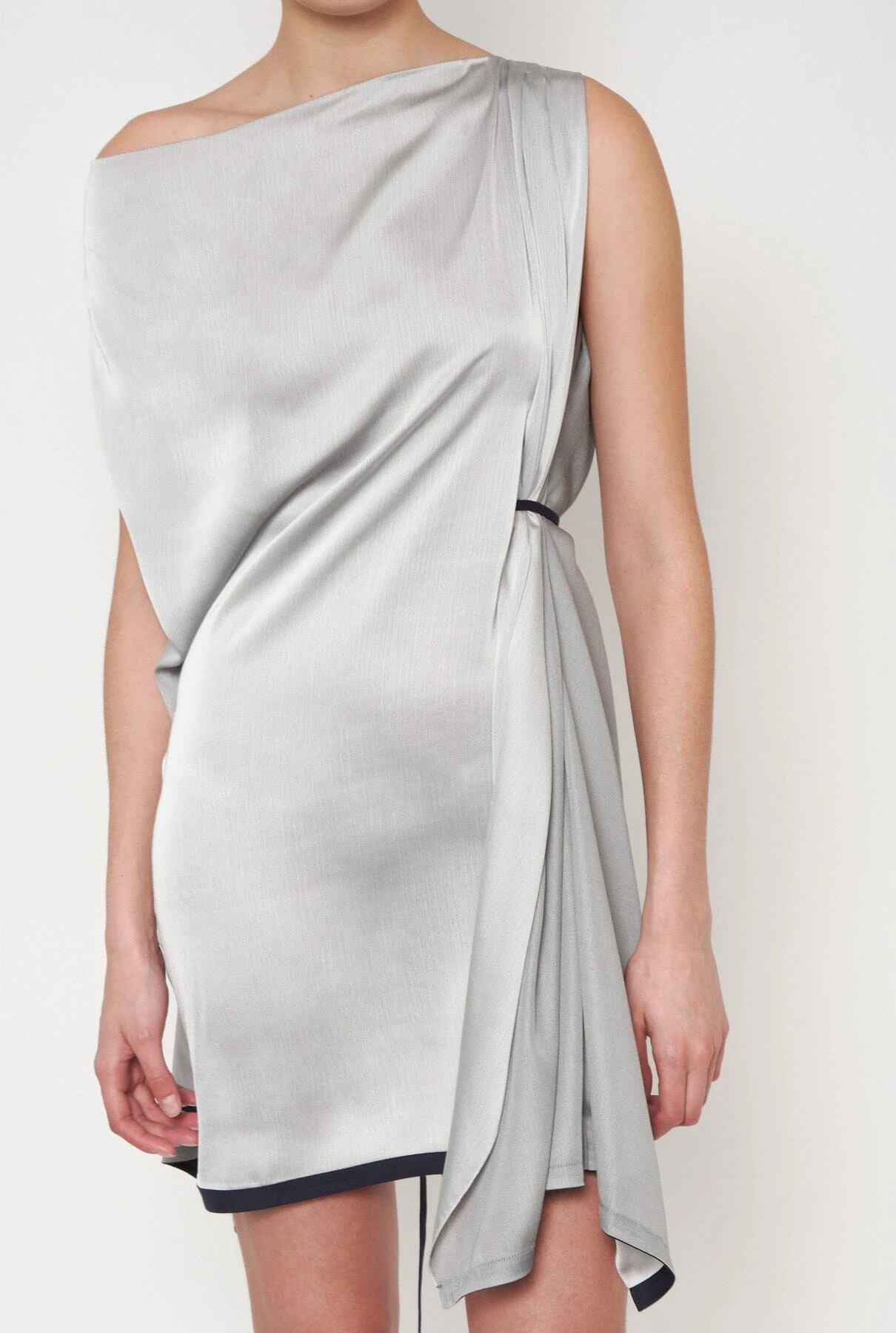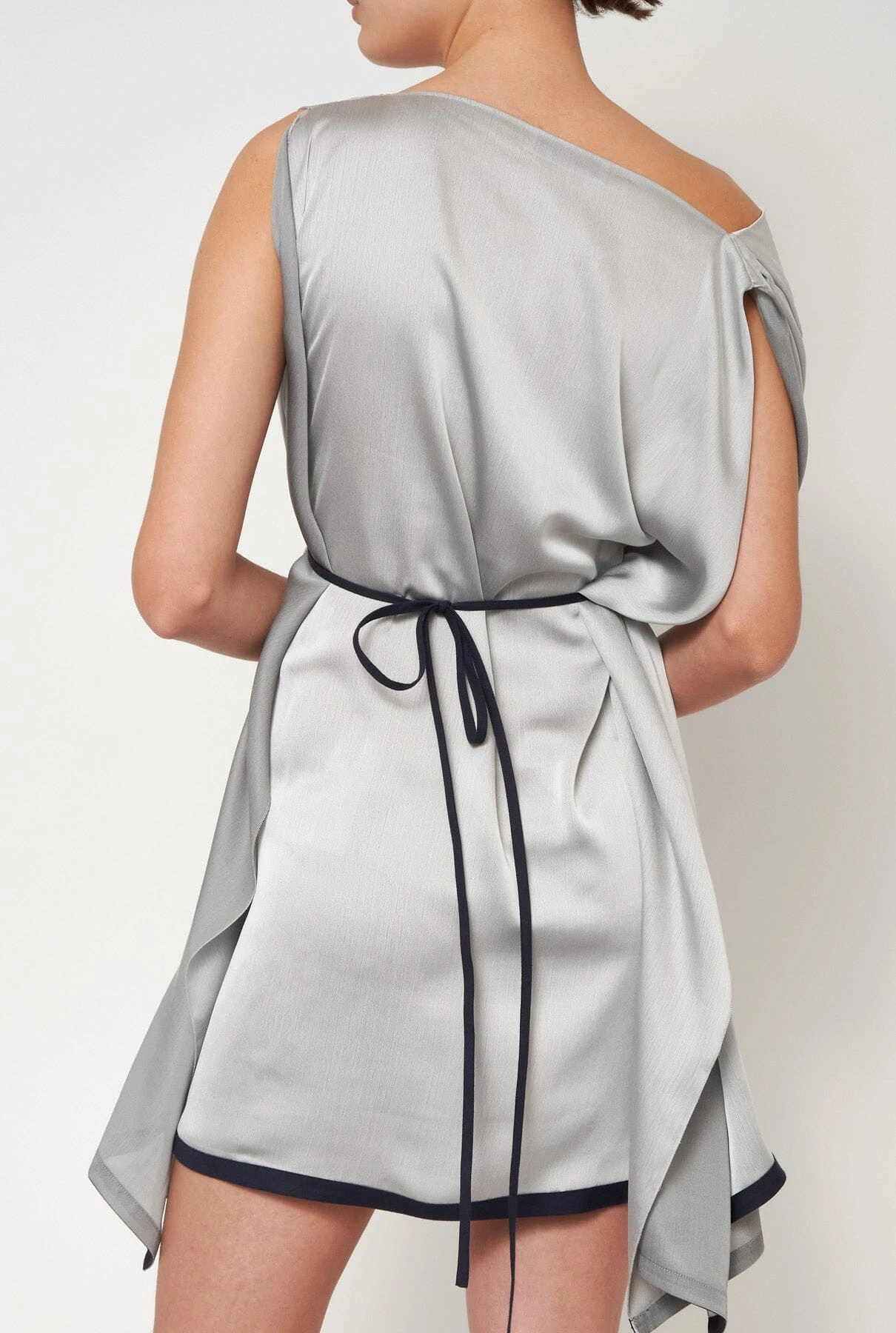 Short grey dress with navy blue waistband and blue piping at the hem.