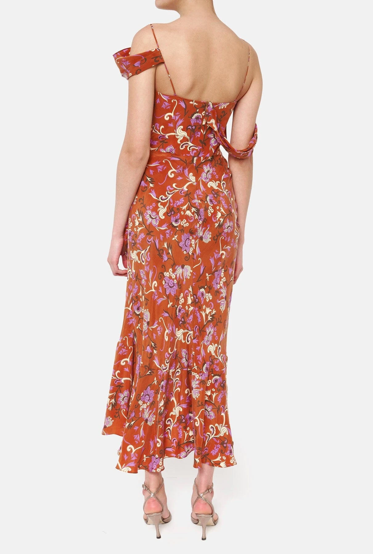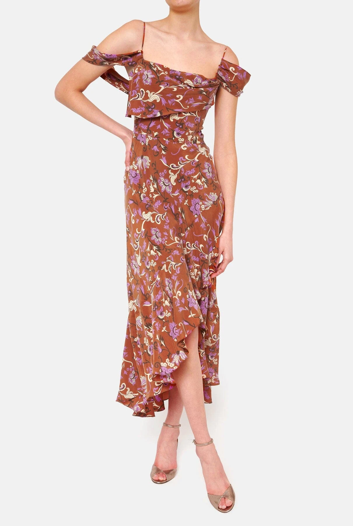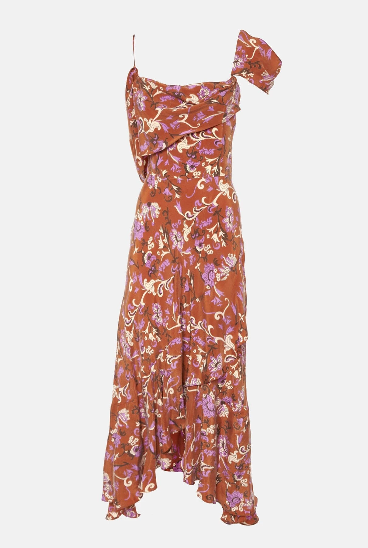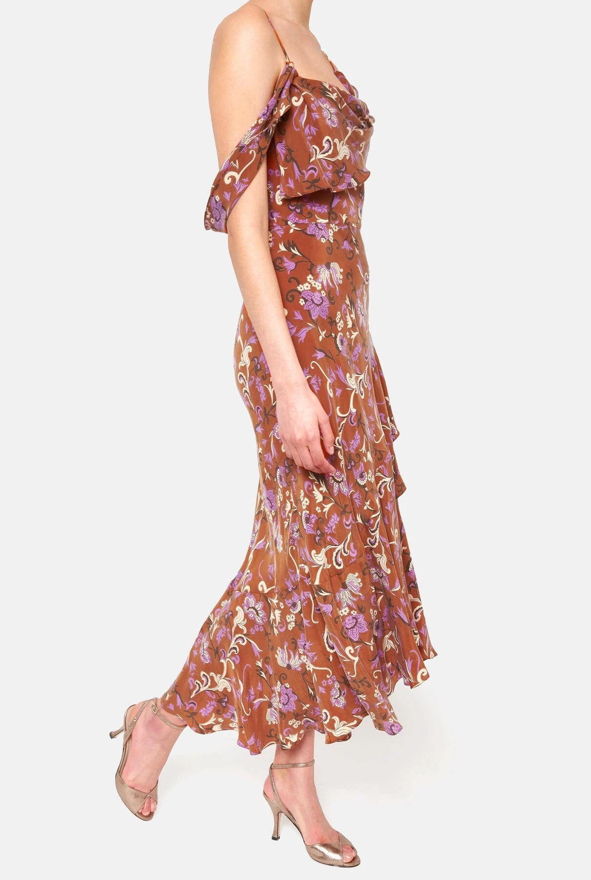 Strapless dress with draping on the chest and shoulder straps, with a flattering narrow silhouette at the waist and a bias skirt with crossed flounce, with floral motifs in shades of caldera and beige.