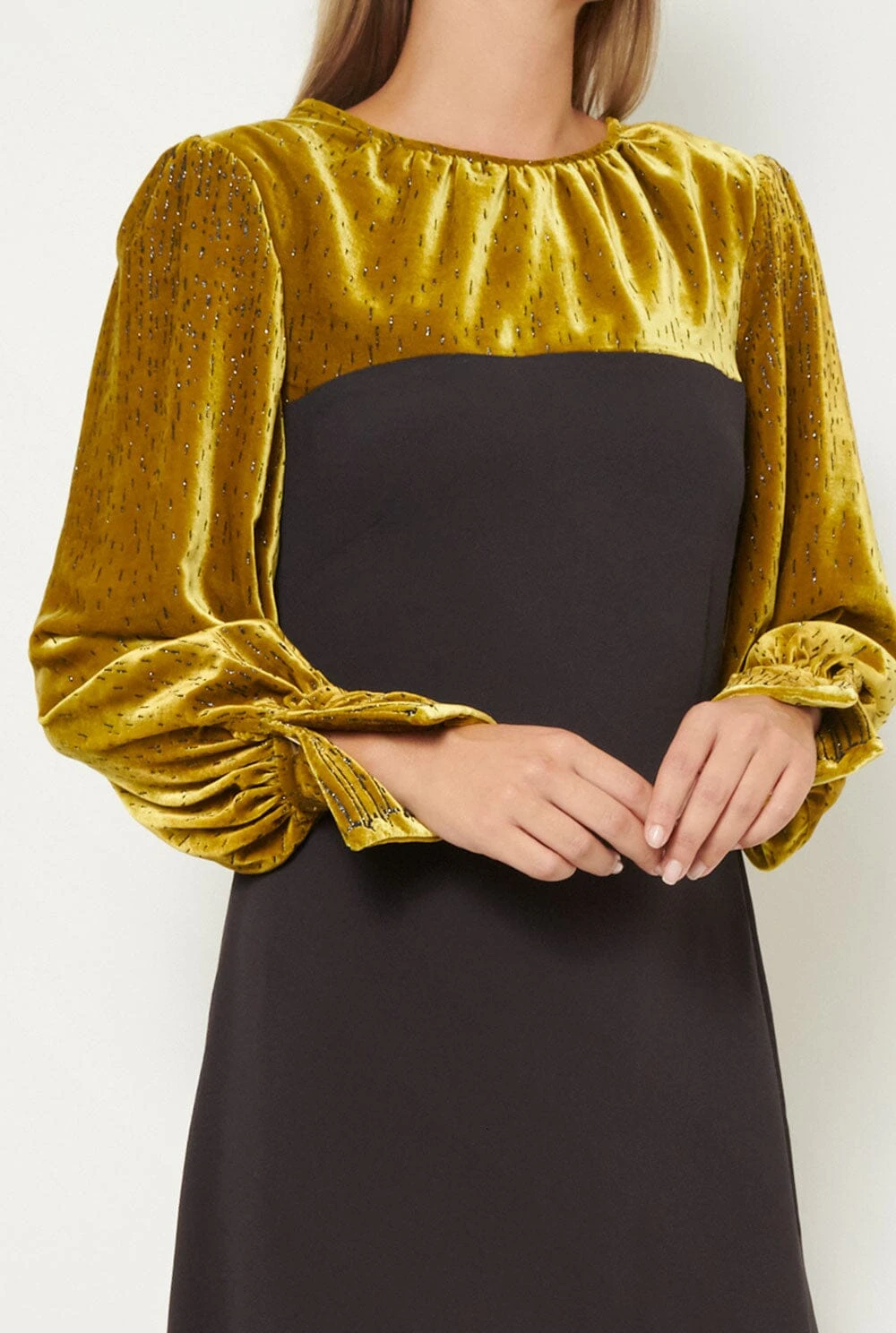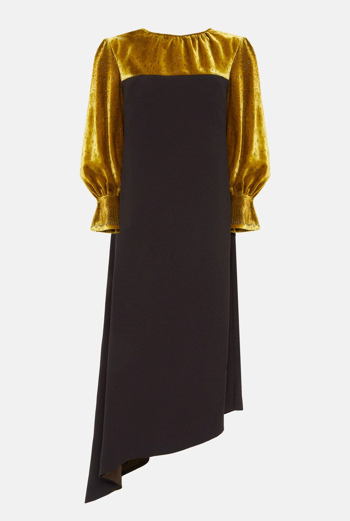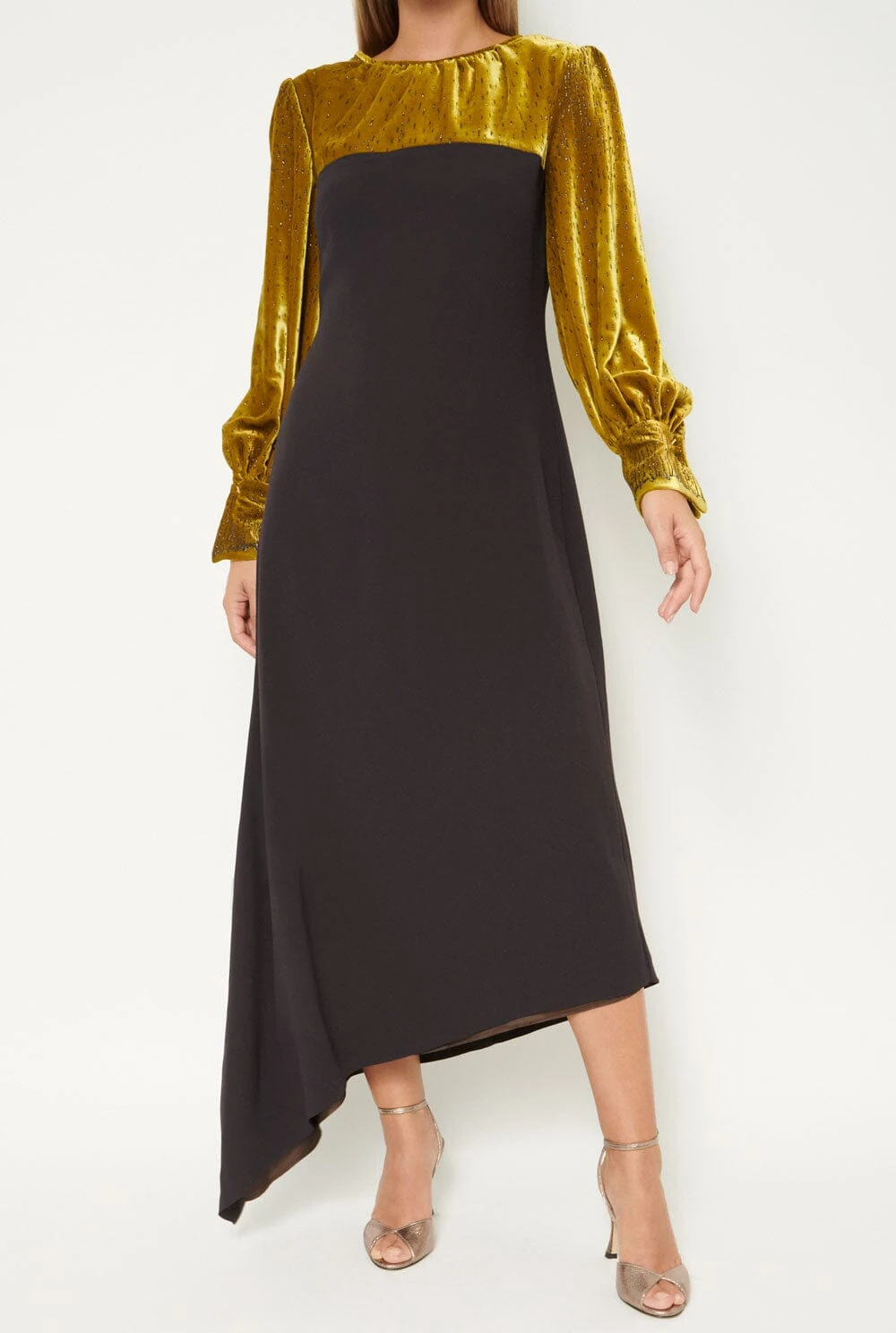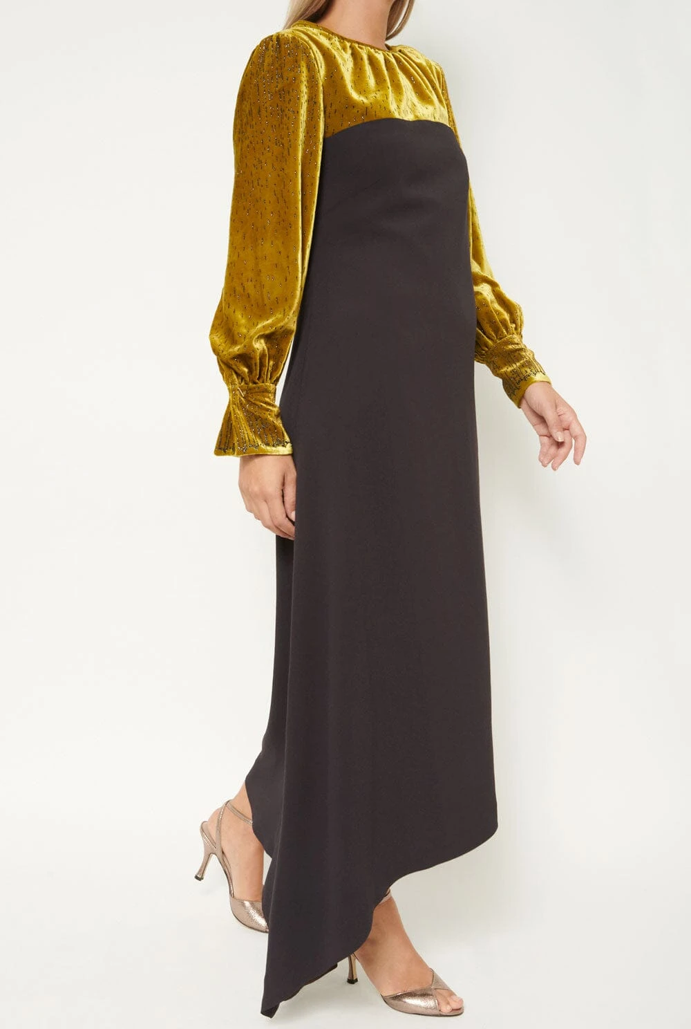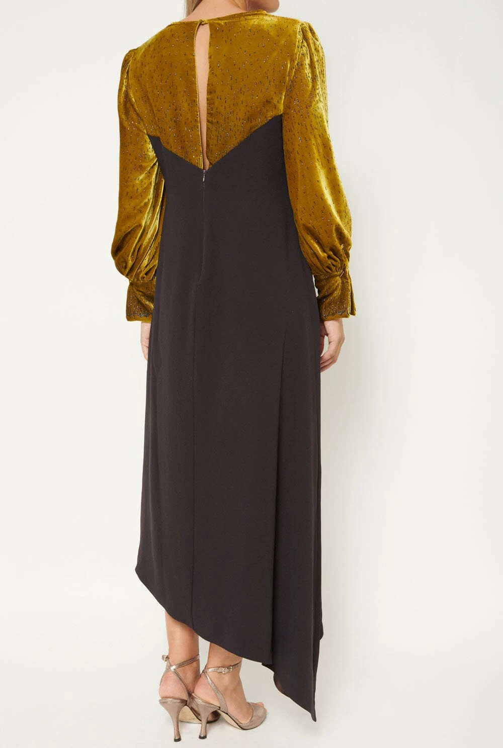 Miguel Marinero dress in dark brown crepe with embroidered velvet detail on the neckline and sleeves. Round neckline, asymmetric hem and sleeves with shirt cuffs. Sophisticated dress for guests and special occasions.