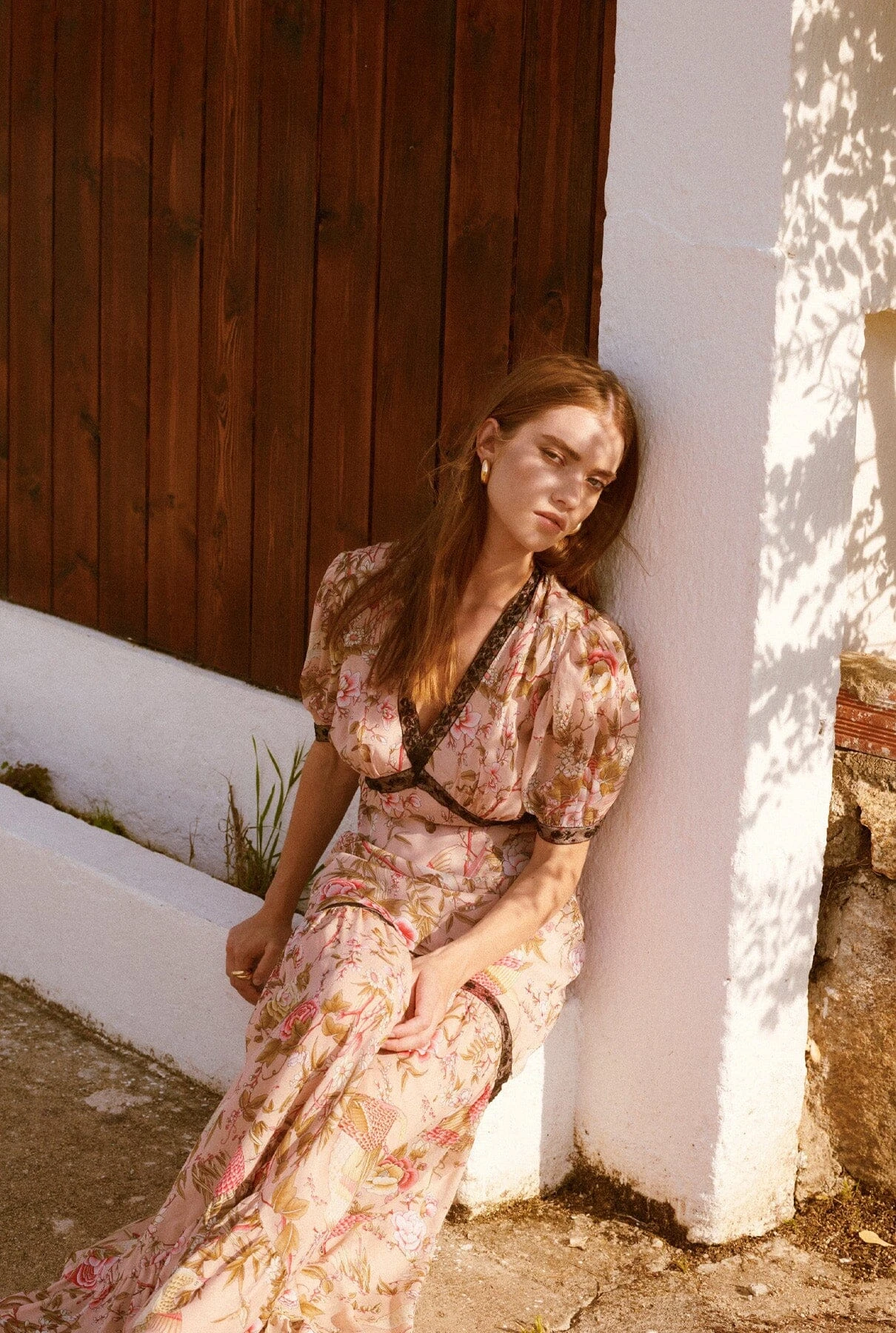 Immerse yourself in femininity with our lovely flowing dress, featuring a soft floral print on a powder pink hue. The short sleeves and black balencie lace trim on the scoop neckline, sleeves and center of the skirt add a touch of elegance. The final touch is provided by the ruffle hemline, creating a romantic and distinguished look for any special occasion.