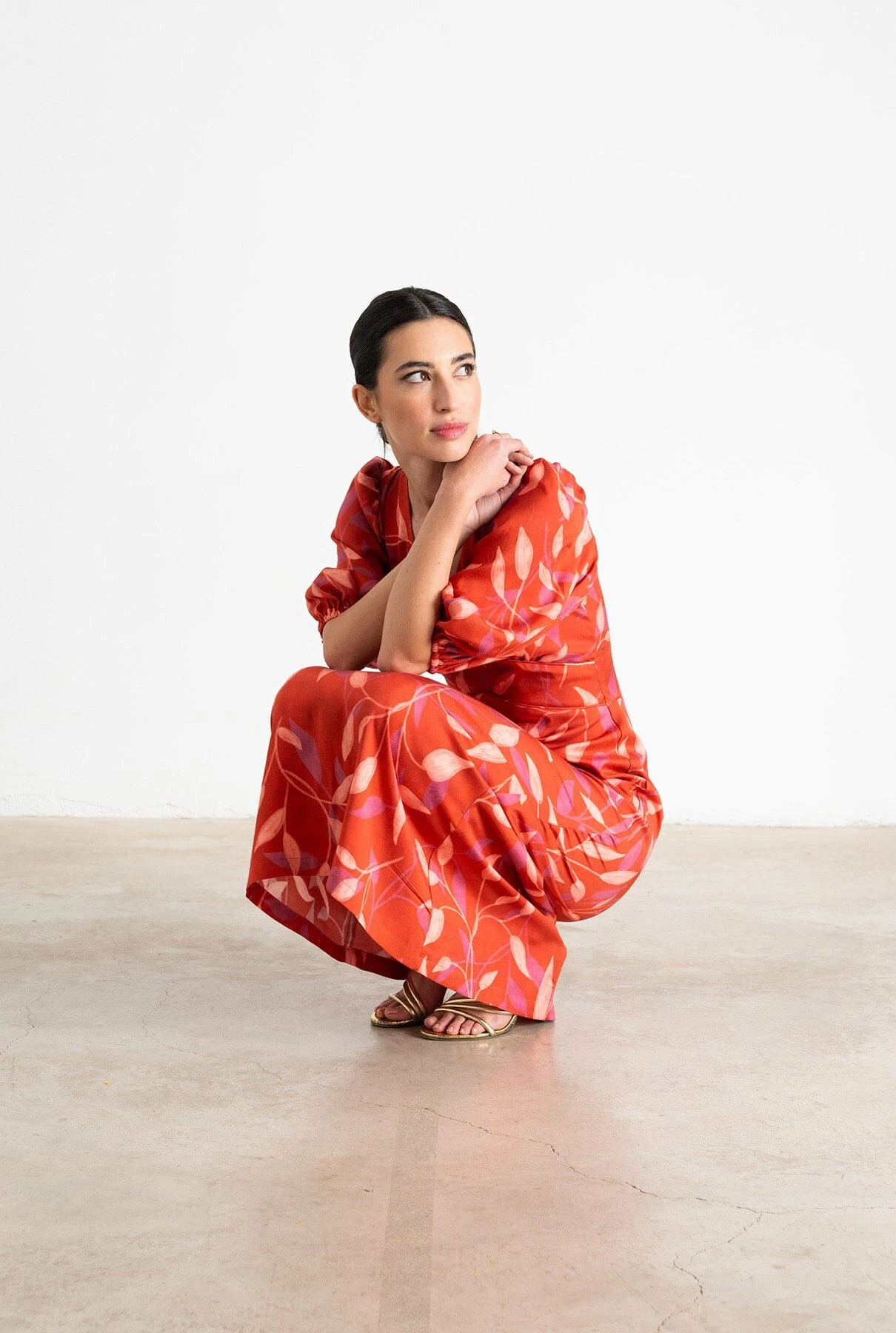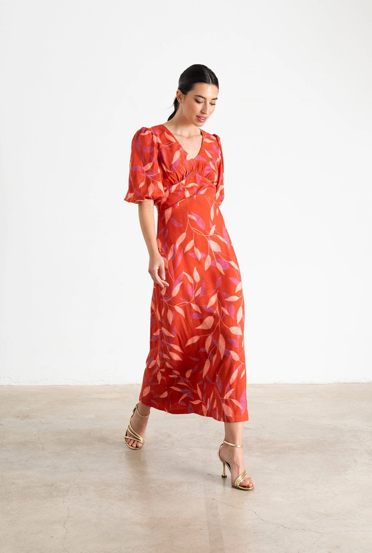 Midi dress in printed fabric in red and beige colours. V-neckline with cut-out under the chest. Midi sleeves with elastic at the end to adjust it to the desired size. Back fastening with invisible zip.