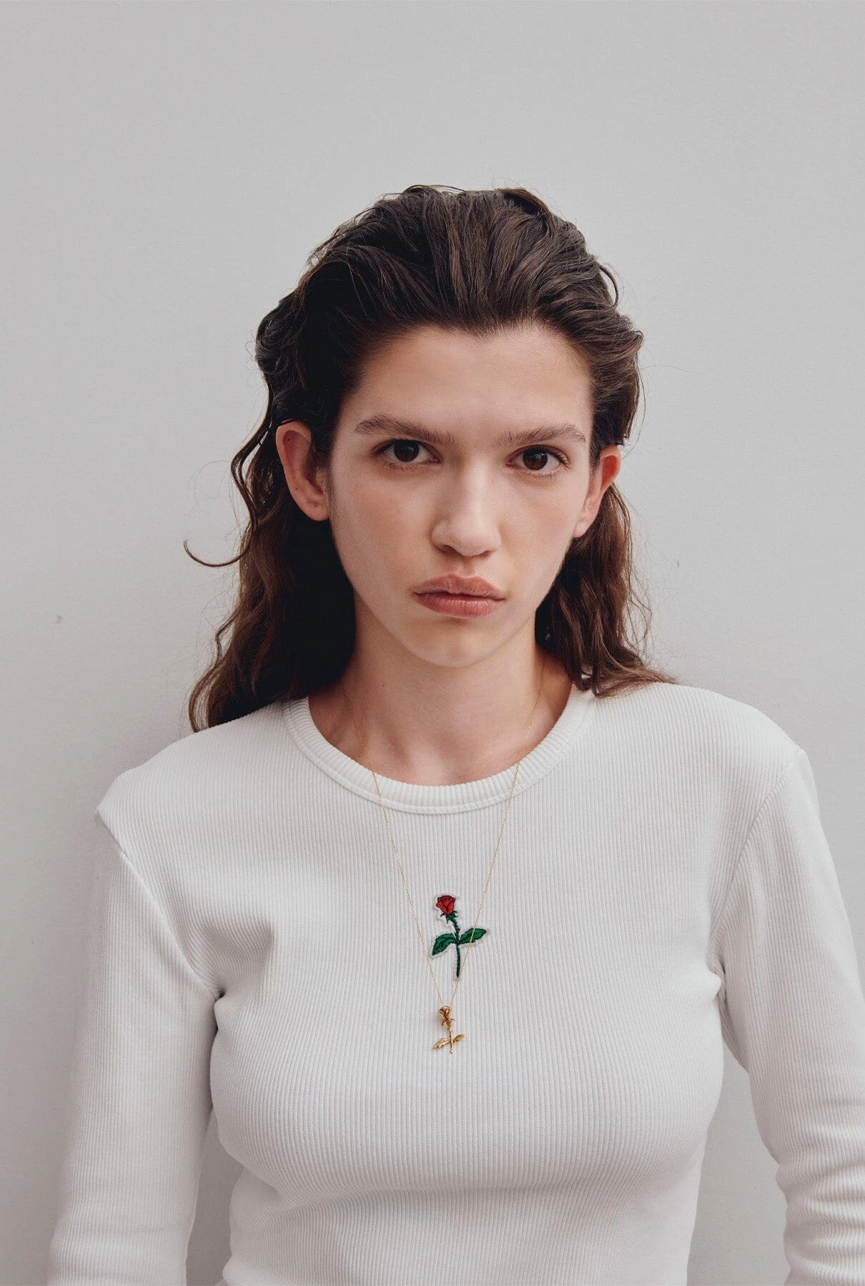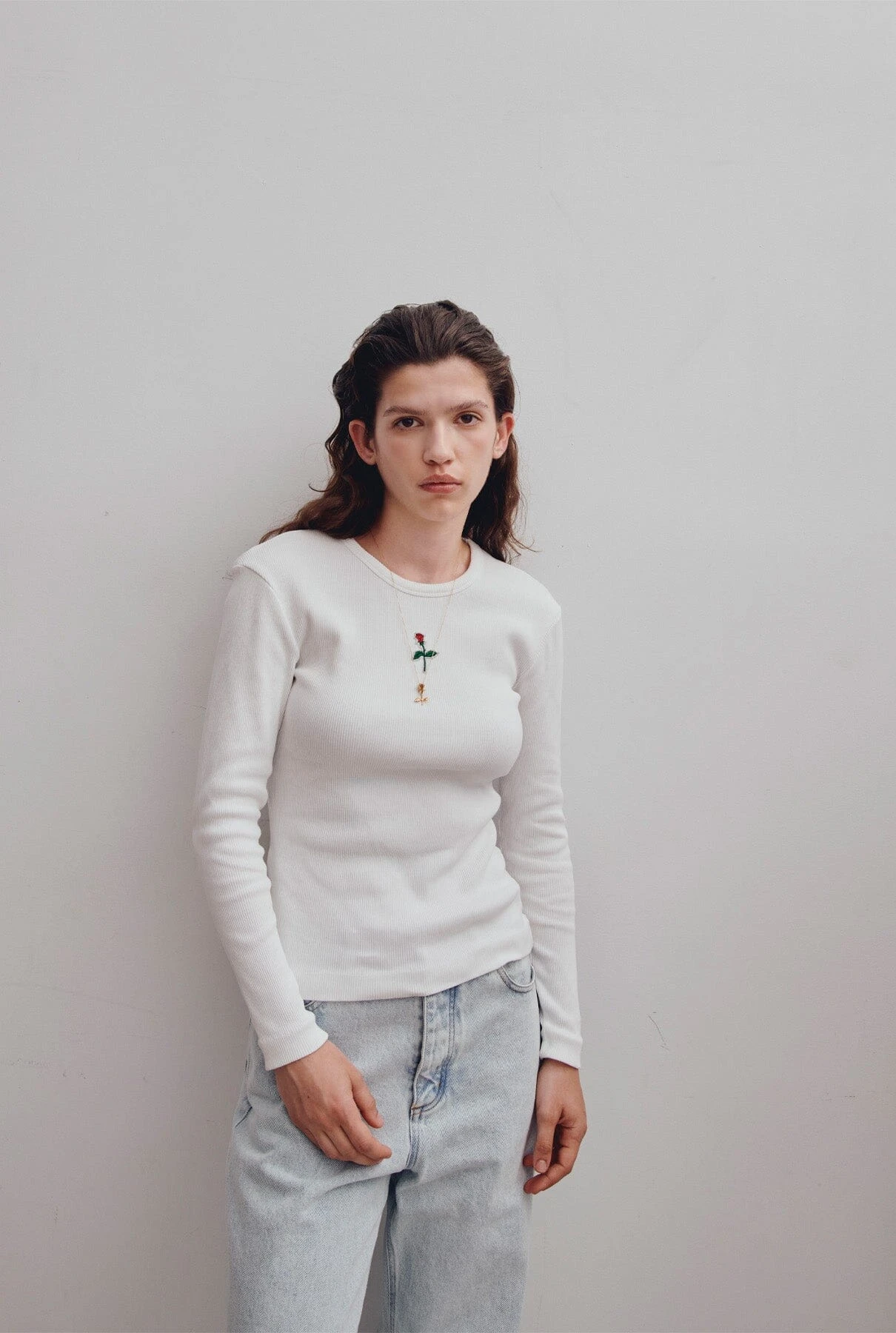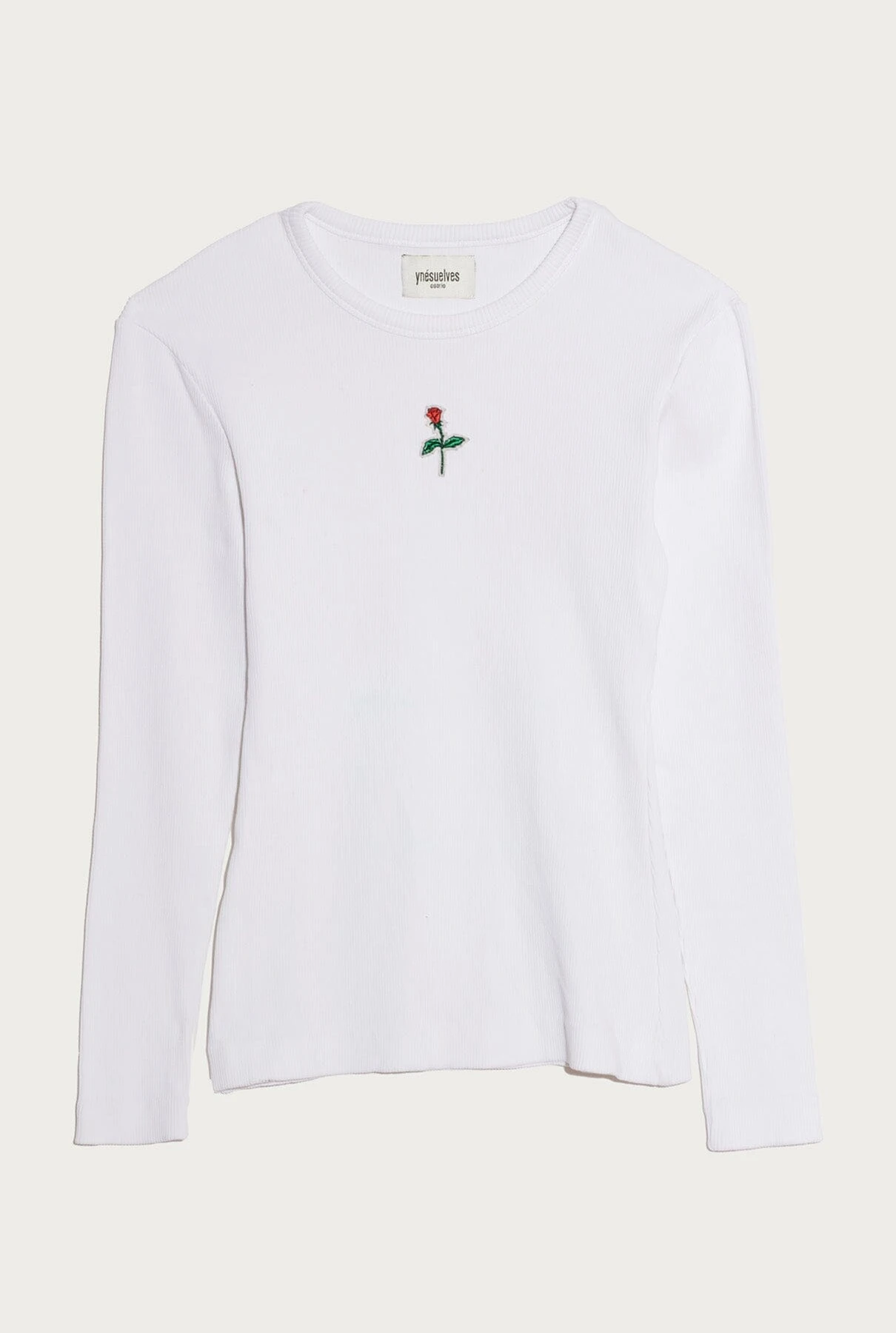 Yconic ribbed white long tee. Ynesuelves Rose logo patch embroidered on the front. Slim fit.
