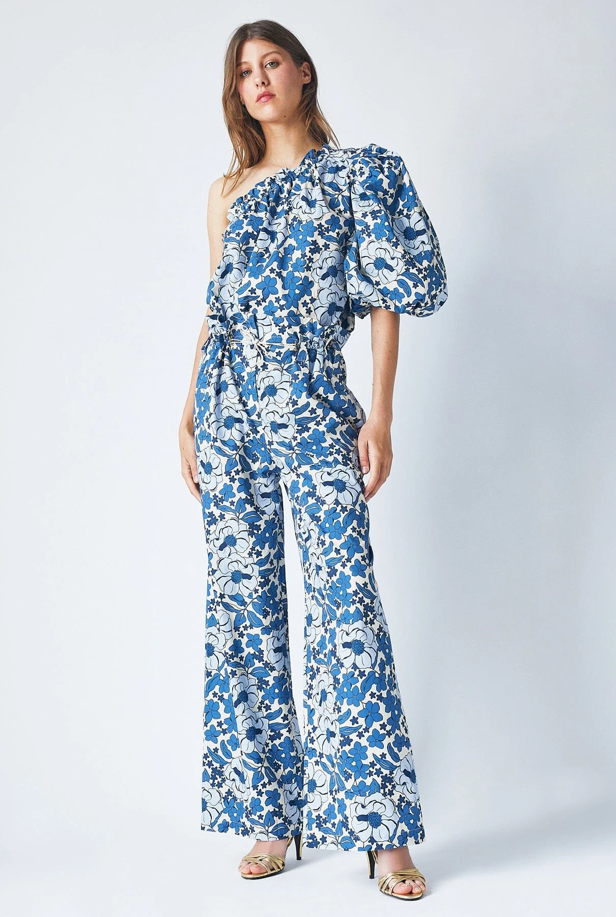 Sets are the ‘hit’ pieces of this season and part of our ‘most wanted’ items. These long wide pants come with an adjustable waist and in a blue blooming fabric.